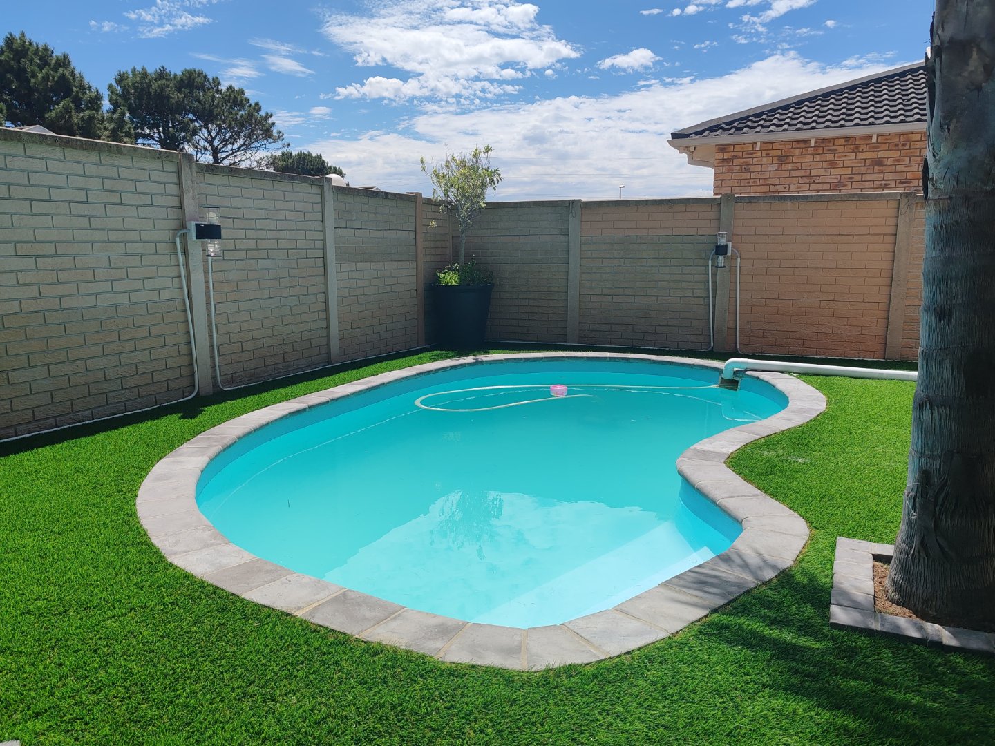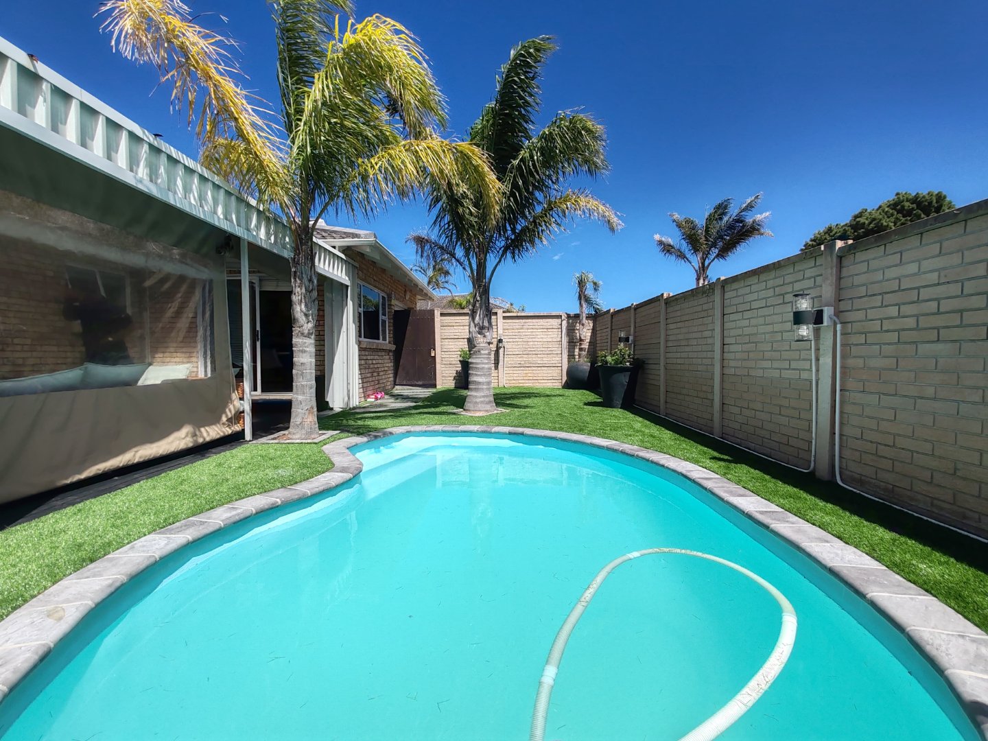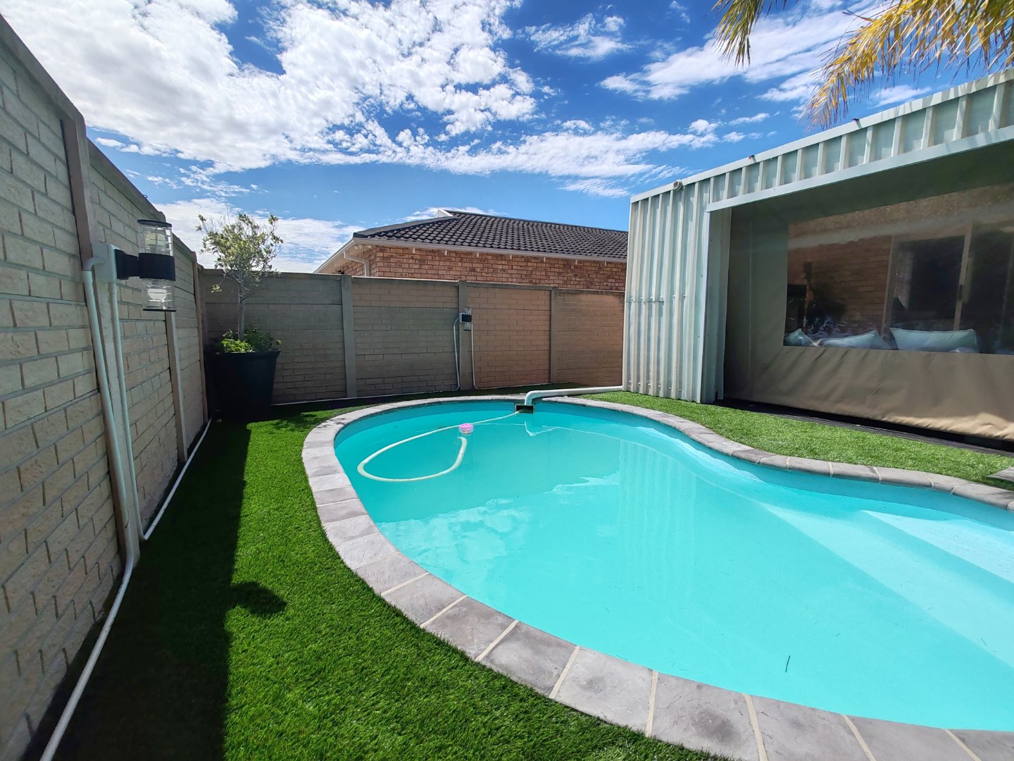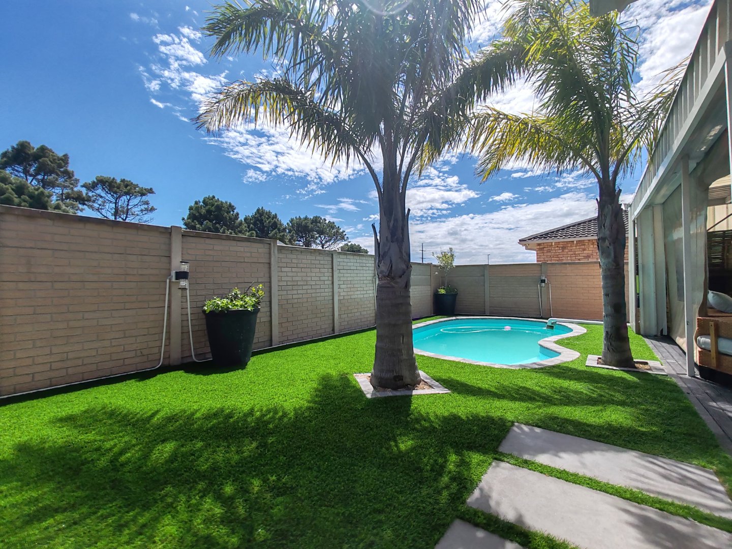 Inviting pool area with queen palms and brand new astro turf that has just been fitted, perfect size fibreglass pool to splash in on the hot summer days. Manageable manicured garden.