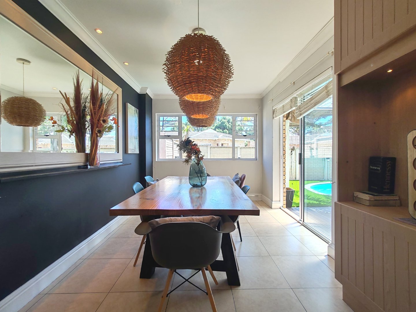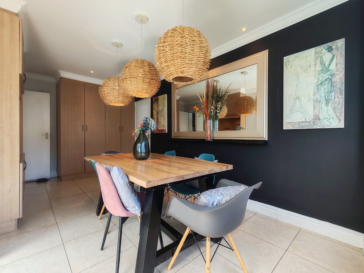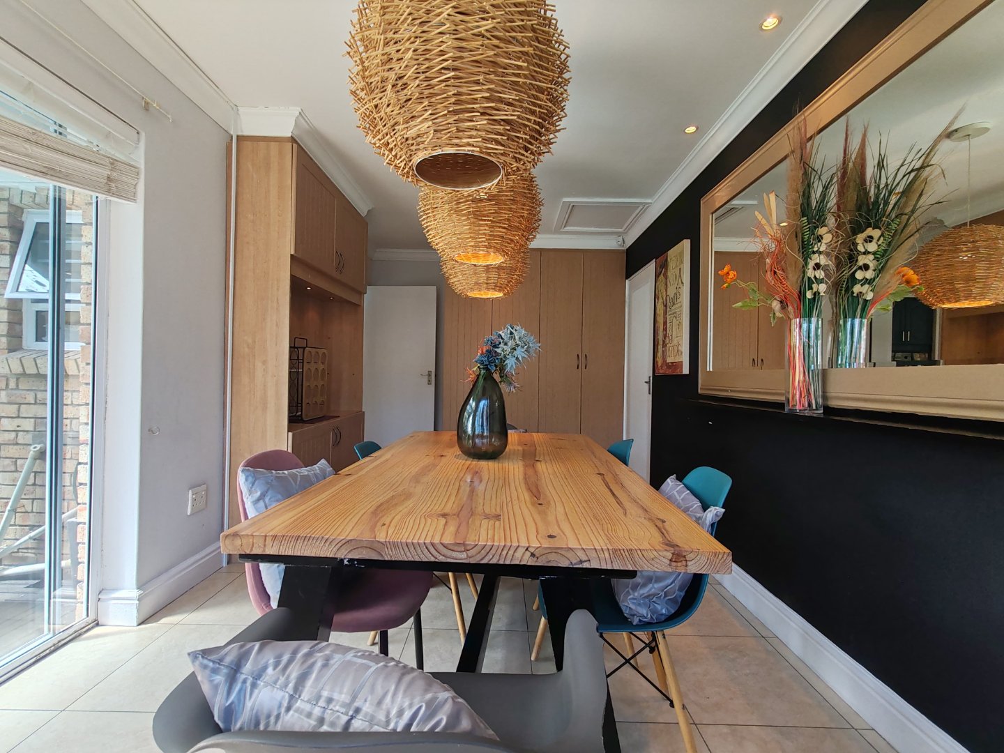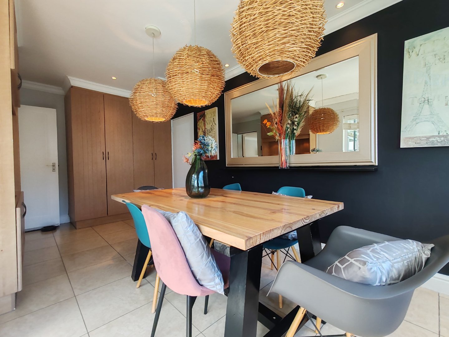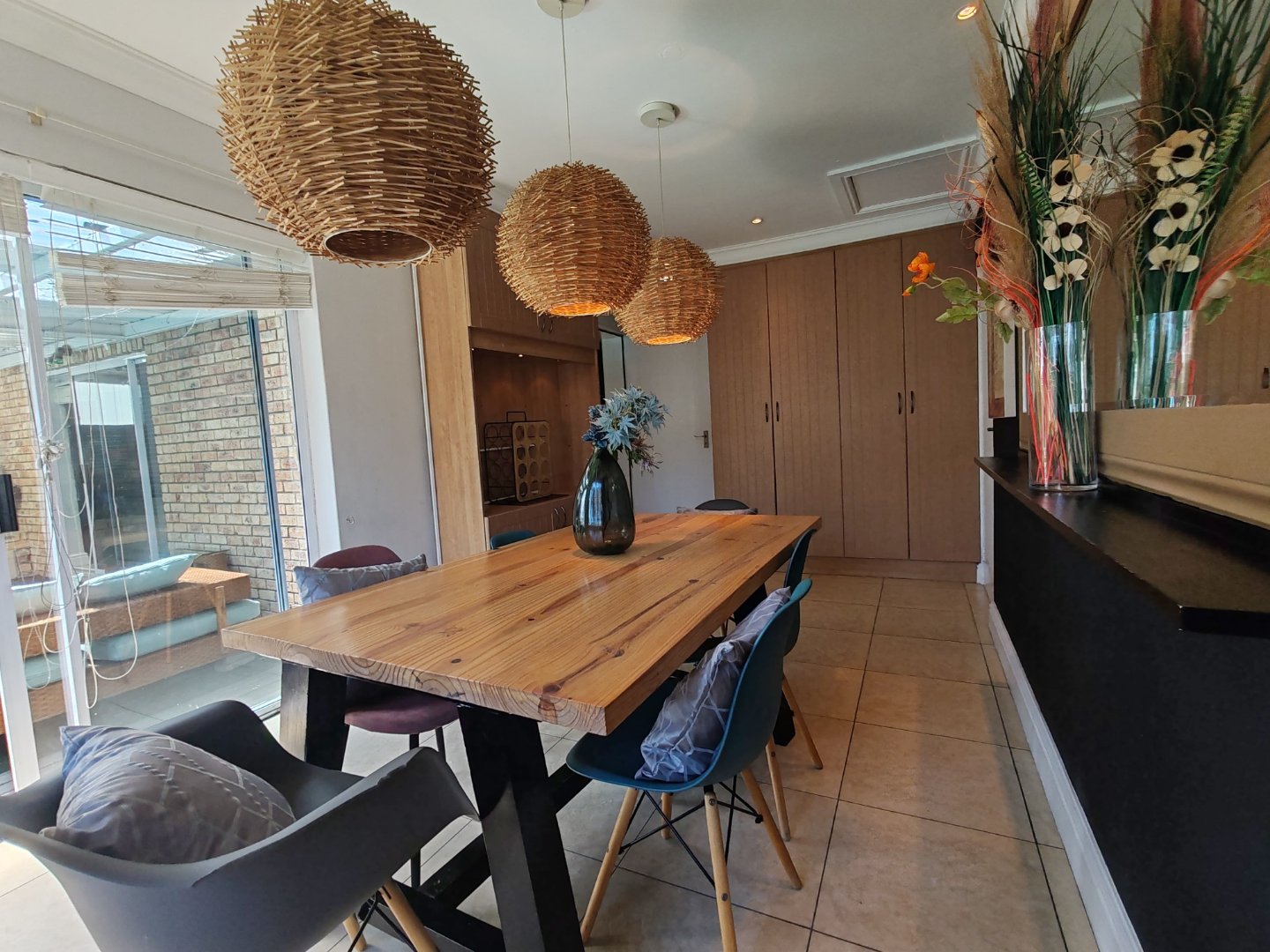 Dining room has built in cupboards, decorative basket lights to add to the ambiance. The sliding door also leads out to the braai and pool area.