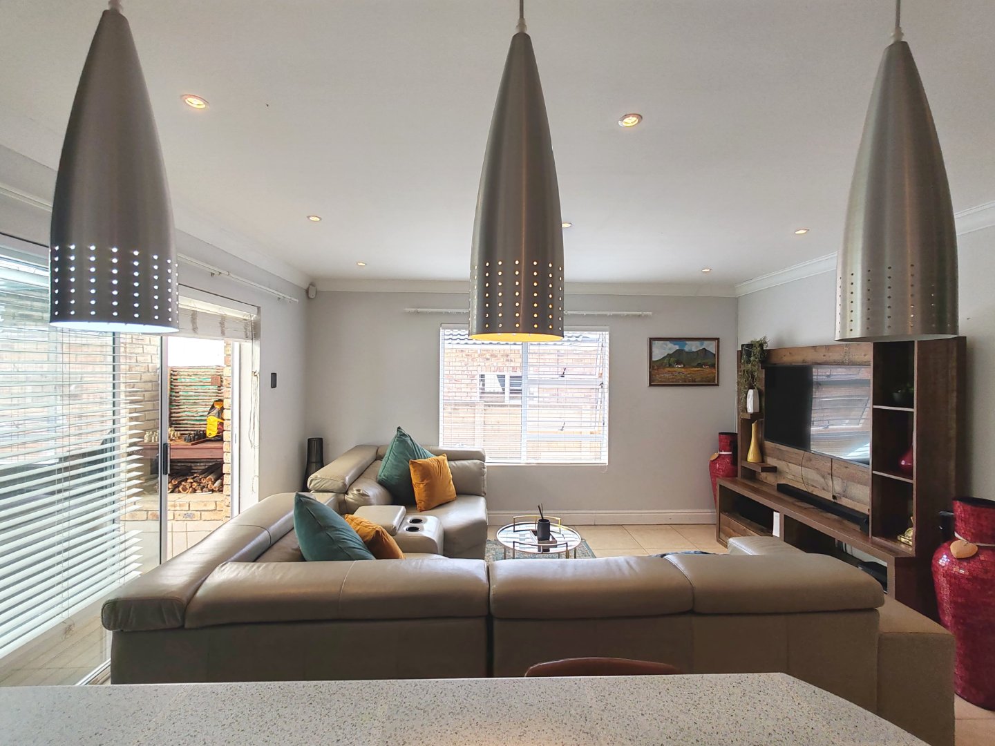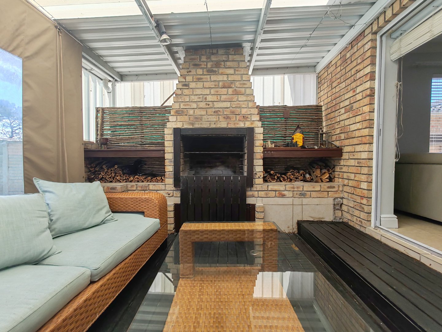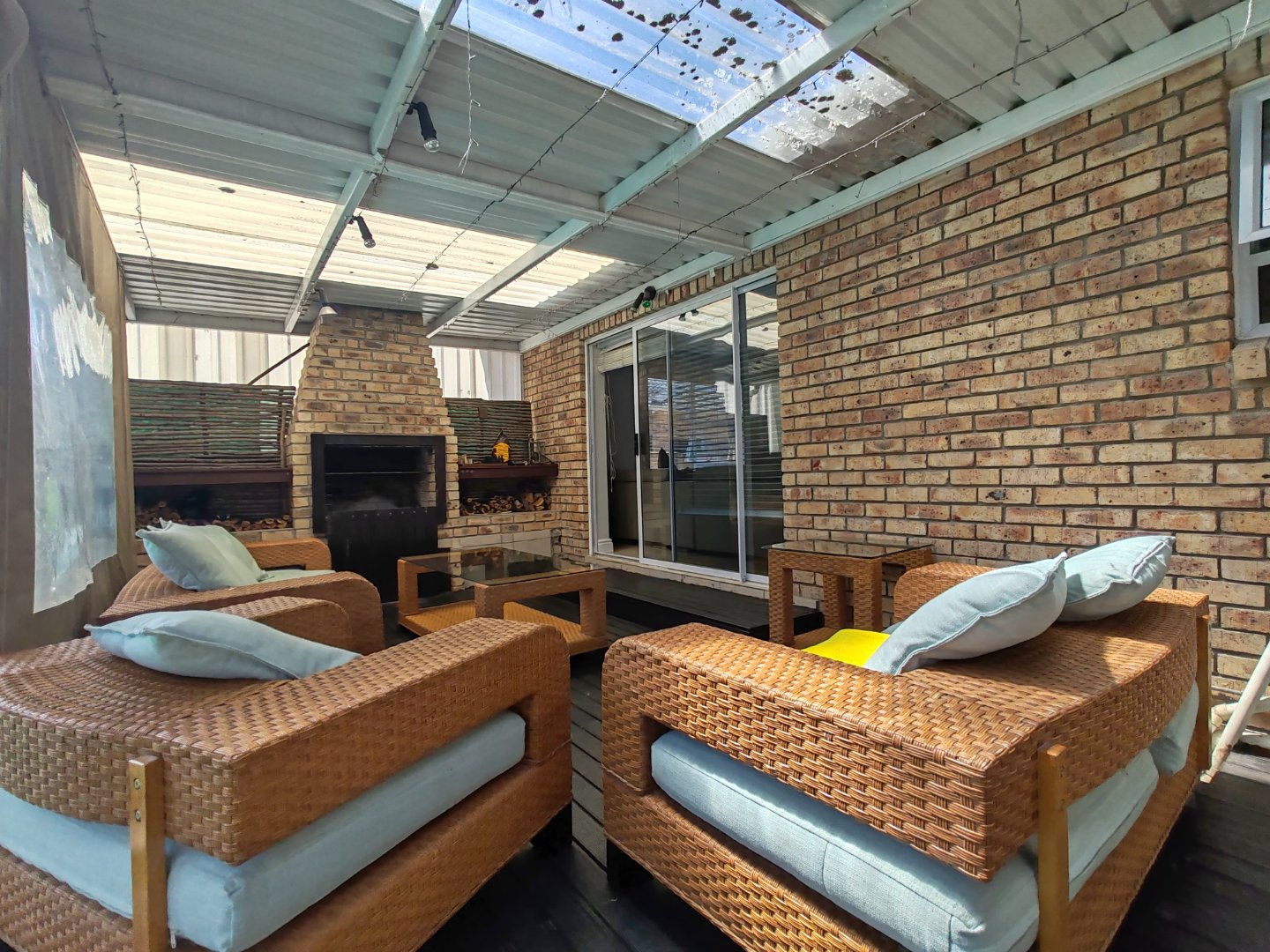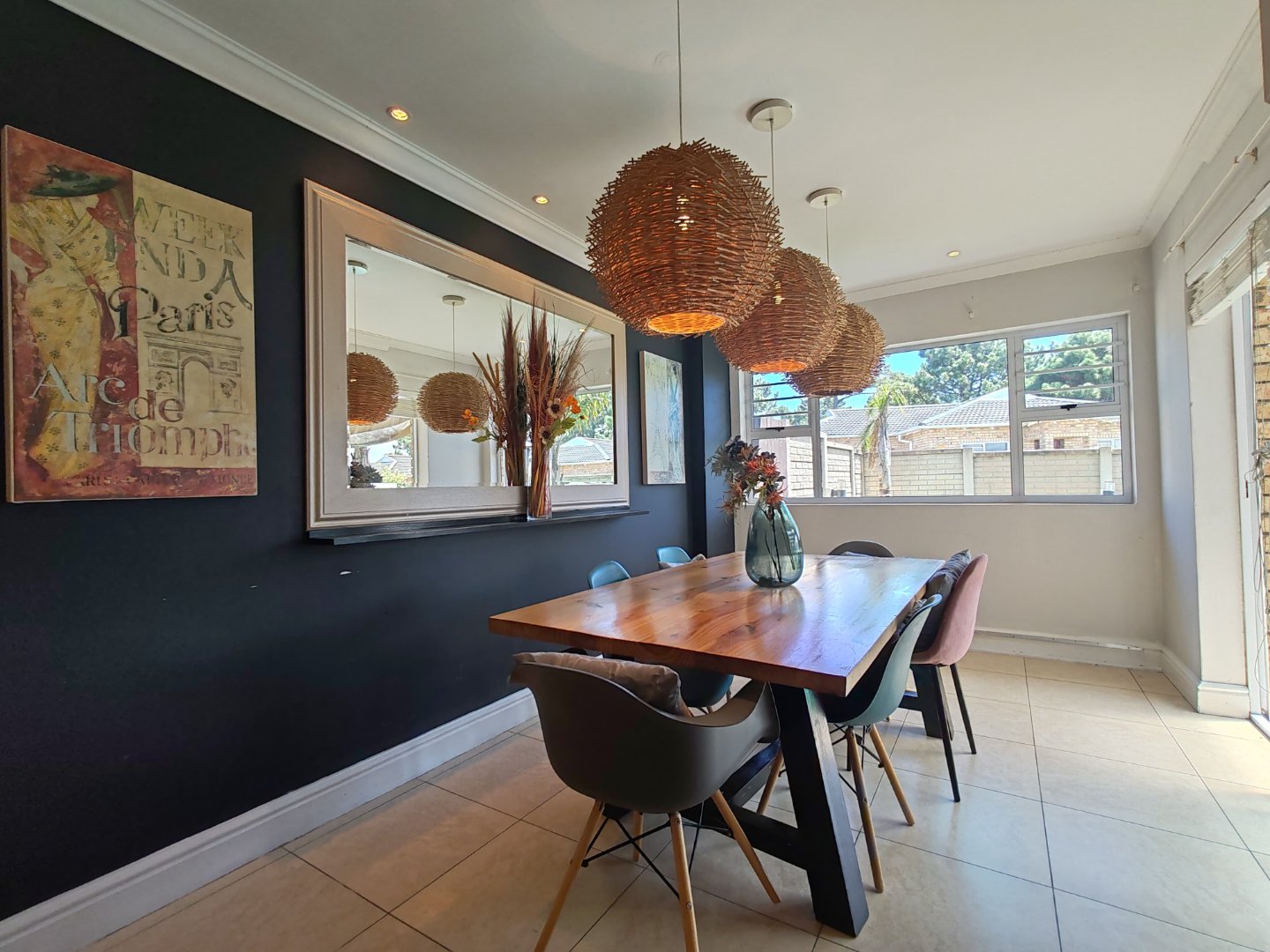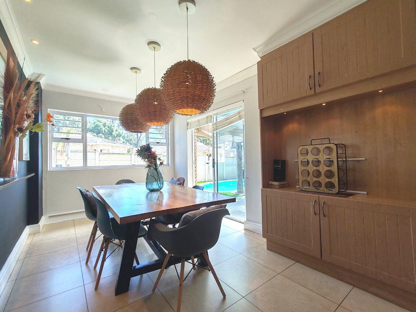 Dining room has built in cupboards, decorative basket lights to add to the ambiance. The sliding door also leads out to the braai and pool area.