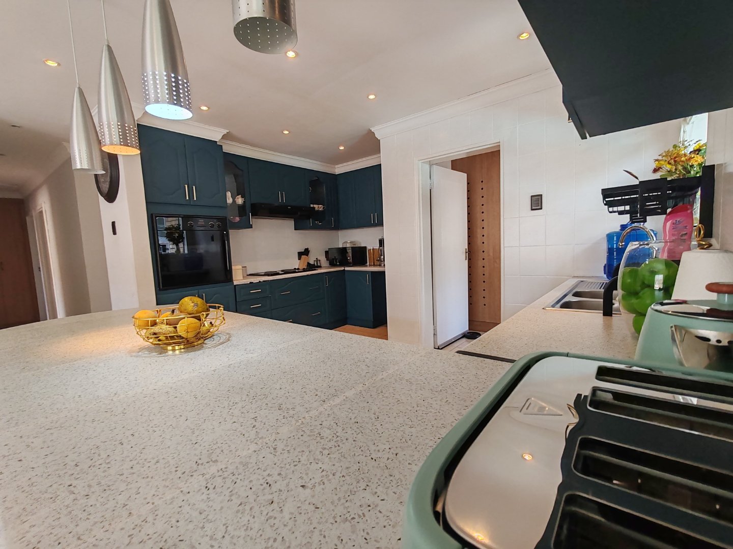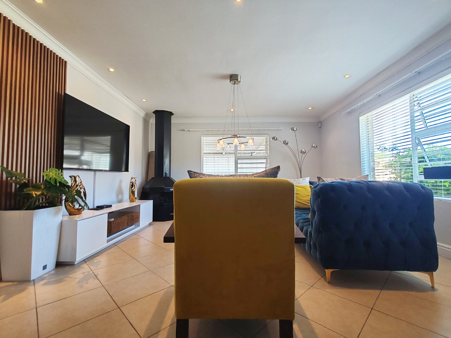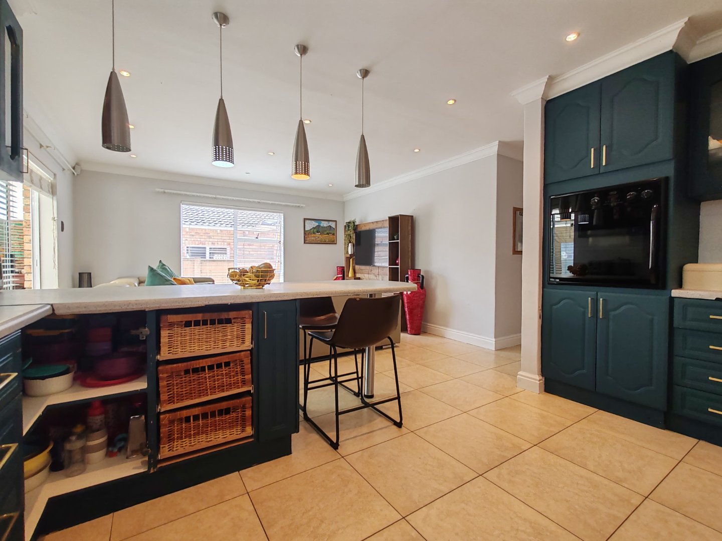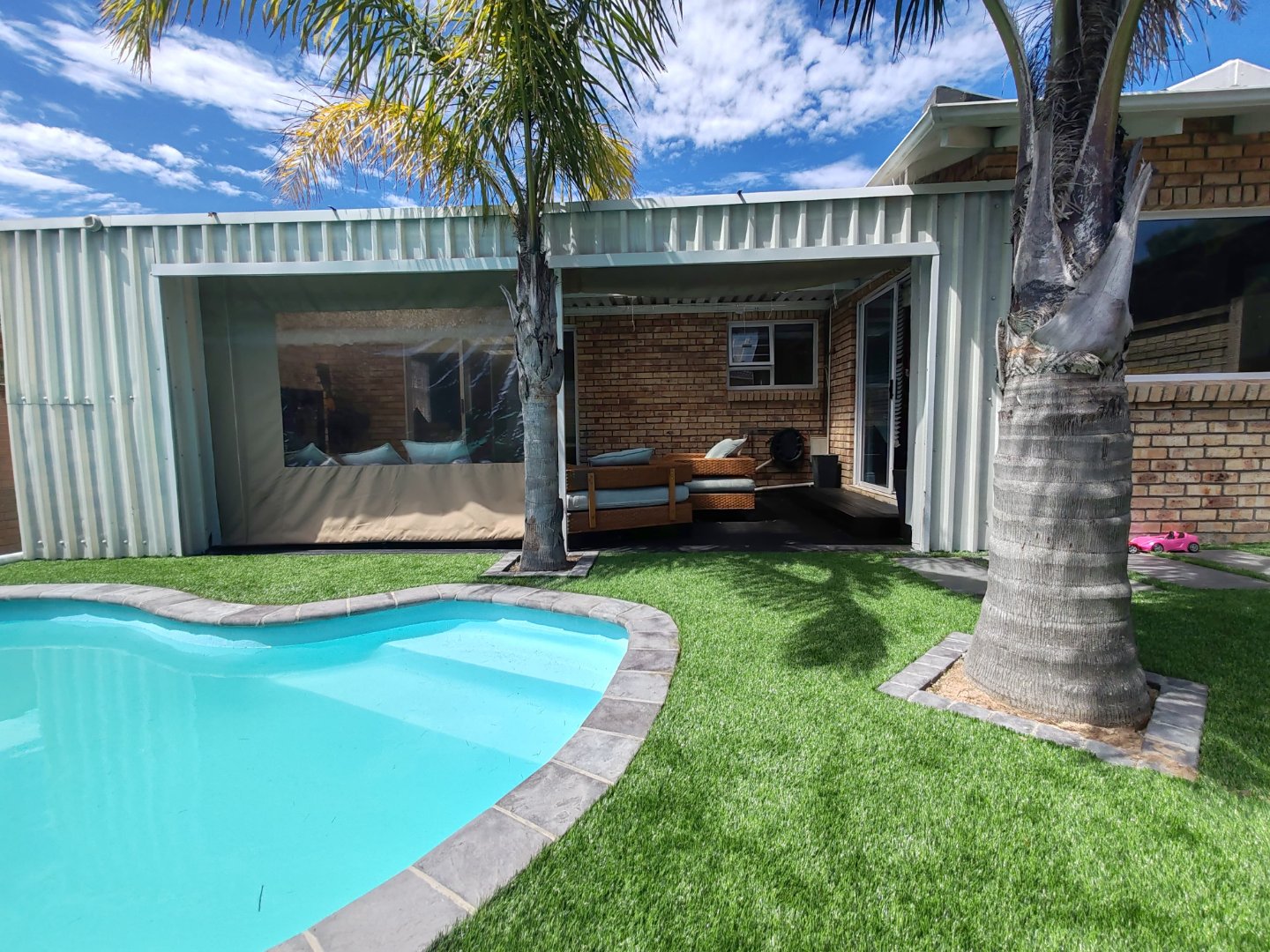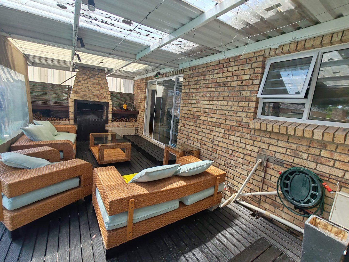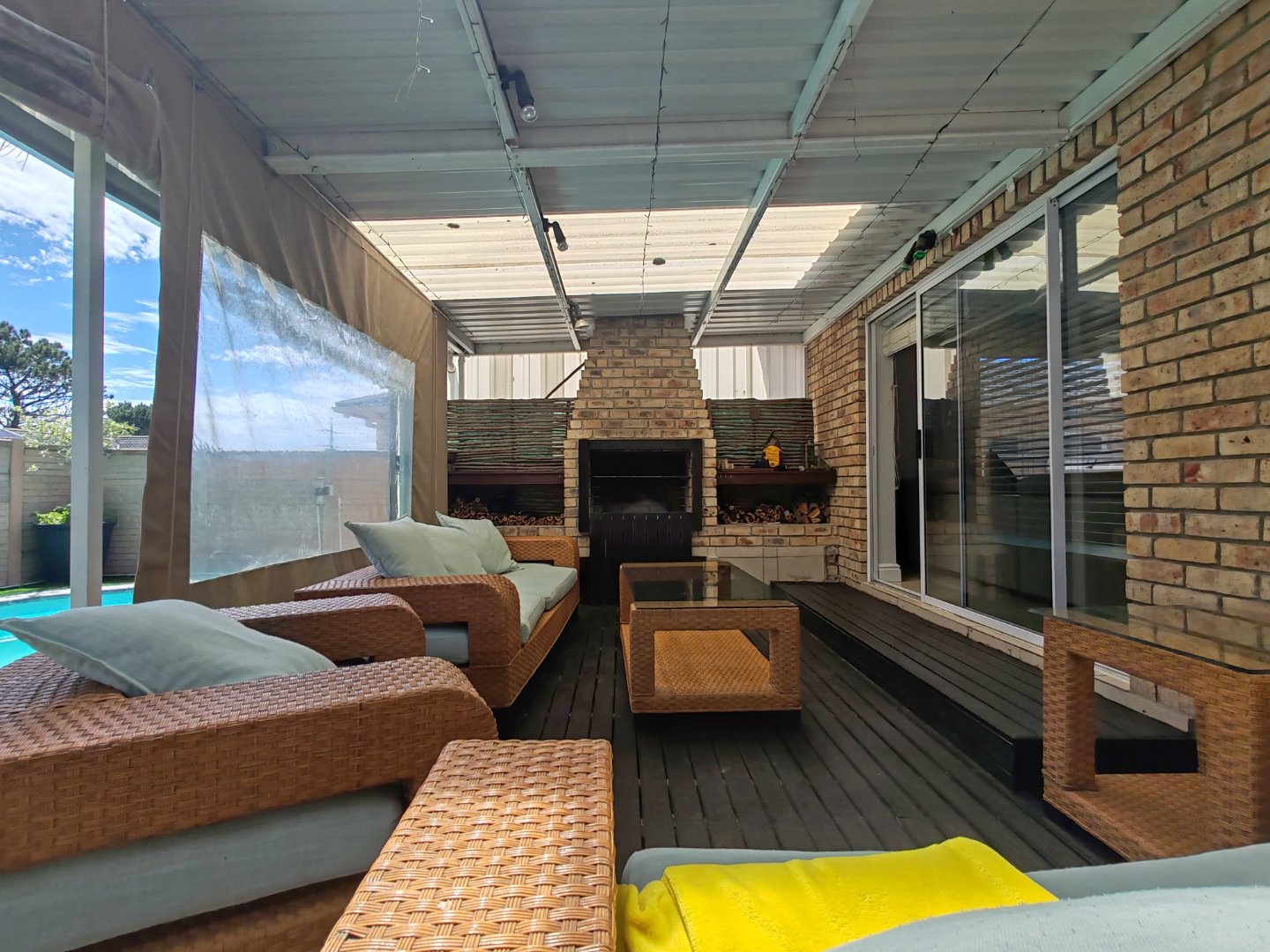 Dining room has built in cupboards, decorative basket lights to add to the ambiance. The sliding door also leads out to the braai and pool area.