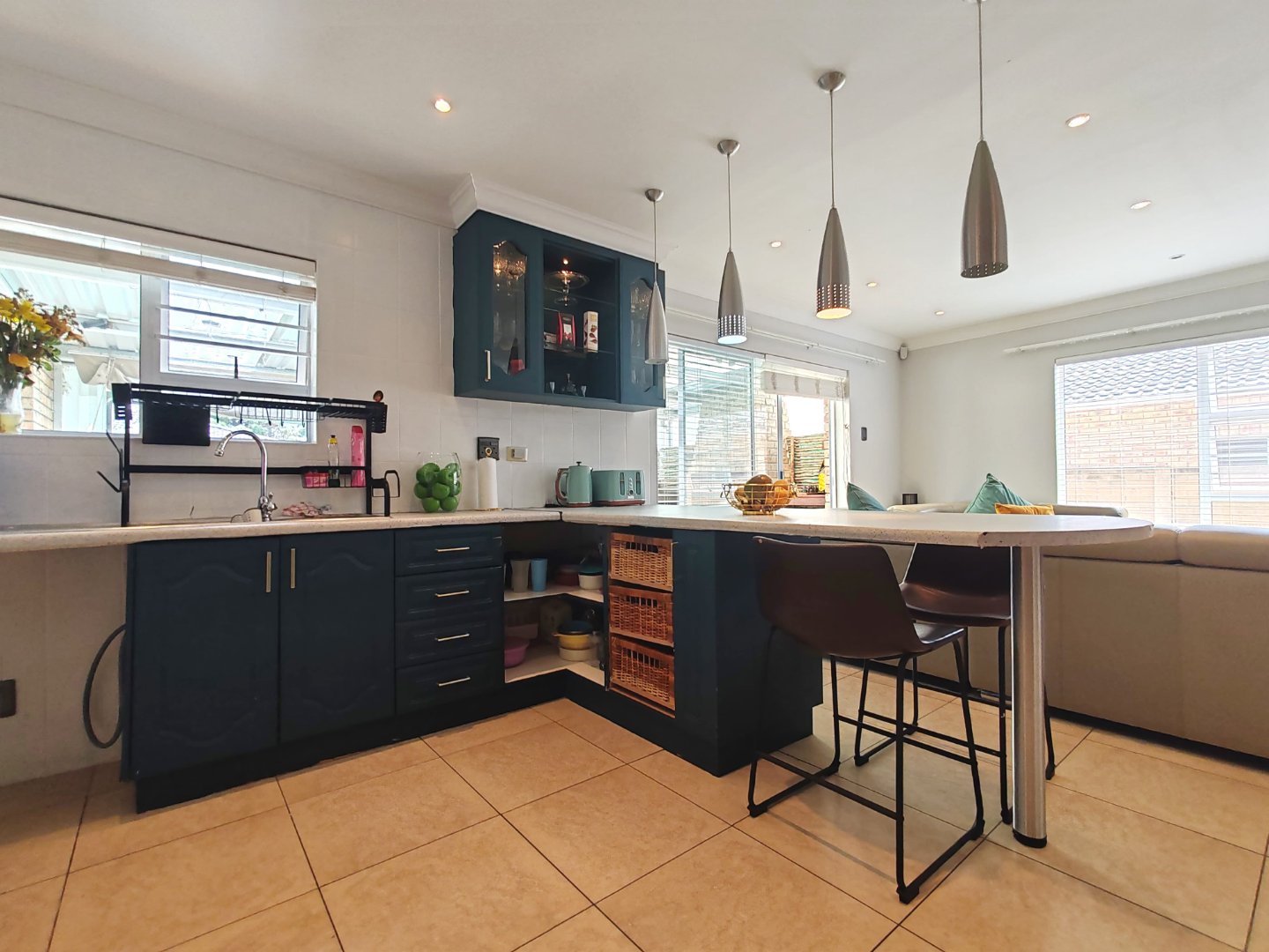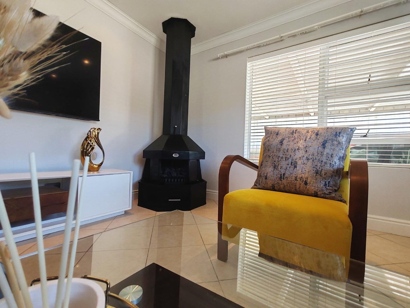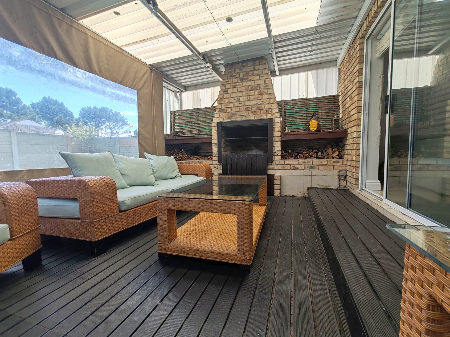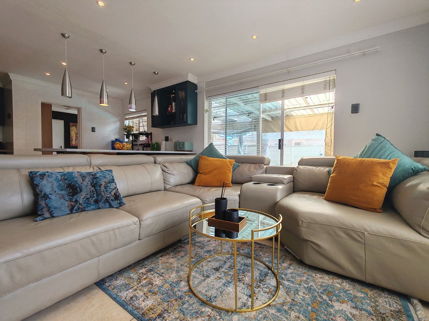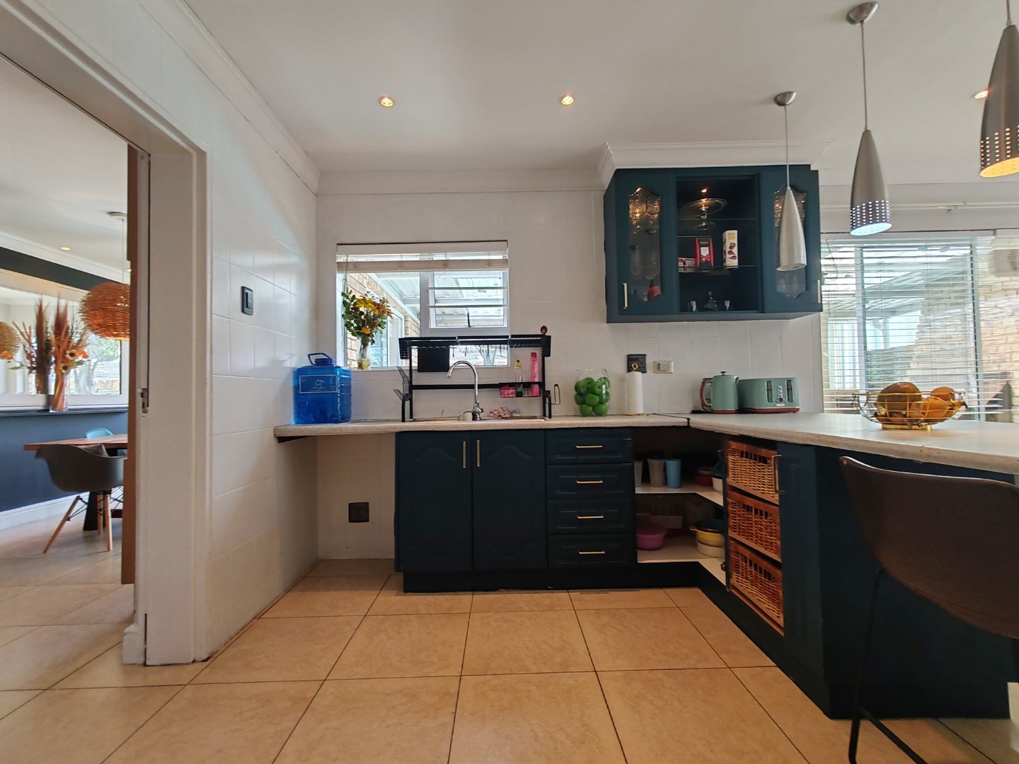 Dining room has built in cupboards, decorative basket lights to add to the ambiance. The sliding door also leads out to the braai and pool area.