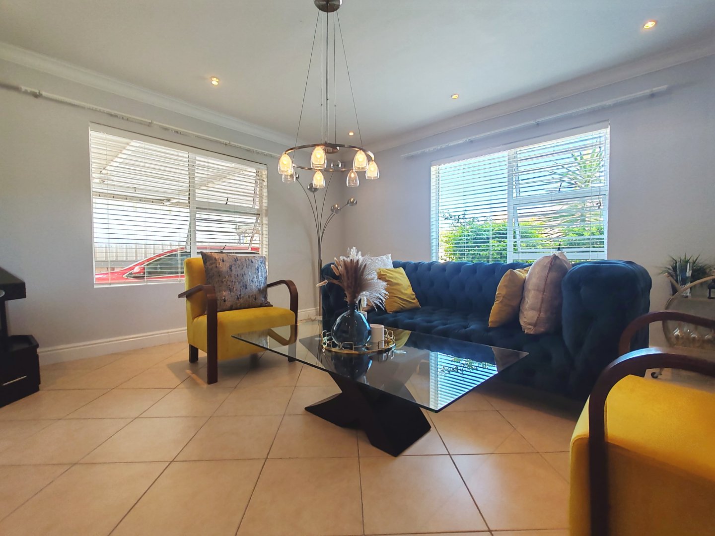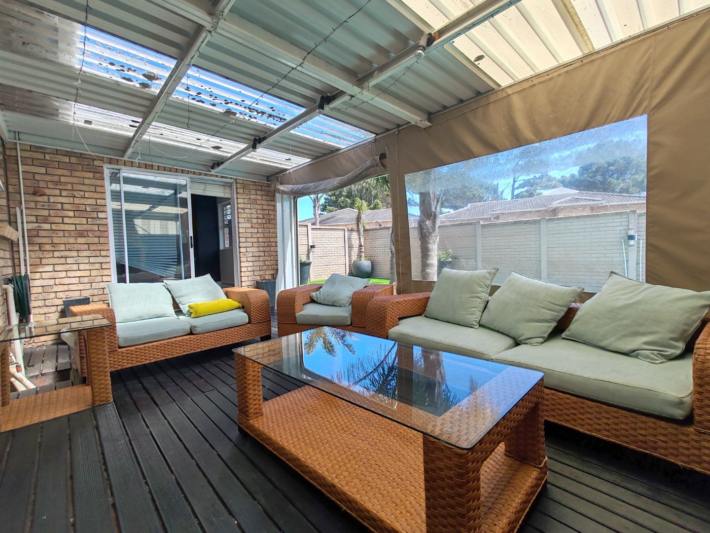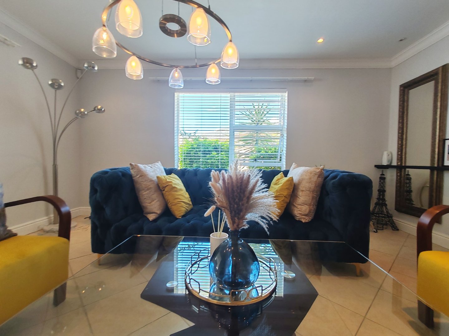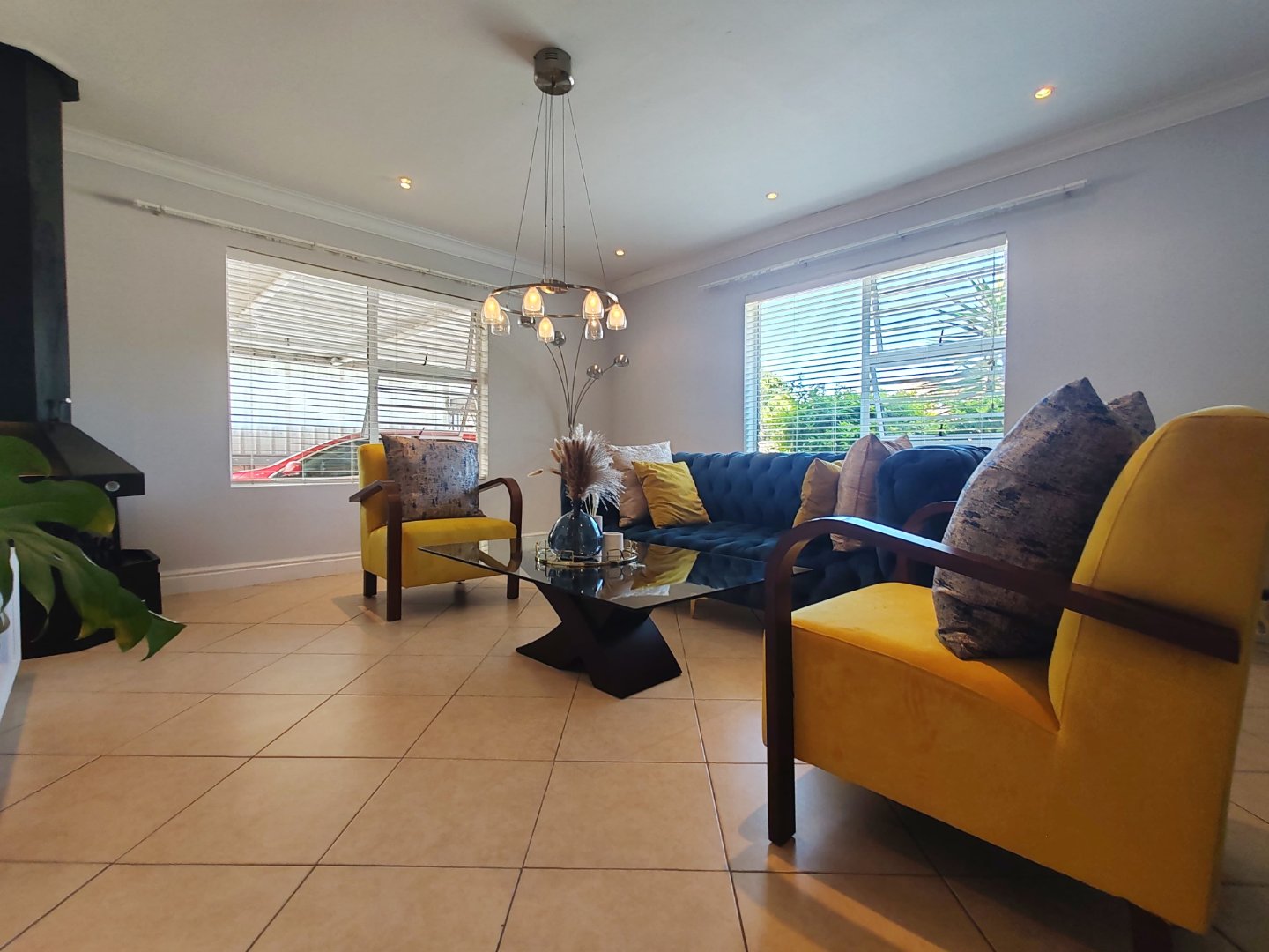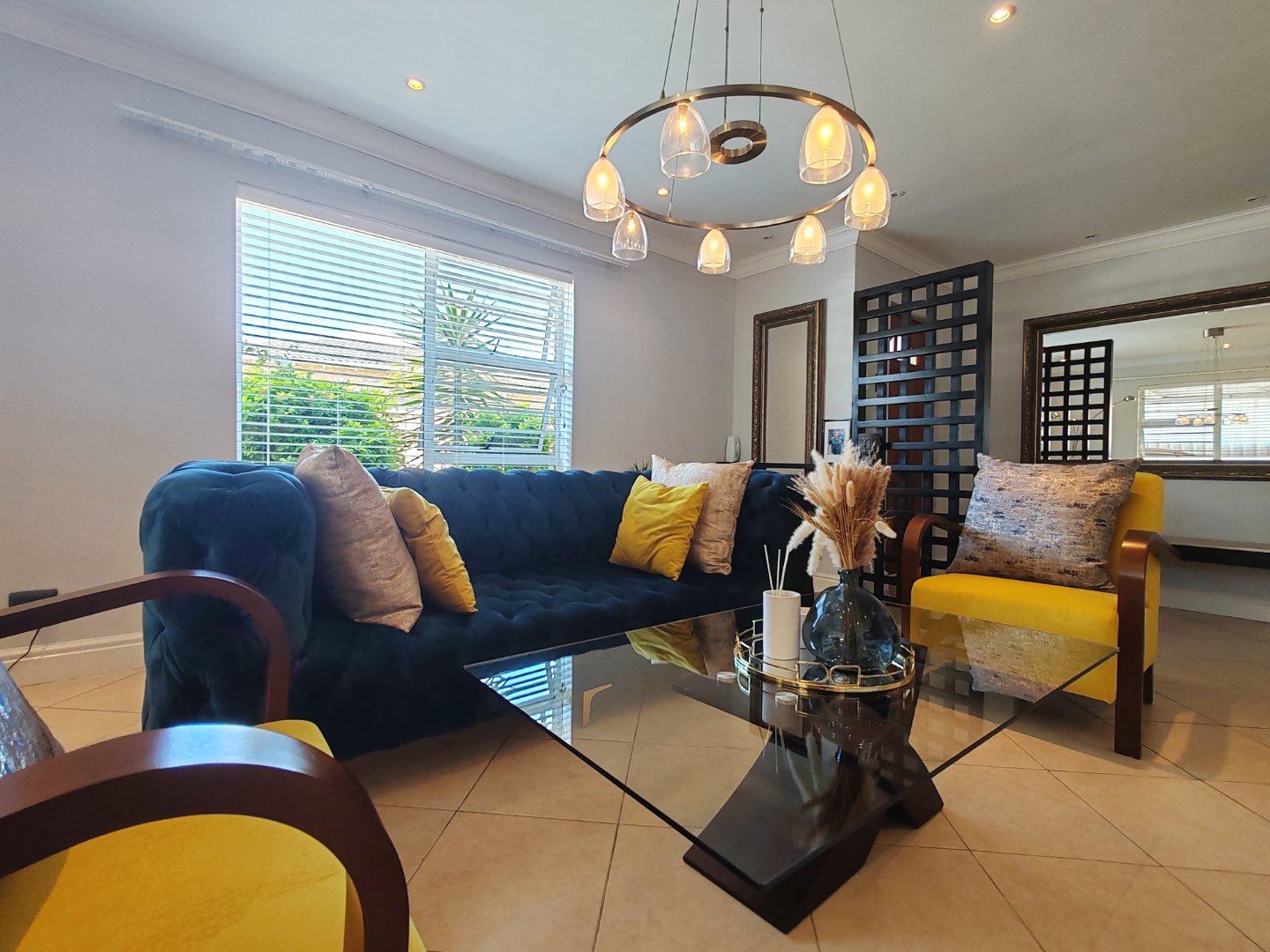 Dining room has built in cupboards, decorative basket lights to add to the ambiance. The sliding door also leads out to the braai and pool area.