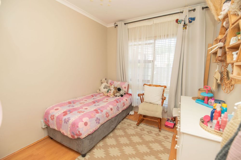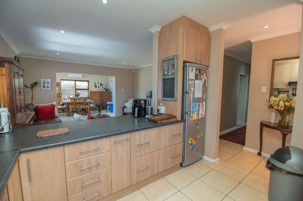 Step inside to a spacious open-plan layout where the kitchen, lounge, and dining area flow seamlessly together, creating an inviting atmosphere for everyday living and entertaining. The large lounge and adjoining dining room, complete with air conditioning, offer flexible options and can easily be converted into an indoor braai area or entertainment space. The modern kitchen is a standout feature, offering plenty of built-in cupboards, a gas hob with undercounter oven, and a built-in fridge compartment for added convenience.