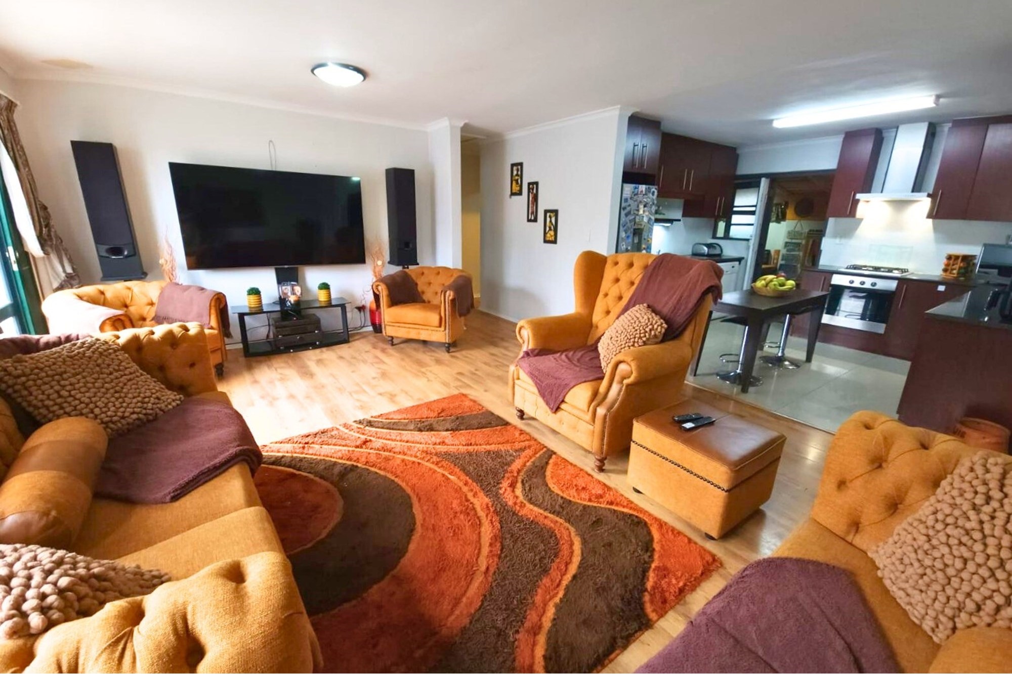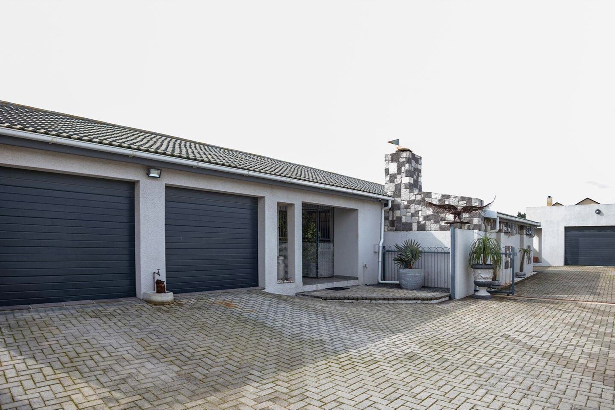 The main home welcomes you with an inviting sense of space, boasting three well-appointed bedrooms with built-in cupboards and laminate flooring. The master suite features its own en-suite bathroom, while the remaining two bedrooms share a stylish family bathroom complete with both shower and bathtub. At the heart of the home lies a contemporary open-plan kitchen, fitted with a gas burner, oven, extractor fan, and ample cabinetry, seamlessly flowing into warm, light-filled living areas. A cozy fireplace ensures comfort on winter nights, while the built-in braai in the entertainment space makes gatherings unforgettable. Outdoors, a heated swimming pool invites year-round enjoyment, complemented by a double garage and separate laundry for added convenience.