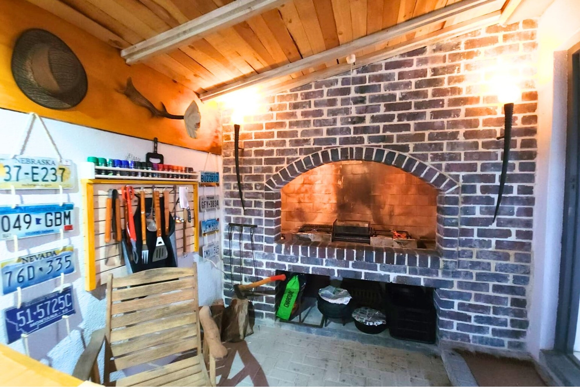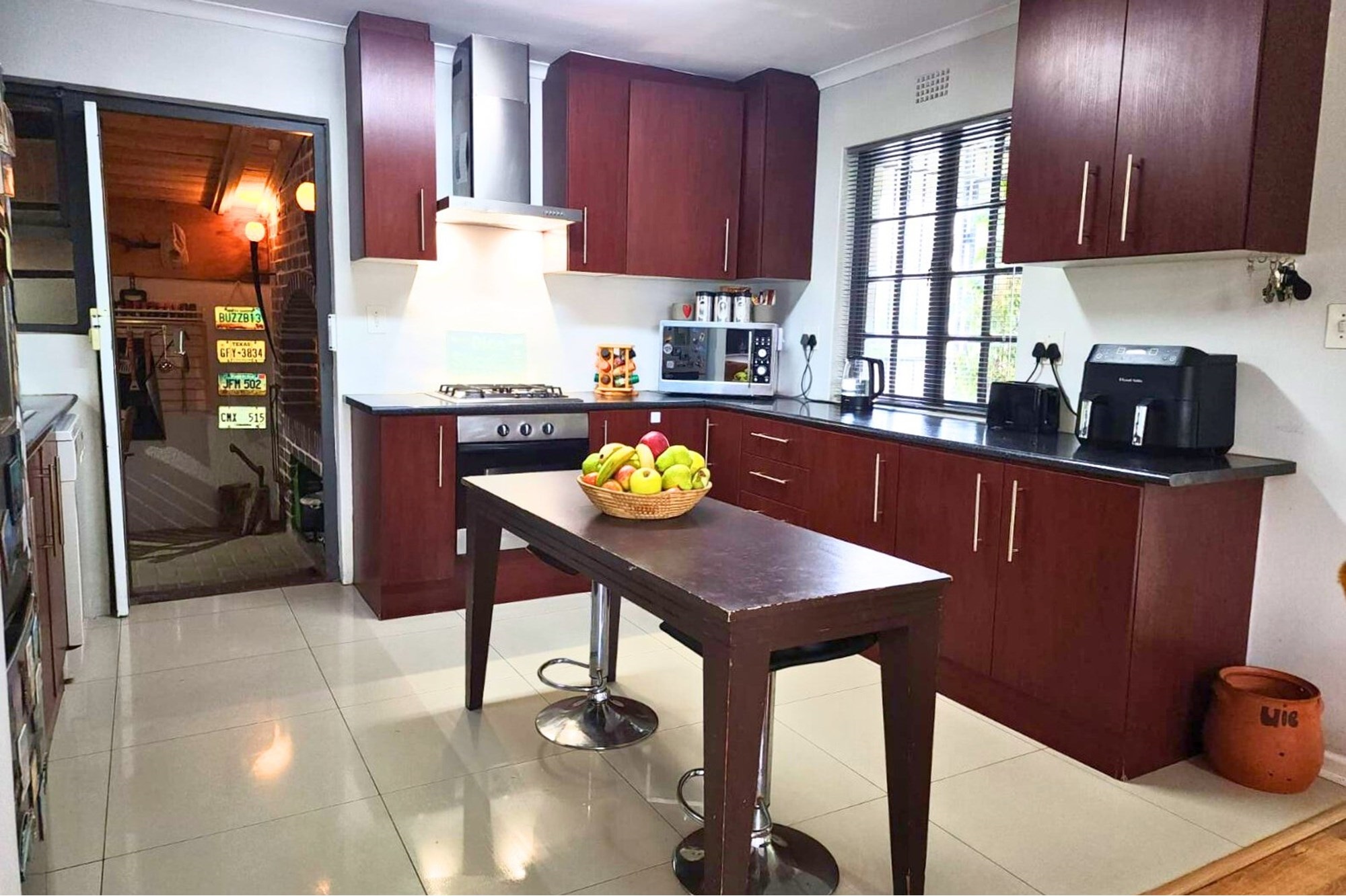 At the heart of the home lies a contemporary open-plan kitchen, fitted with a gas burner and ample cabinetry, seamlessly flowing into warm, light-filled living areas, while the built-in braai in the entertainment space makes gatherings unforgettable.