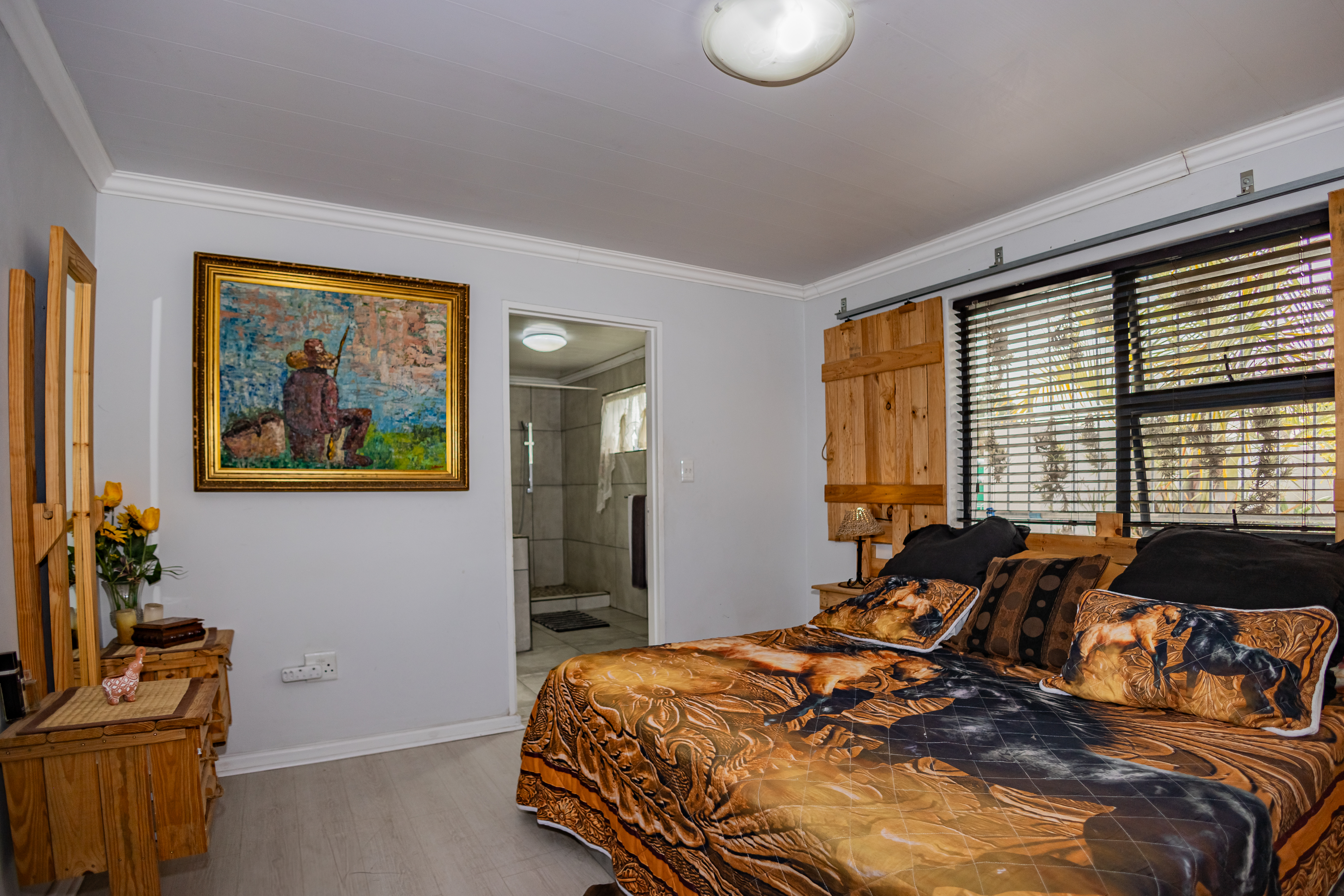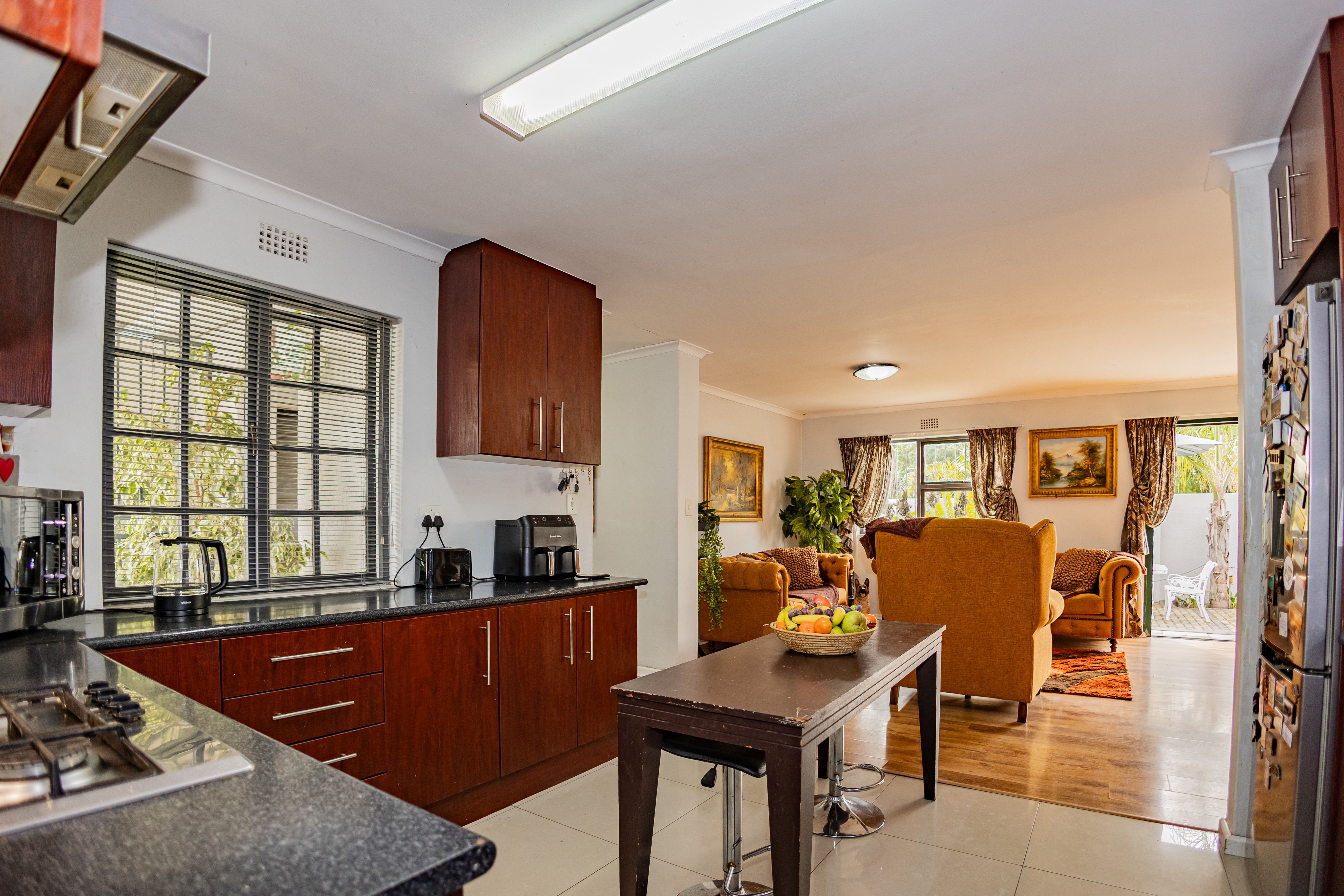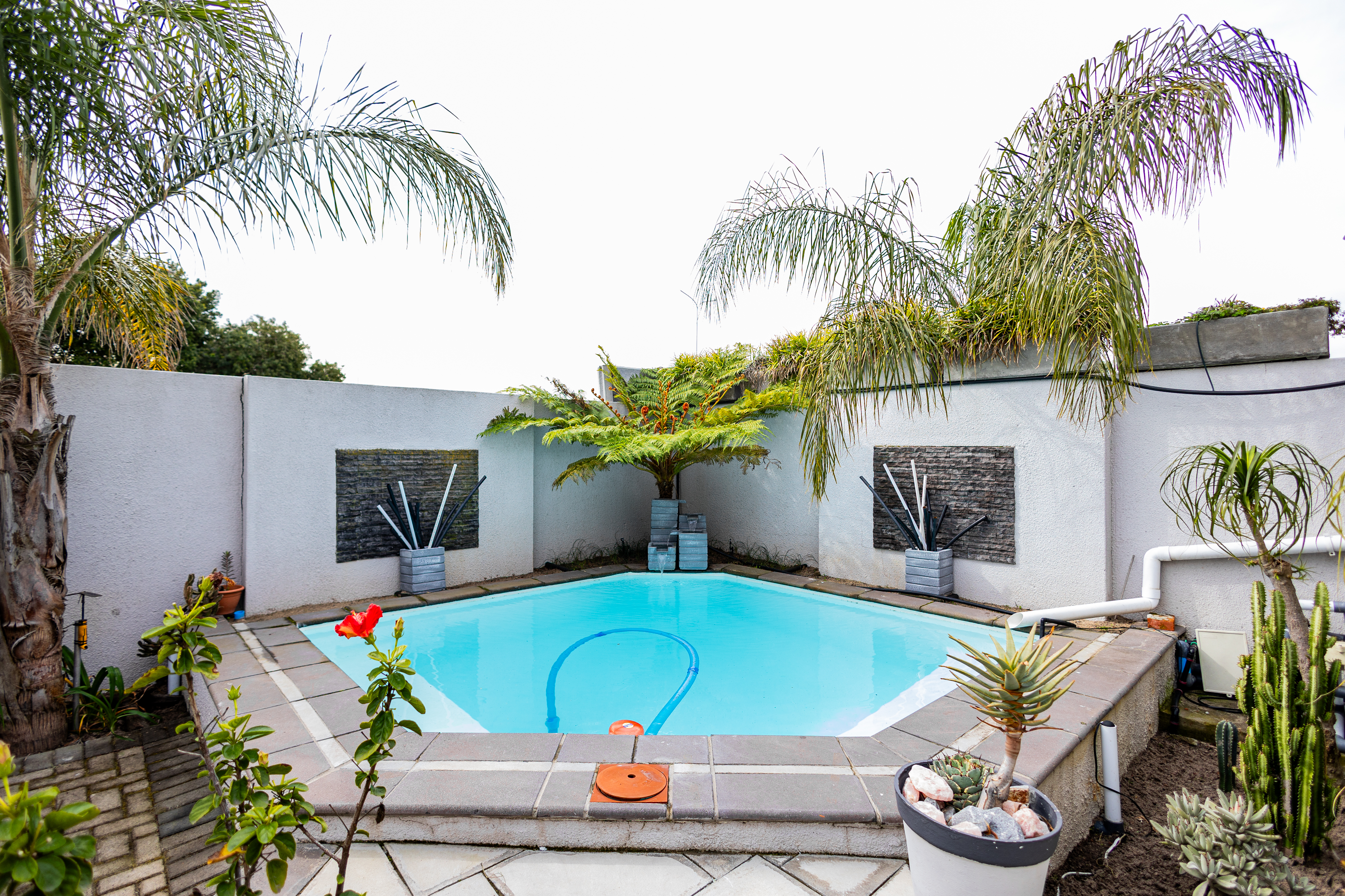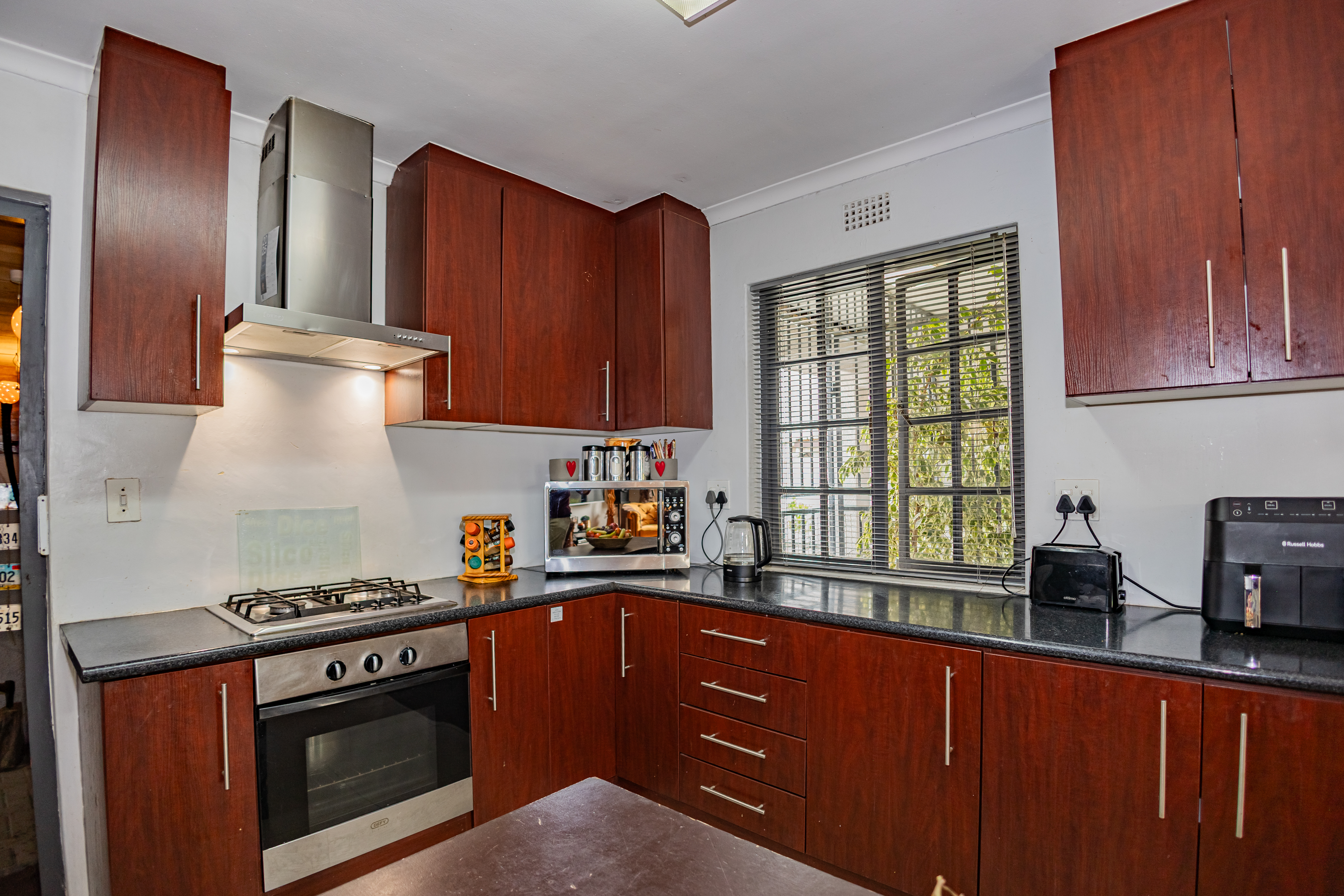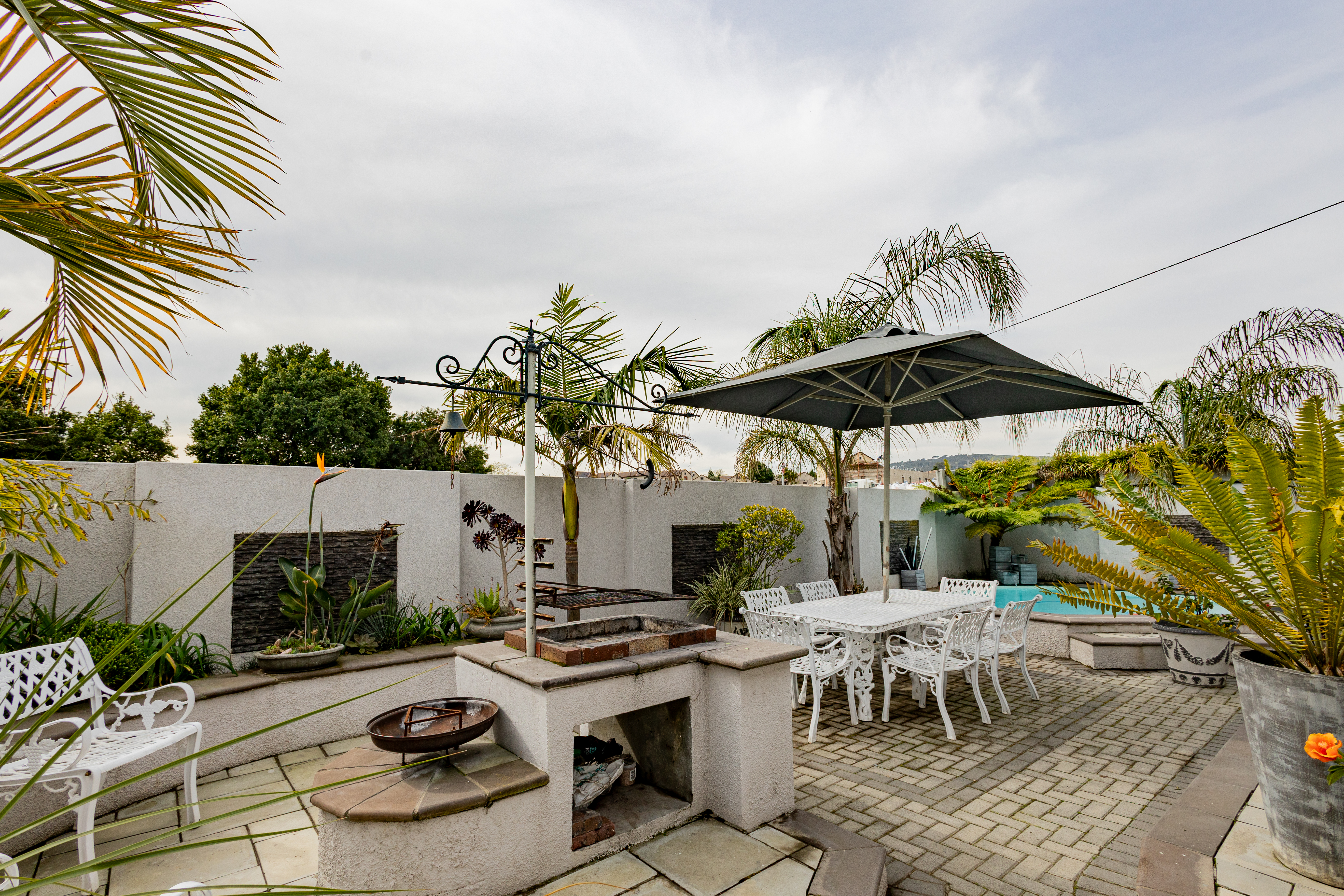 The main house features 3 bedrooms, including a main bedroom with an en-suite bathroom, plus a modern family bathroom. The open-plan kitchen is both stylish and functional, boasting a gas hob, ample cupboard space, and a seamless flow to the living areas. Enjoy year-round entertaining with an indoor braai, a heated swimming pool, and a convenient irrigation system to keep the garden lush. For extra security, there is CCTV cameras .