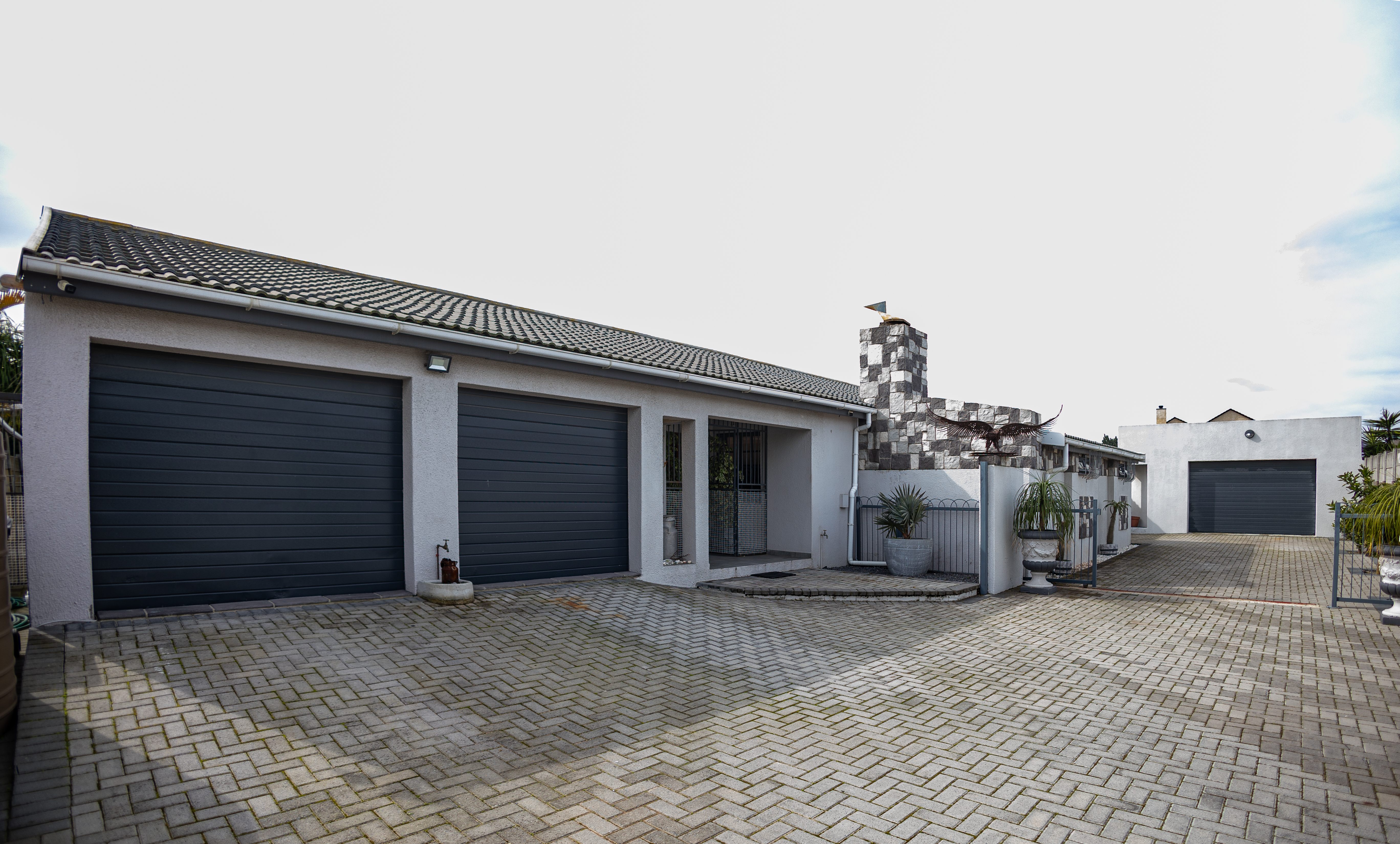 The separate flat offers 2 bedrooms, with the main bedroom featuring an en-suite bathroom, a modern kitchen, and a separate laundry. It also includes its own double garage and a beautifully designed courtyard, ensuring privacy and comfort.