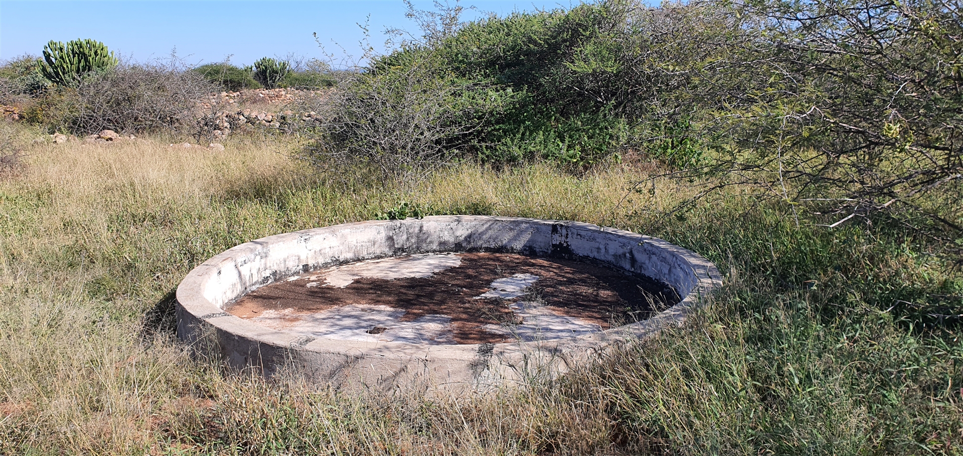 A renovated reservoir stores water when the mono pump motor is not running. The remains of a wind-pump and borehole are also here.