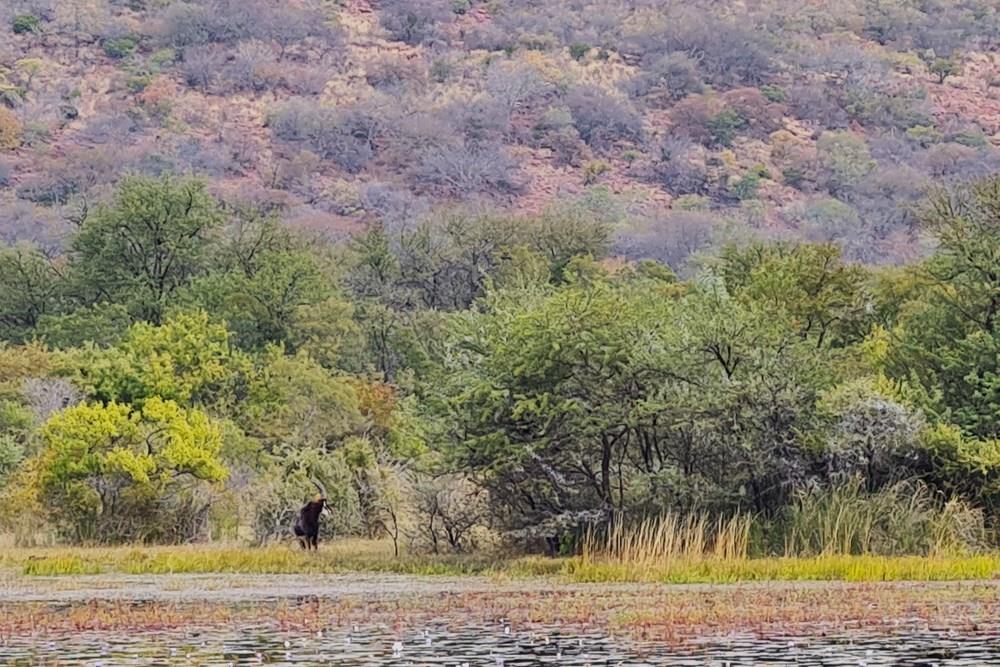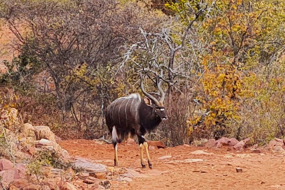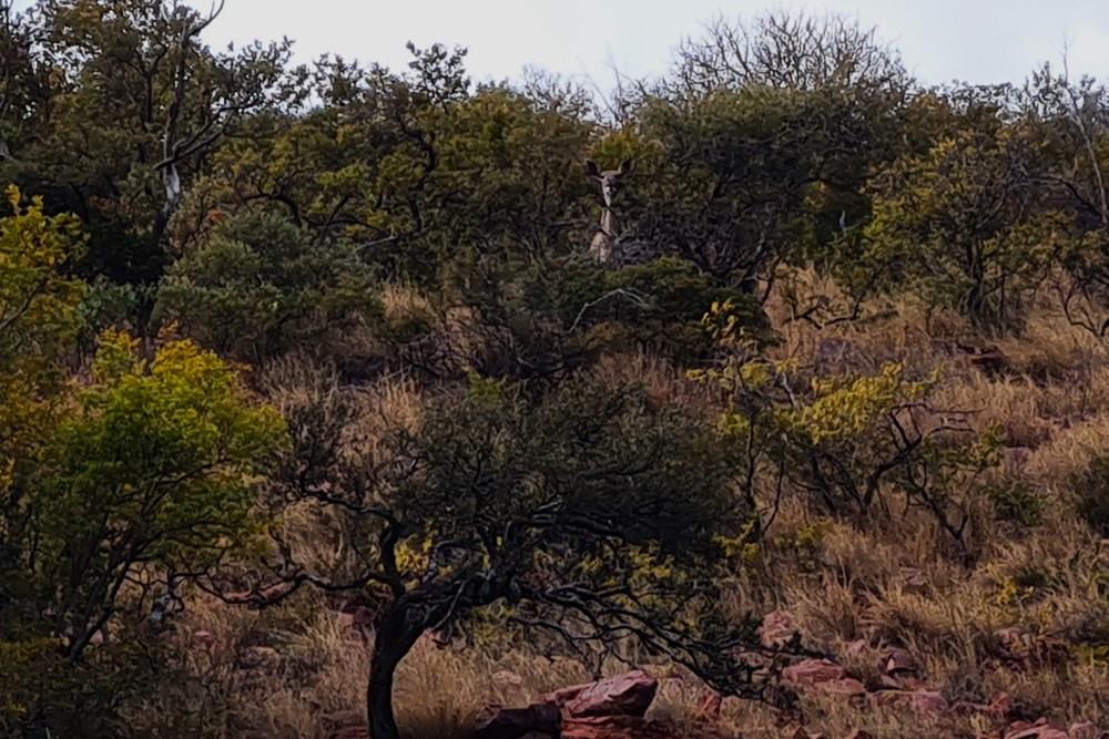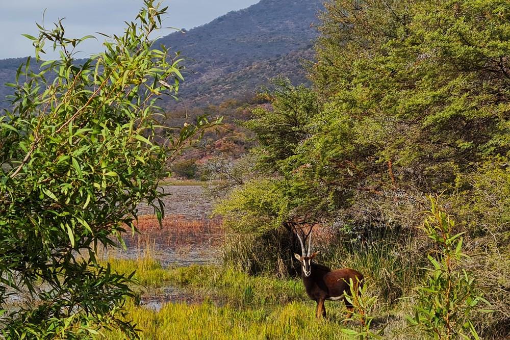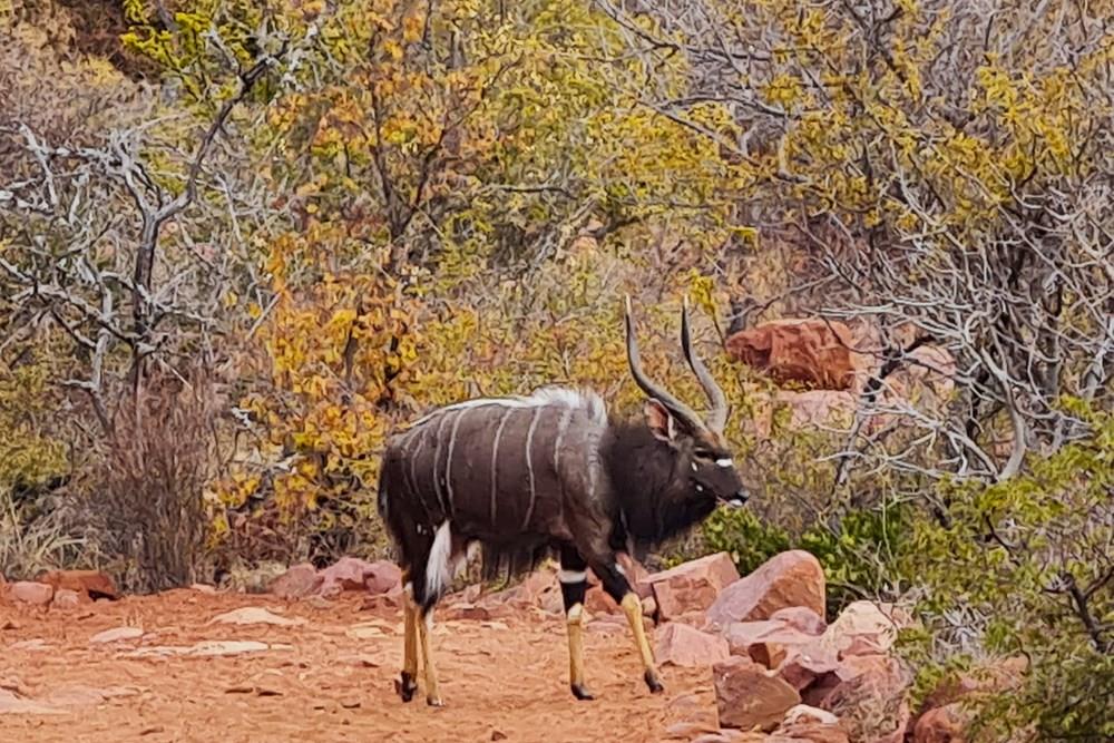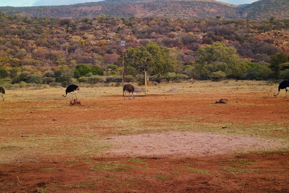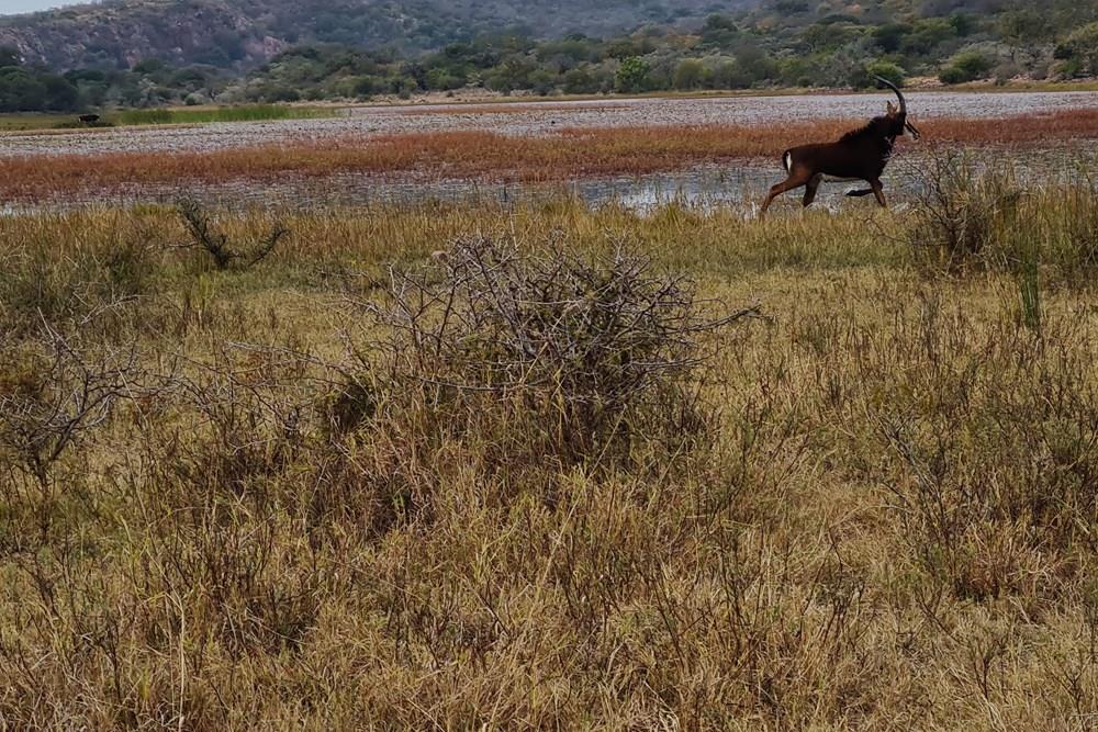 The game species that can be found on the farm include kudu, impala, water buck, golden wildebeest, sables, njalas, blesbok, giraffes, zebras, ostriches, Sharp grysbokkie, klipspringers, bushbuck, and warthogs.
