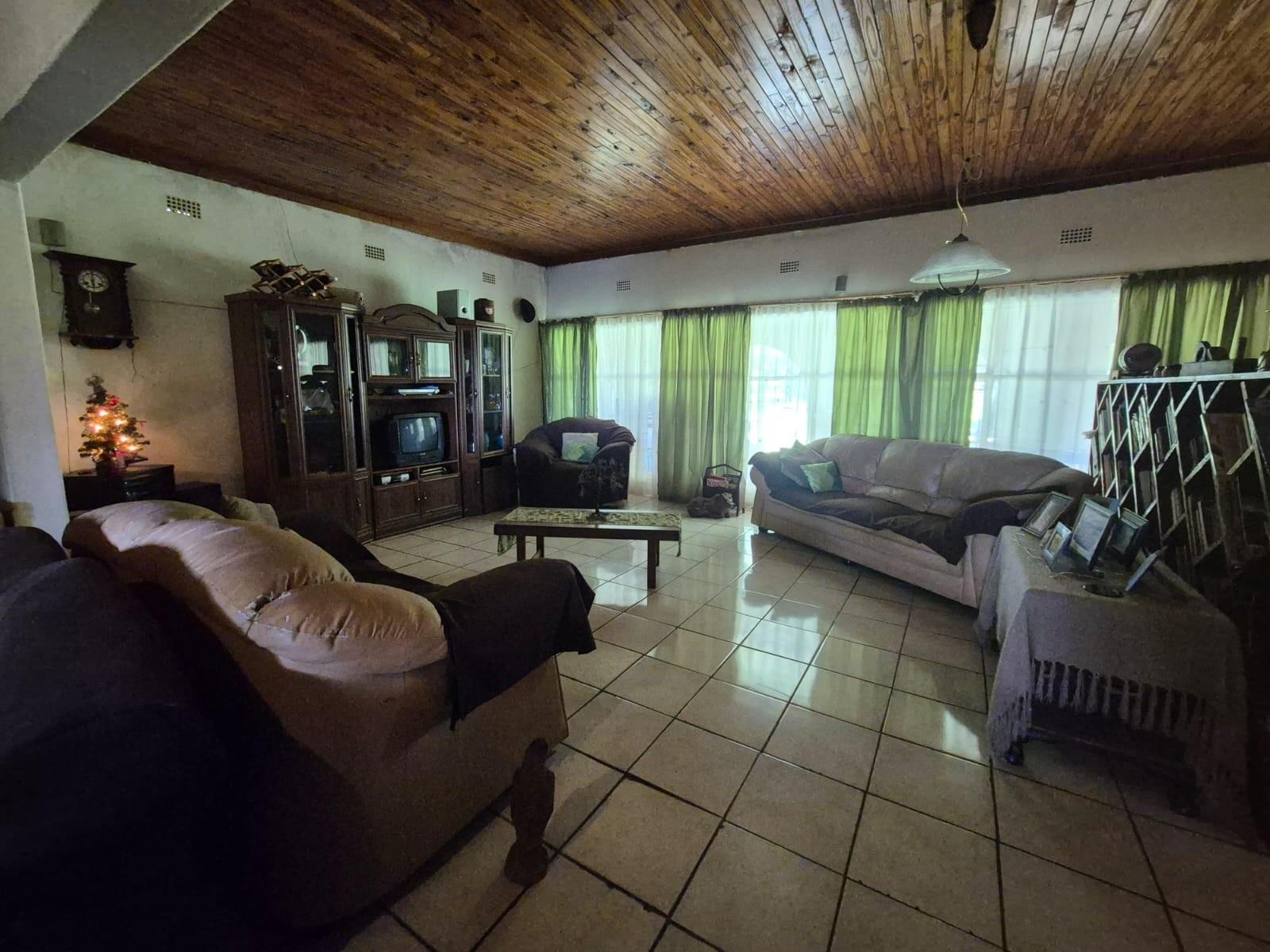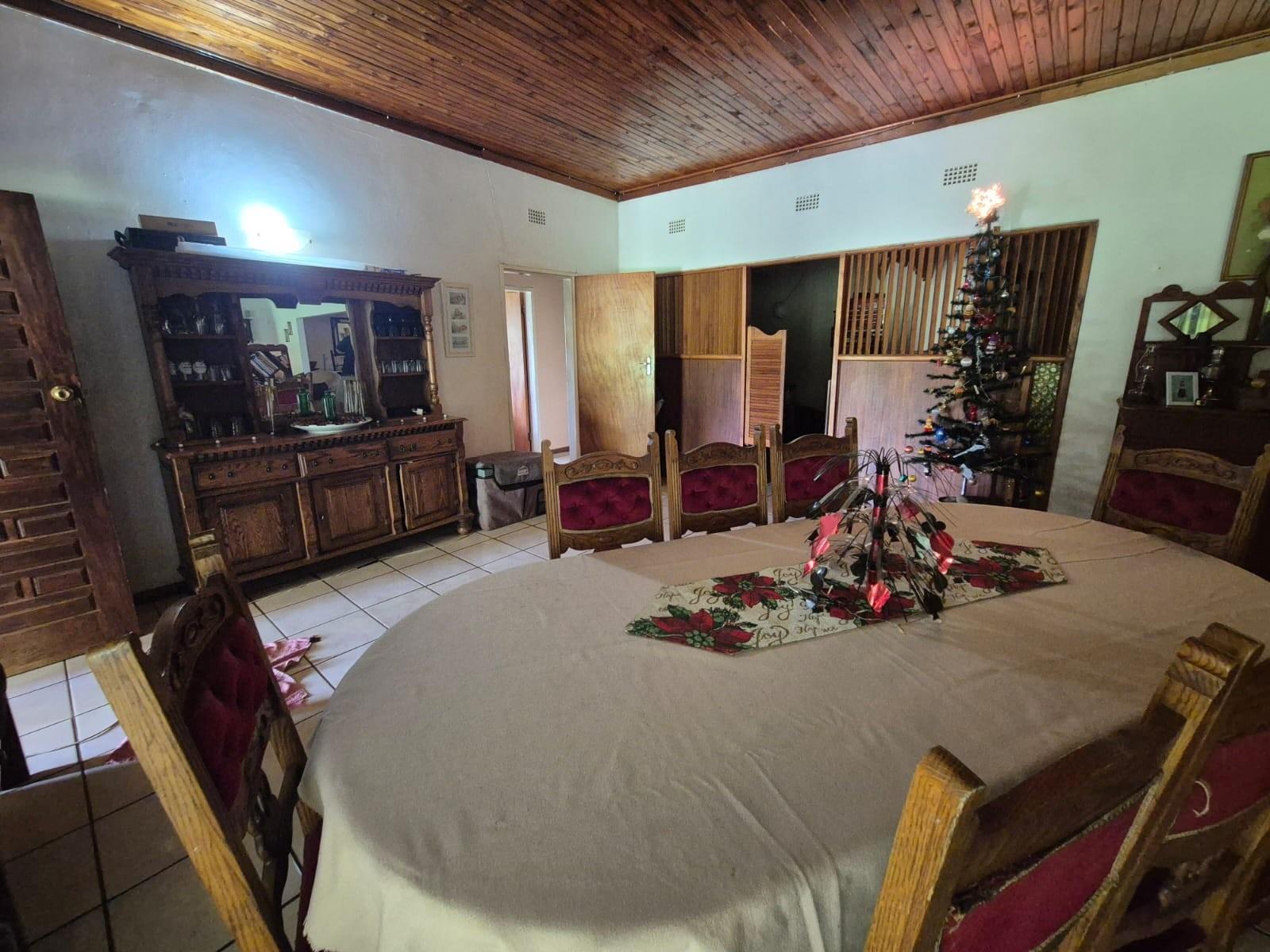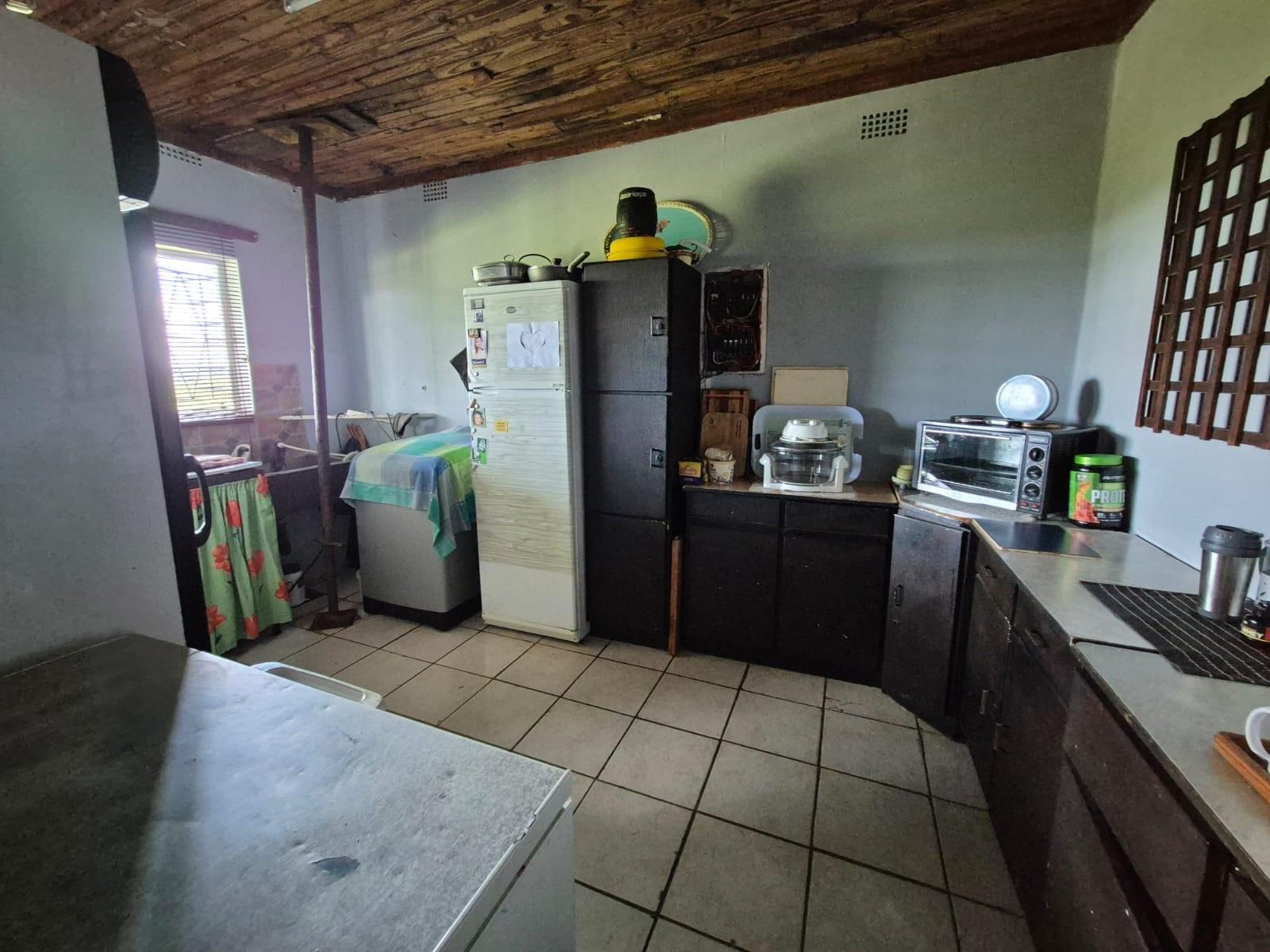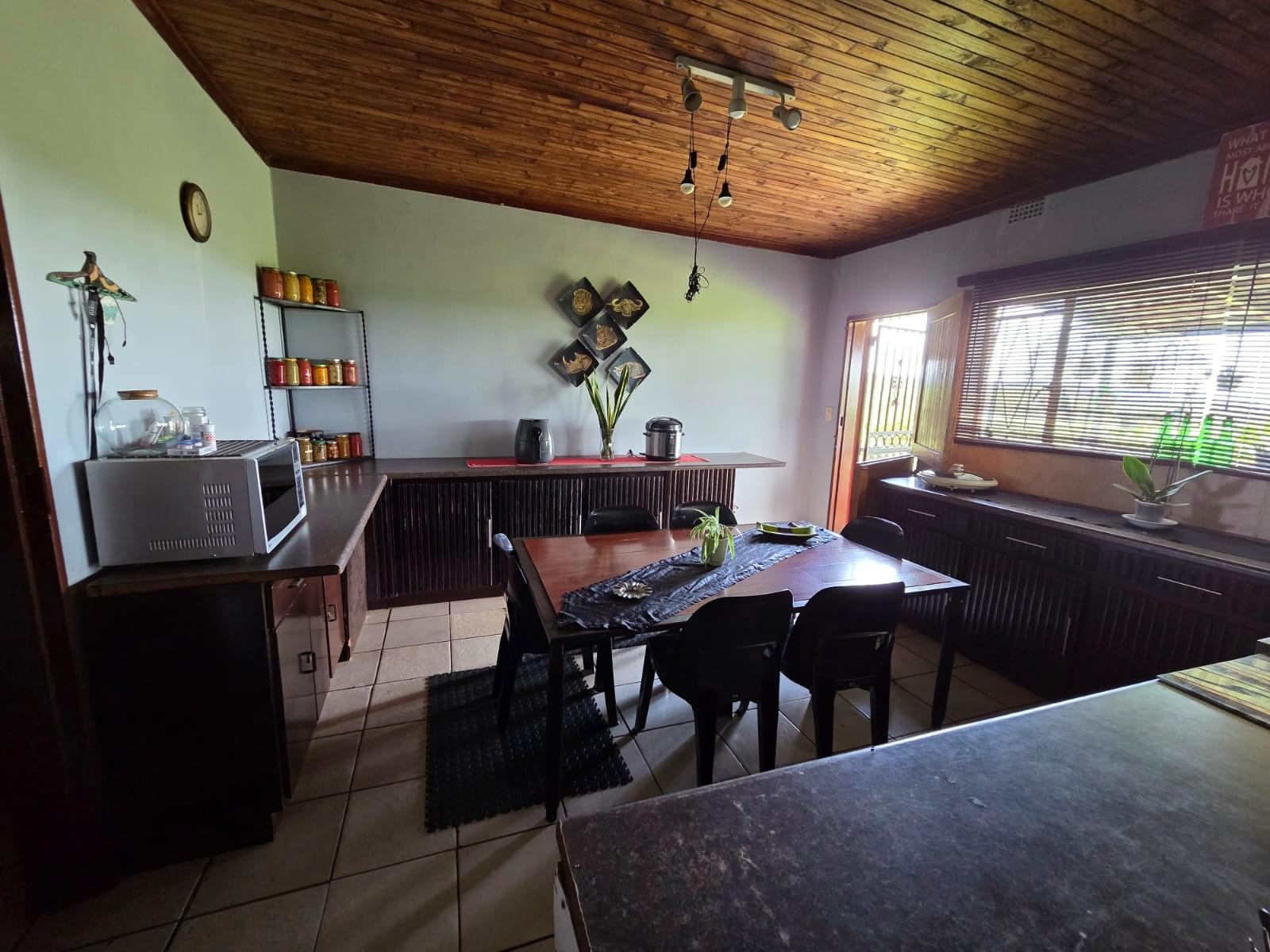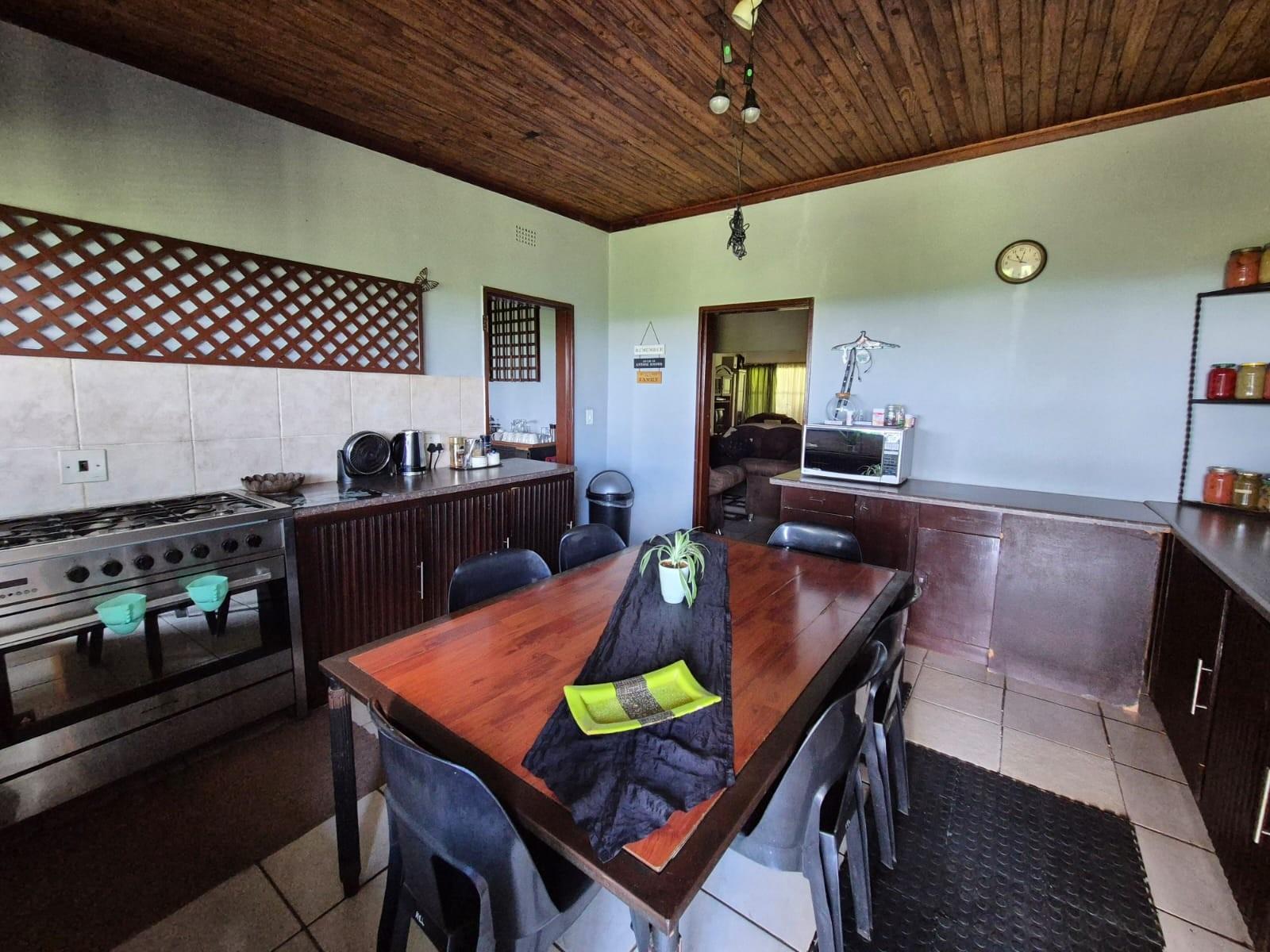 The kitchen is designed for family living, offering built‐in cupboards, space for a six‐seater table, and direct access to a large scullery with room for multiple freezers or appliances. From the kitchen, doors open onto a spacious patio overlooking the land—an ideal spot for a big braai setup and outdoor seating for gatherings.