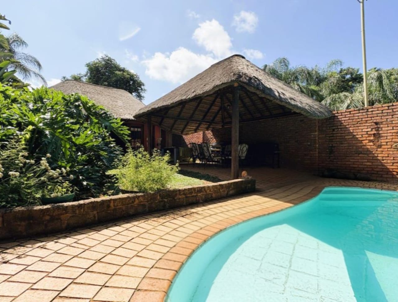 Swimming pool with a large thatched lapa, featuring an indoor braai (BBQ) area, kitchen, and bathroom.