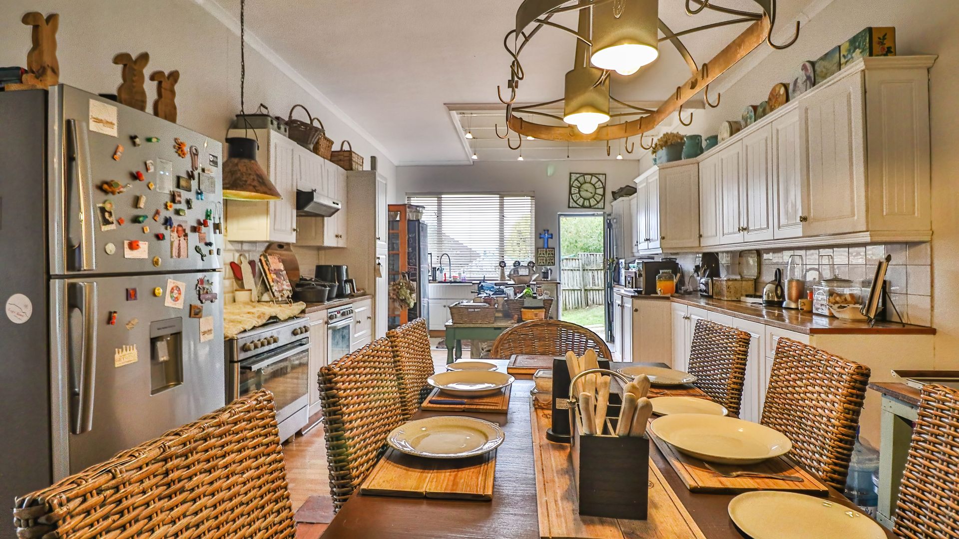 A warm and welcoming family kitchen with a chic, functional design that opens effortlessly onto the entertainment areas