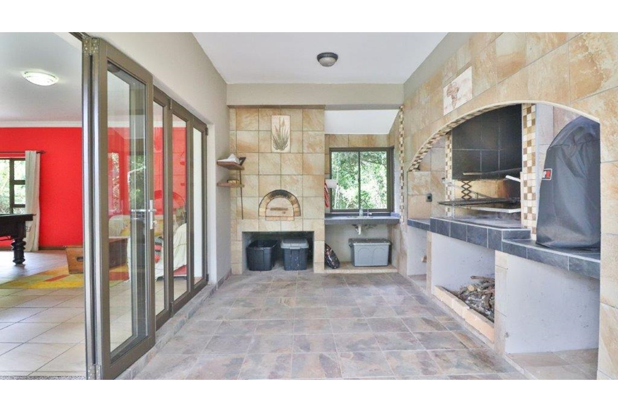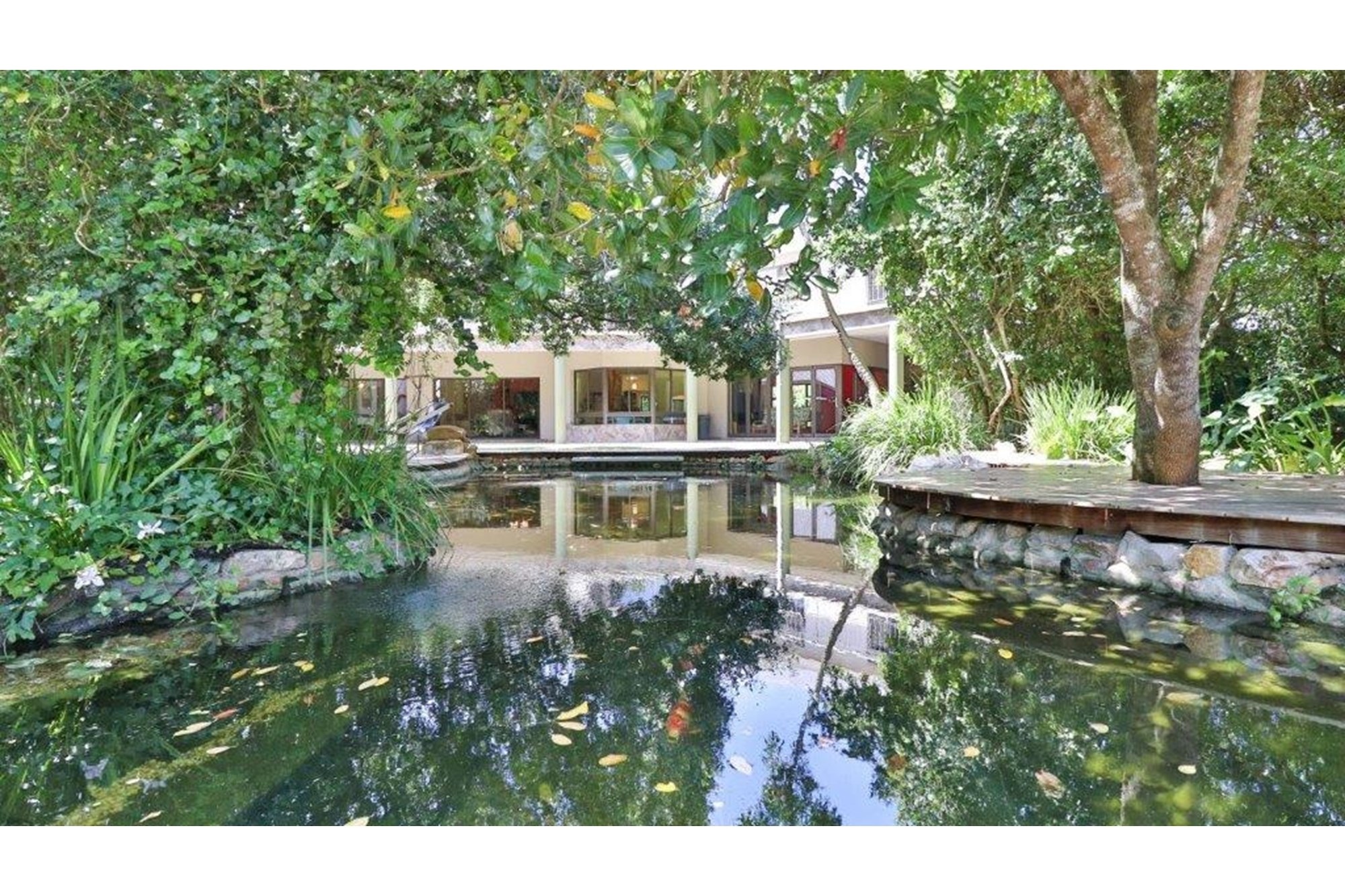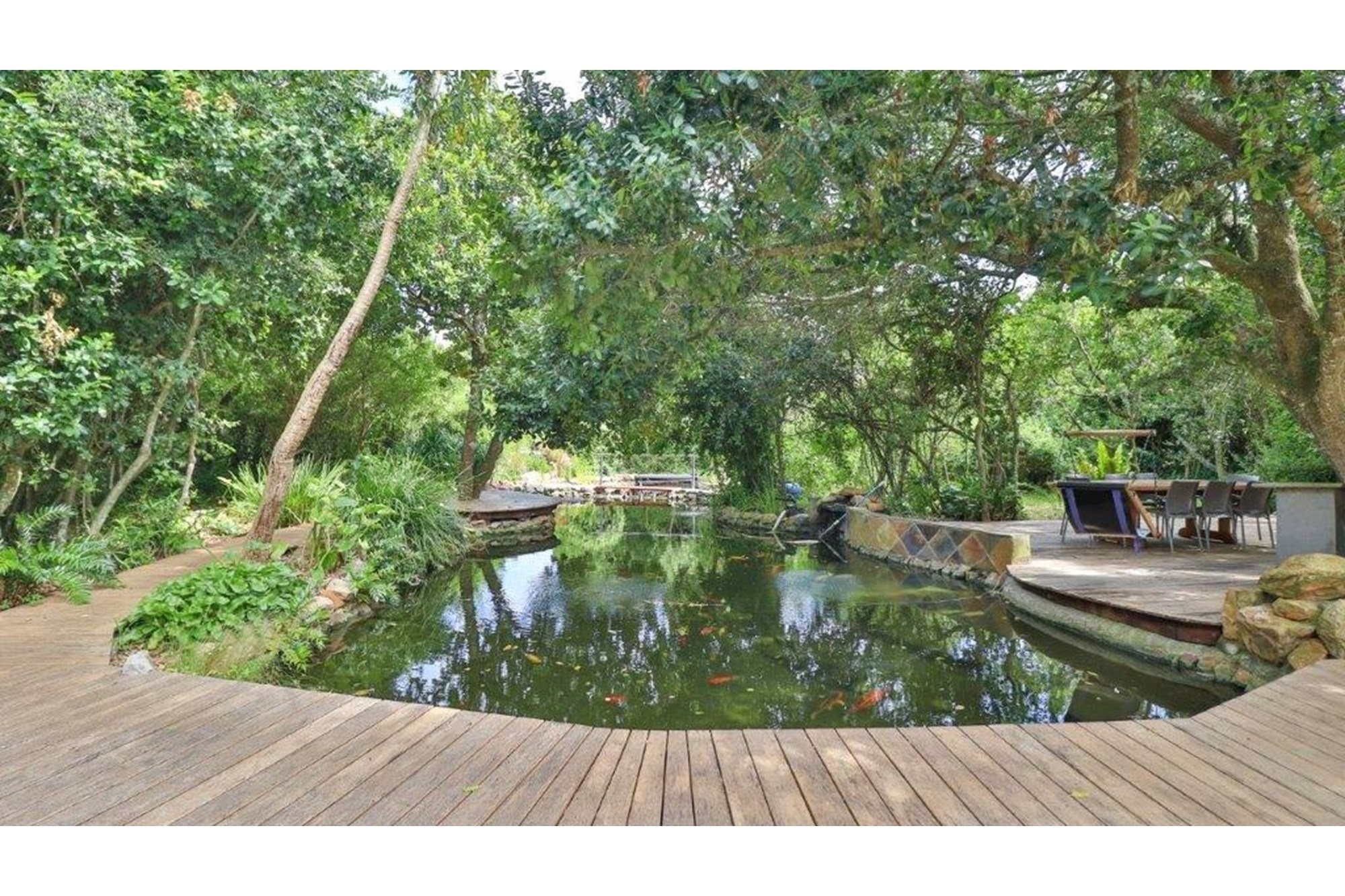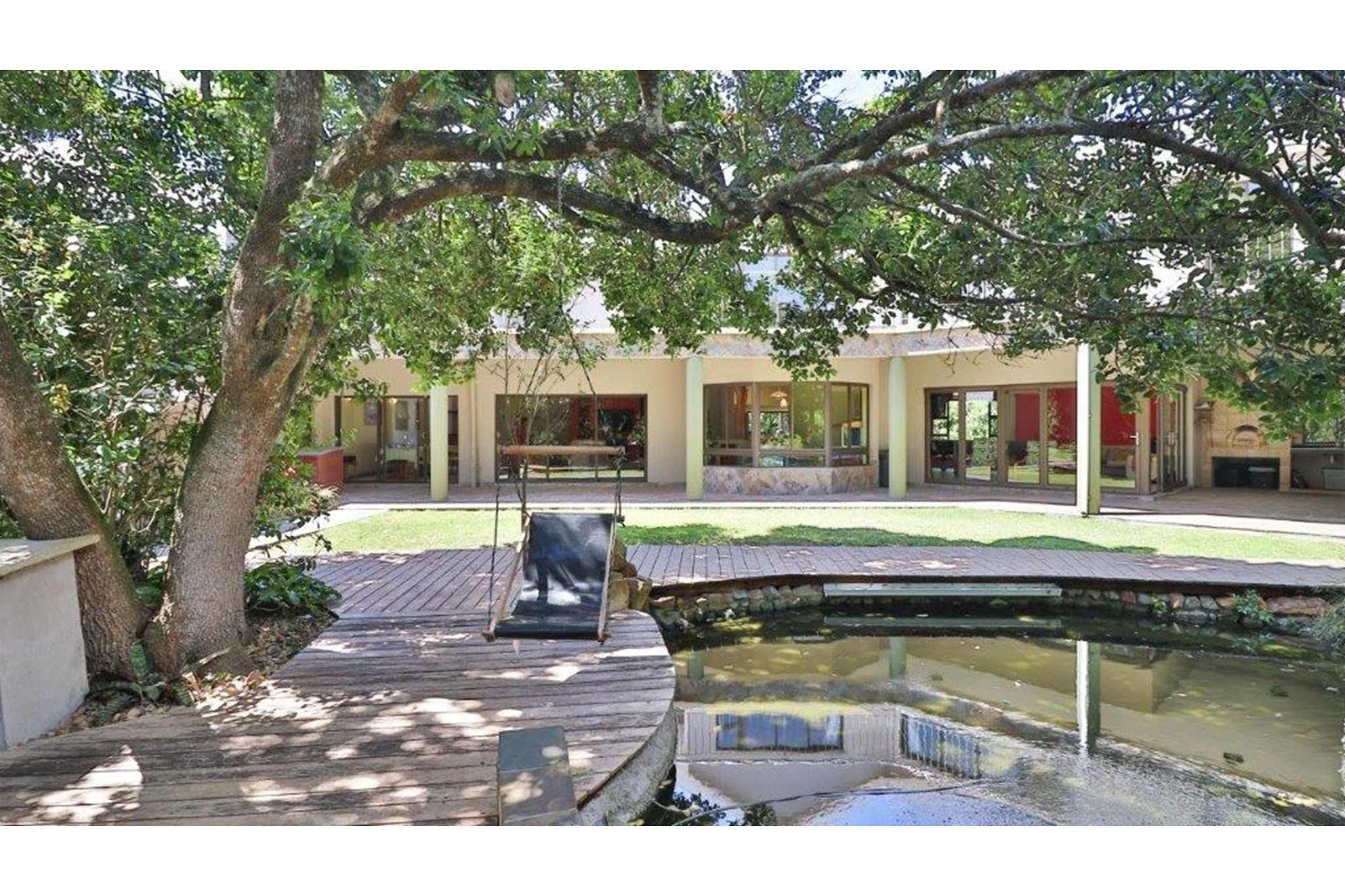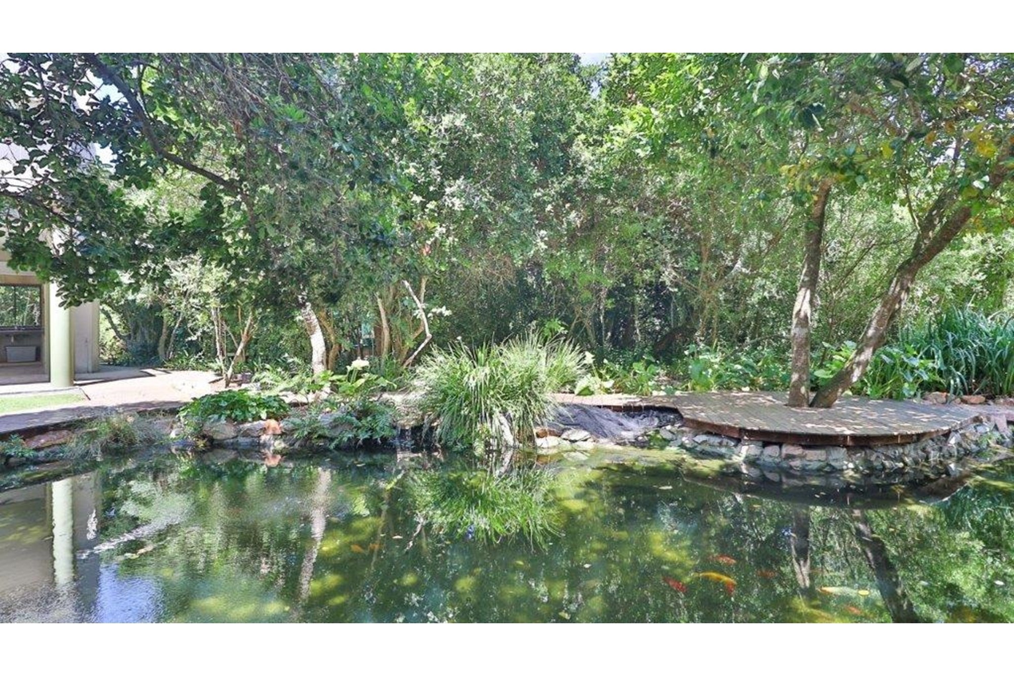 Just outside the snooker room, you’ll find an enclosed braai area complete with a built-in braai and pizza oven, overlooking a stunning koi pond—the heart of the property. A wooden walkway meanders around the pond, with peaceful spots to sit and reflect under the trees