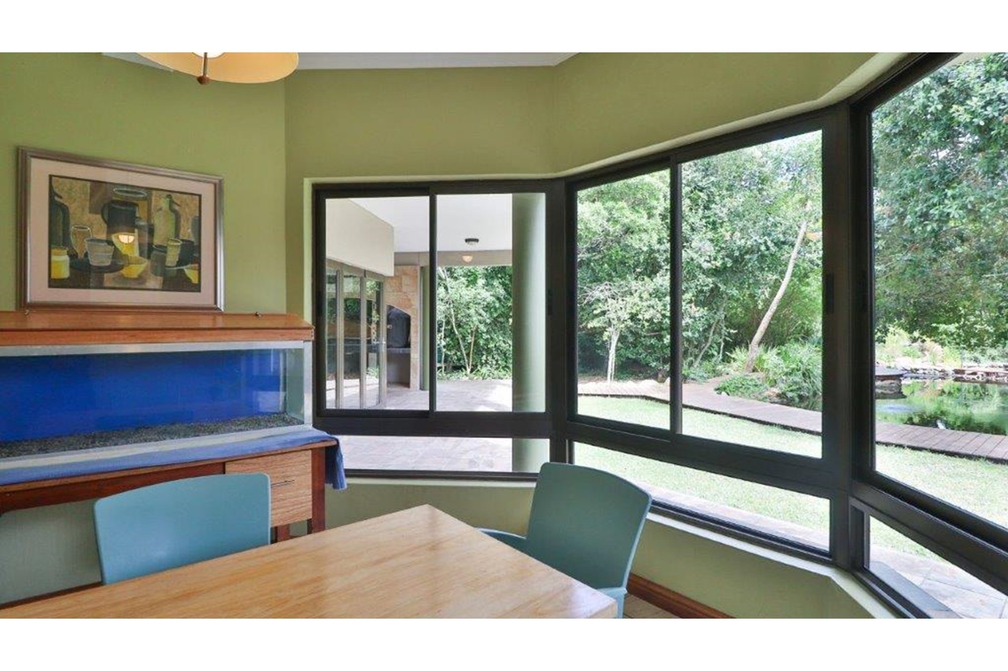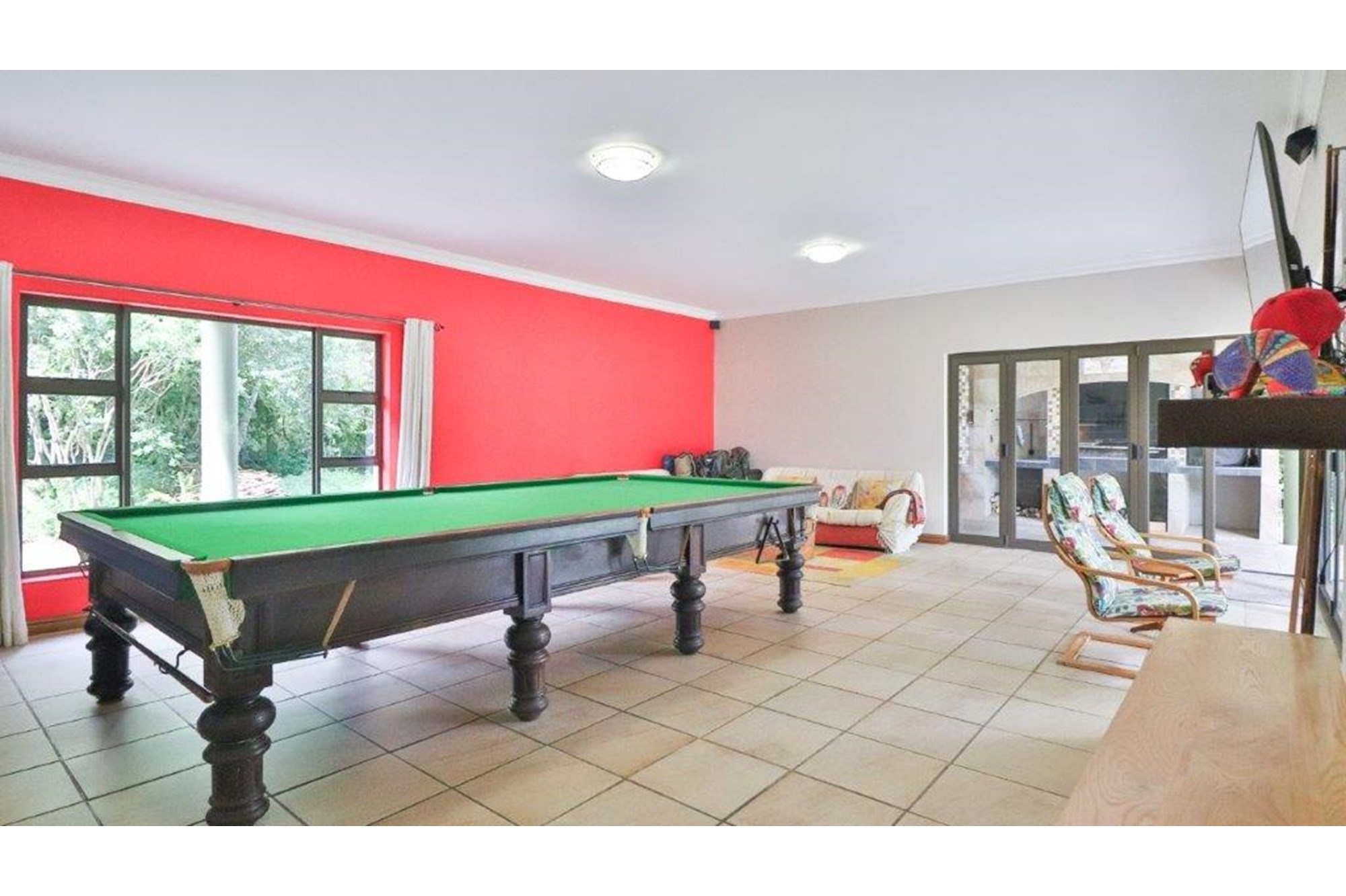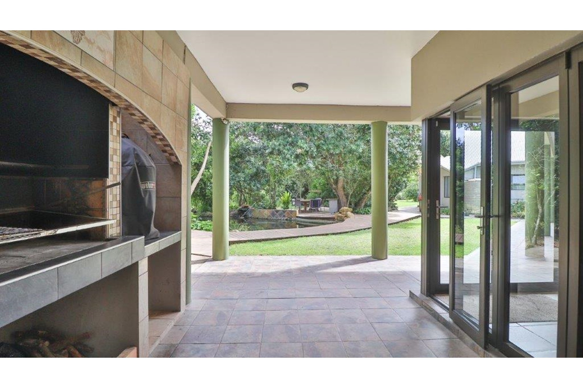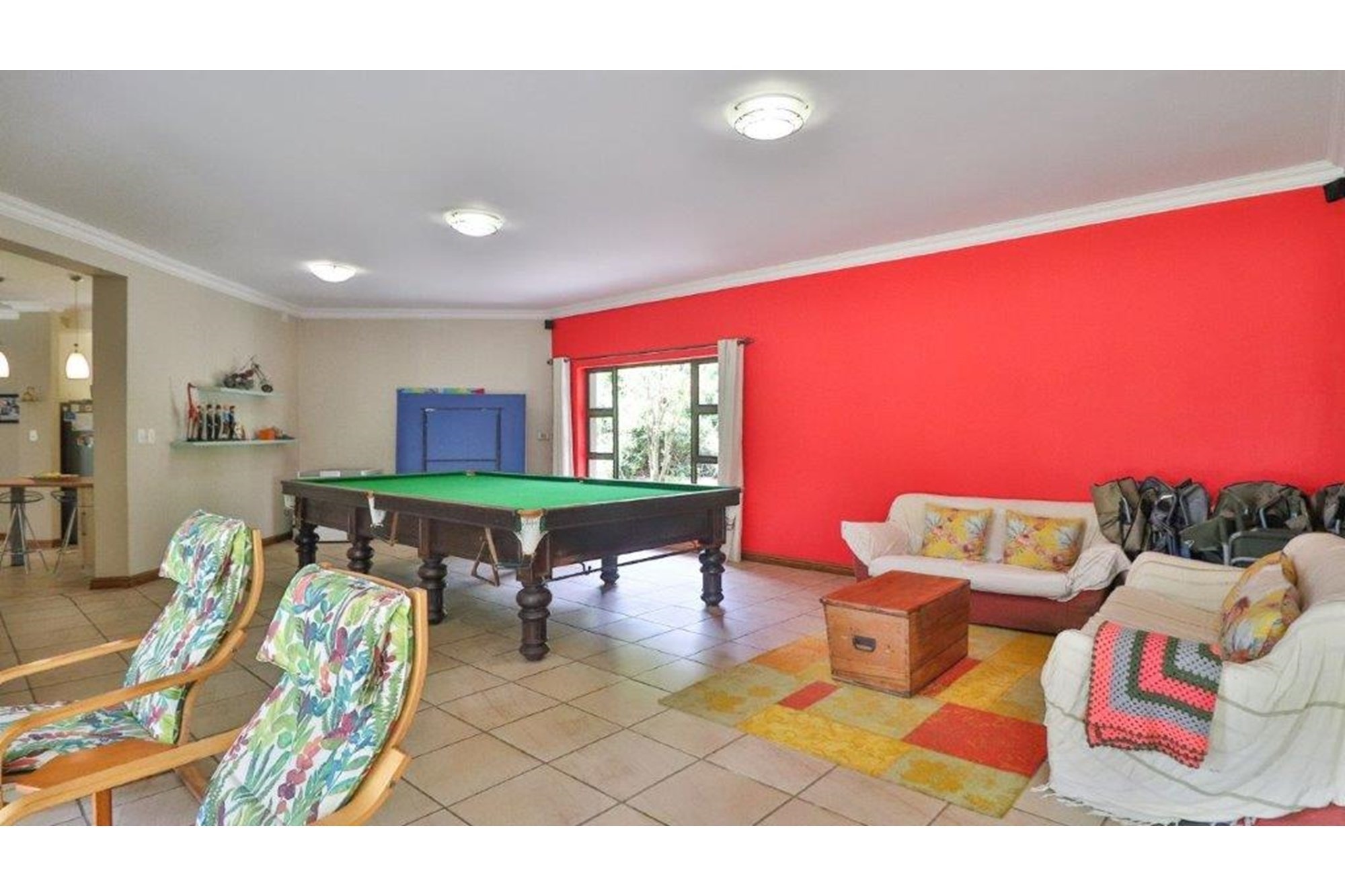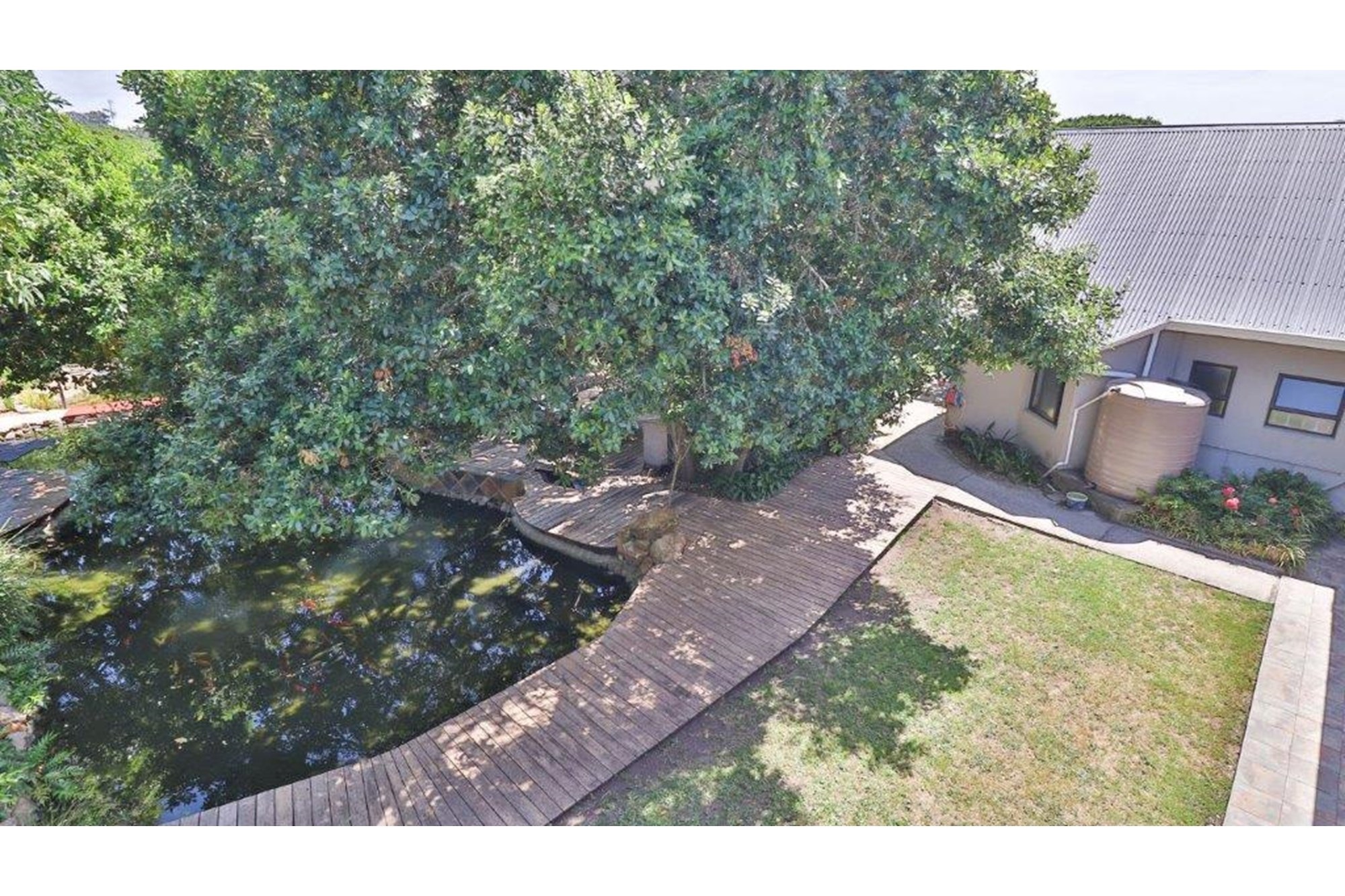 Just outside the snooker room, you’ll find an enclosed braai area complete with a built-in braai and pizza oven, overlooking a stunning koi pond—the heart of the property. A wooden walkway meanders around the pond, with peaceful spots to sit and reflect under the trees
