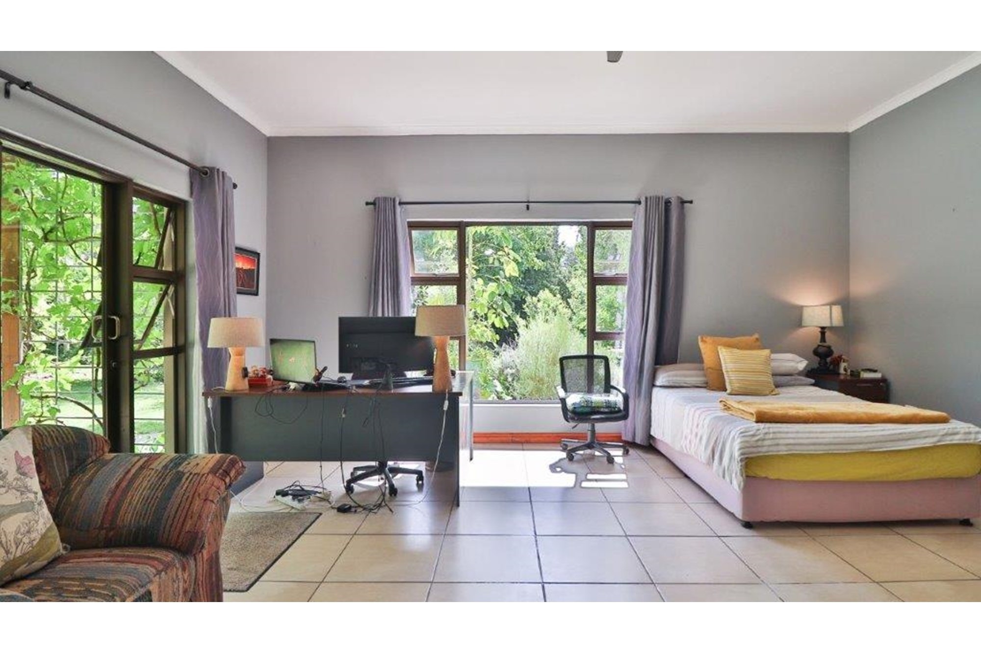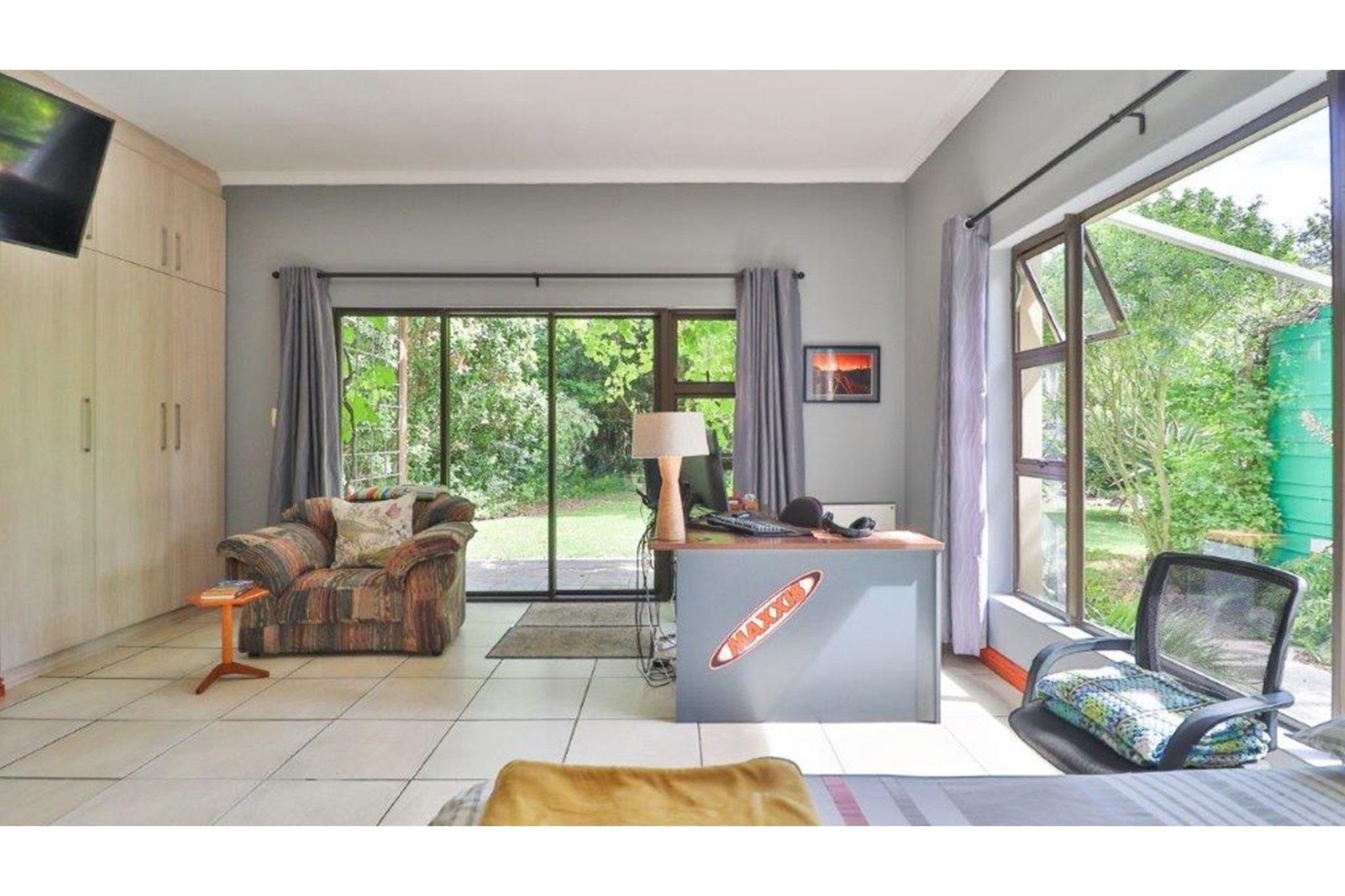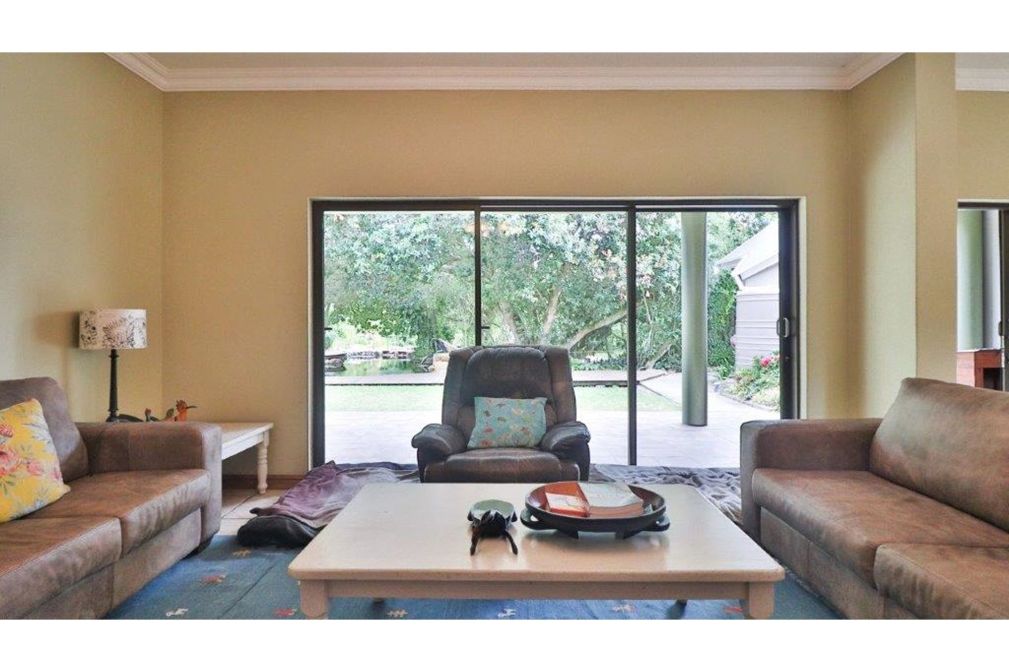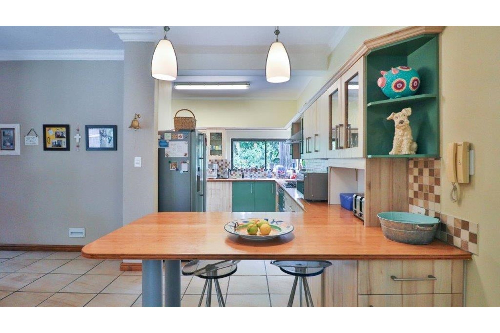 Just outside the snooker room, you’ll find an enclosed braai area complete with a built-in braai and pizza oven, overlooking a stunning koi pond—the heart of the property. A wooden walkway meanders around the pond, with peaceful spots to sit and reflect under the trees