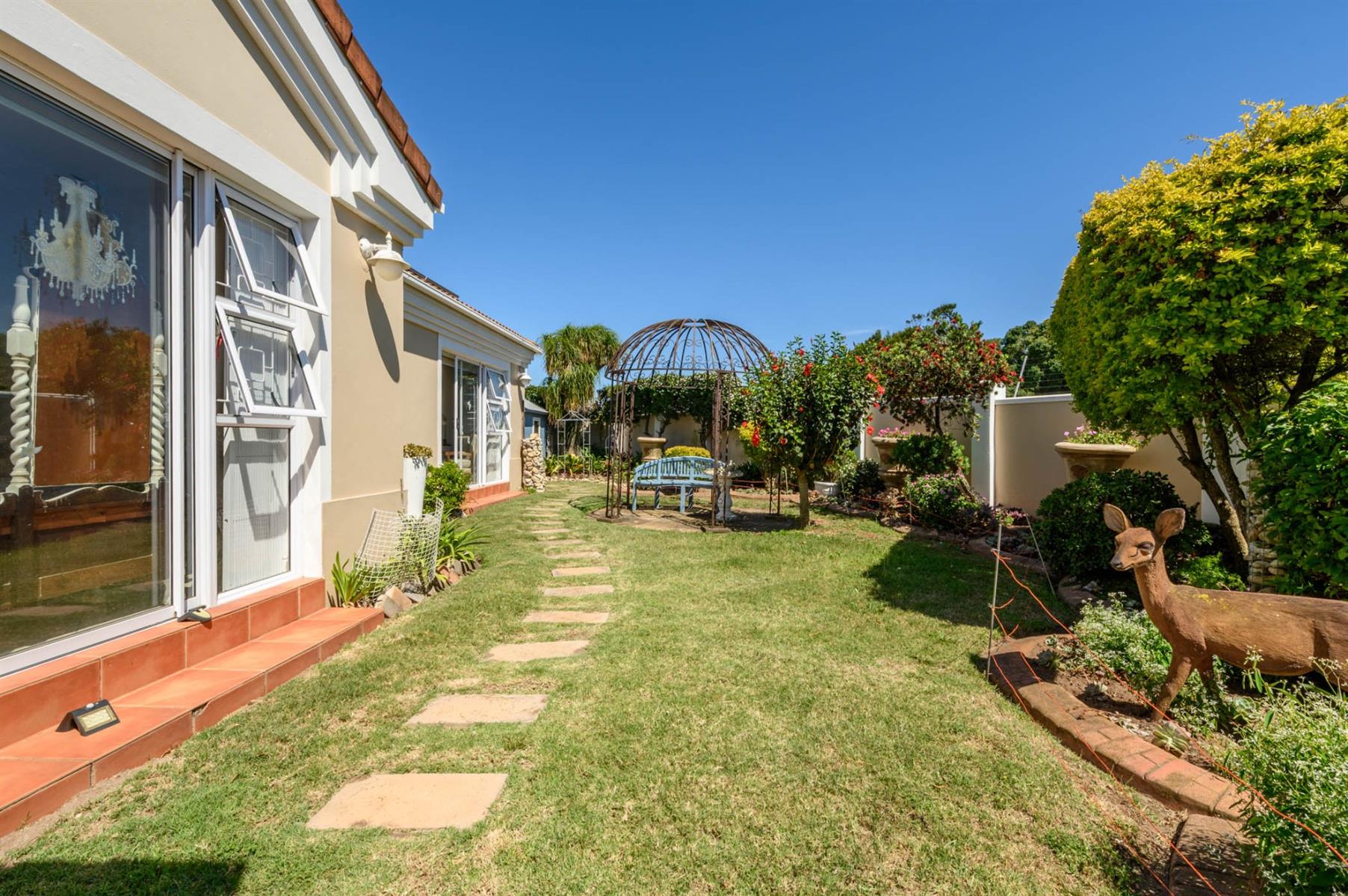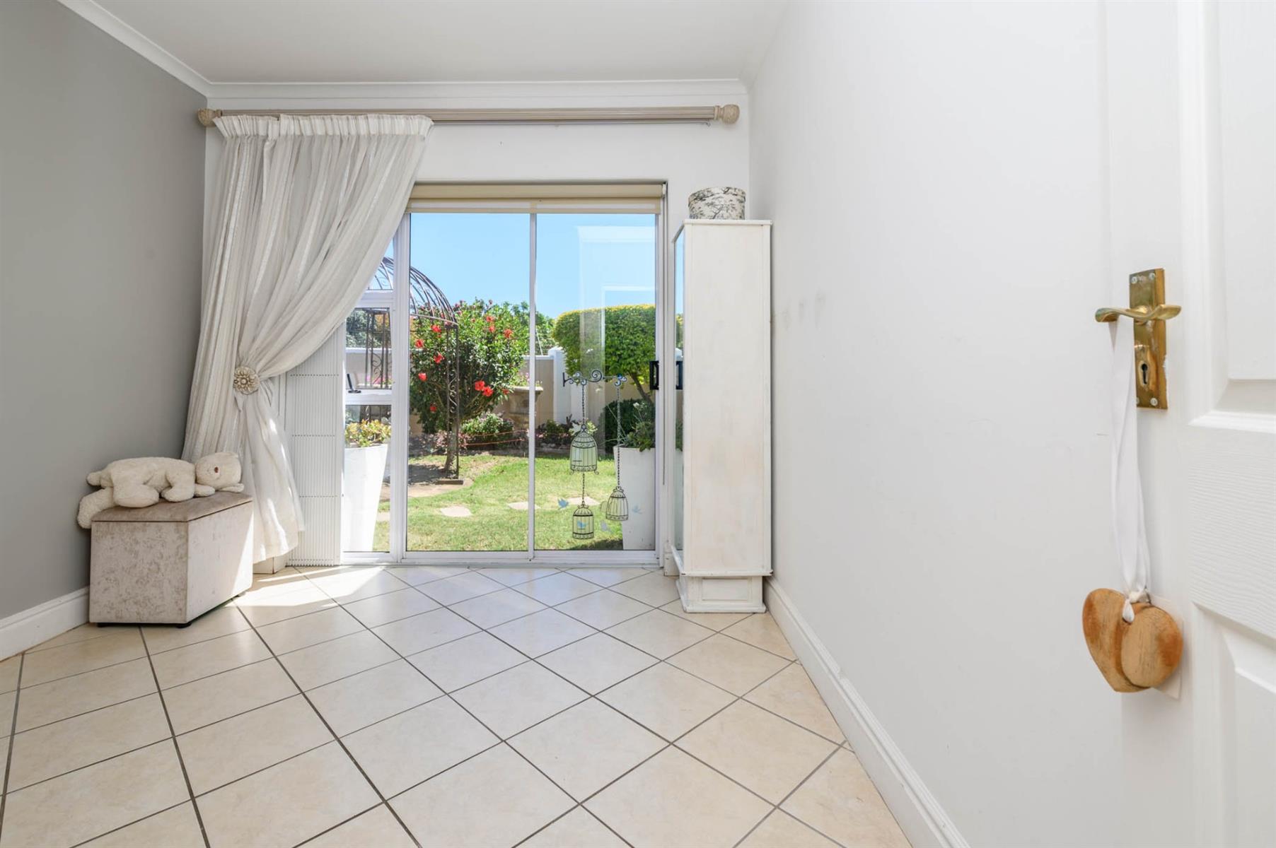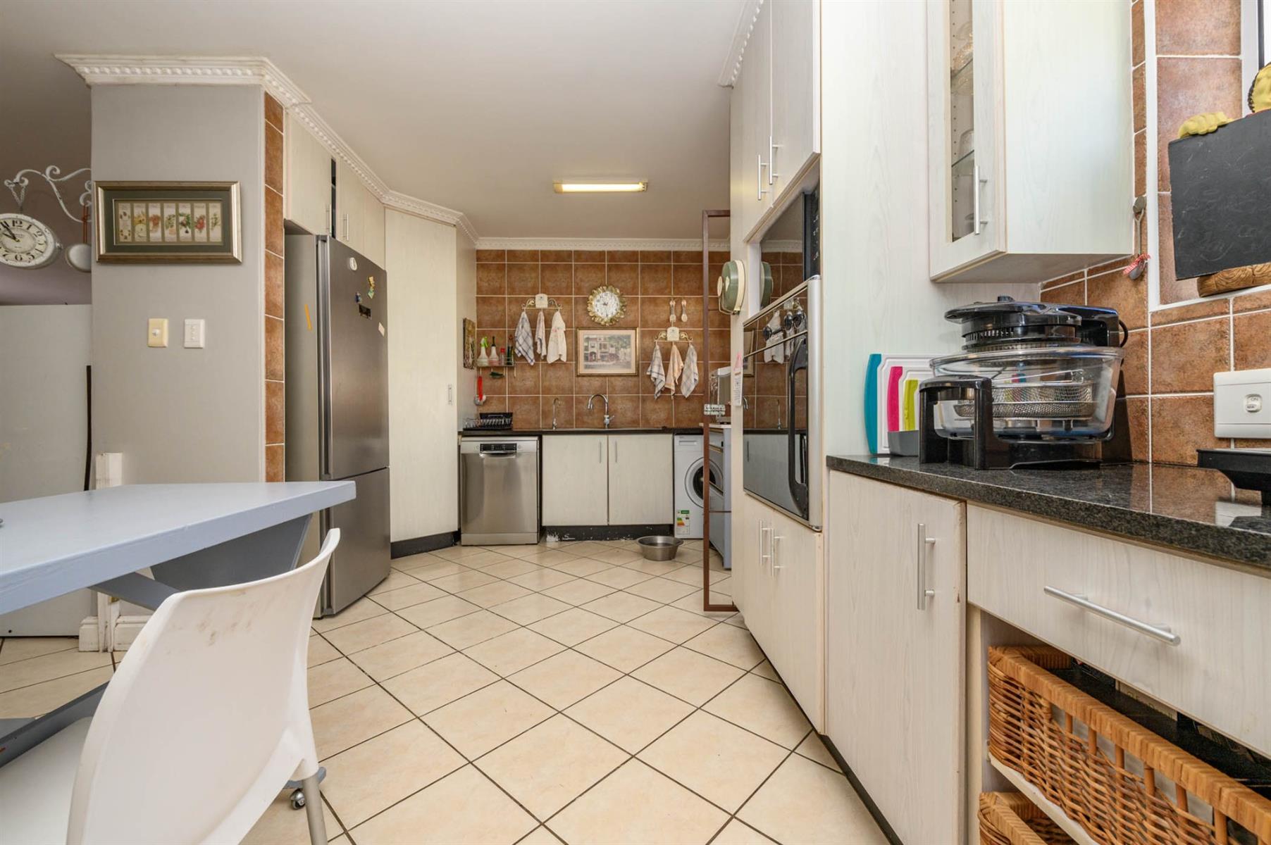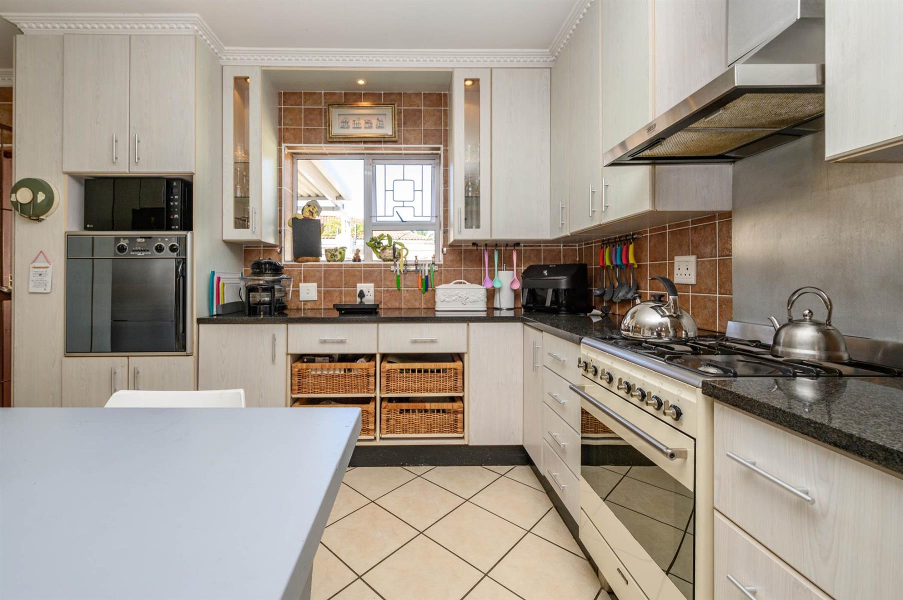 The kitchen is fitted with granite countertops, a SMEG built-in oven, and a gas hob, ideal for anyone who loves to cook. All bedrooms have built-in cupboards and sliding doors that open onto the garden, letting in plenty of light. The main bedroom has a walk-in closet and an en suite, while the full guest bathroom has both a bath and a shower.