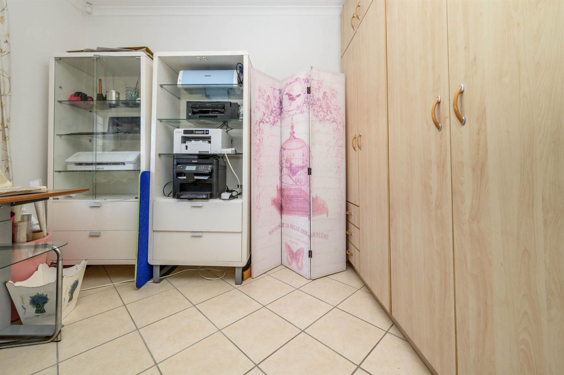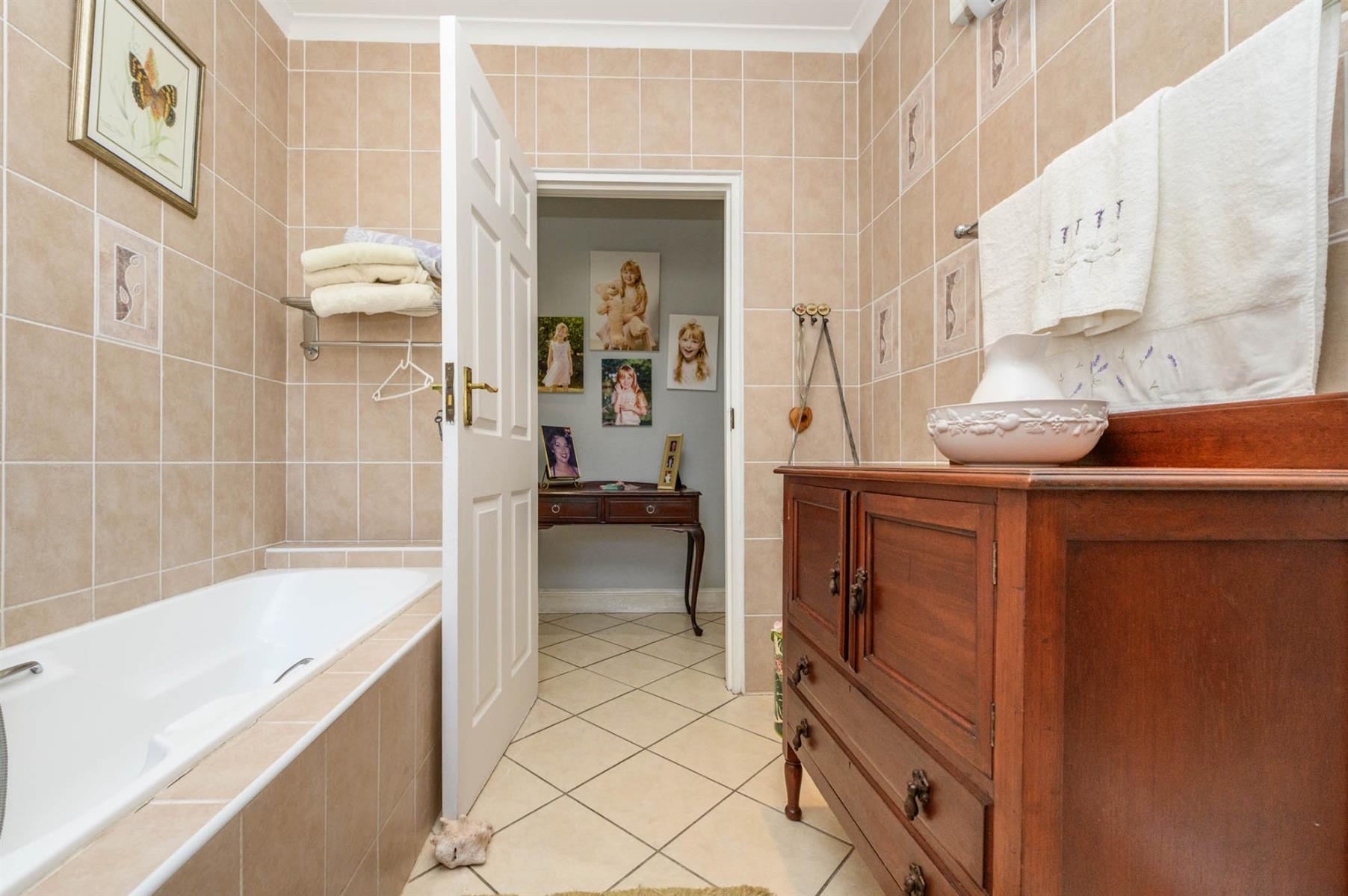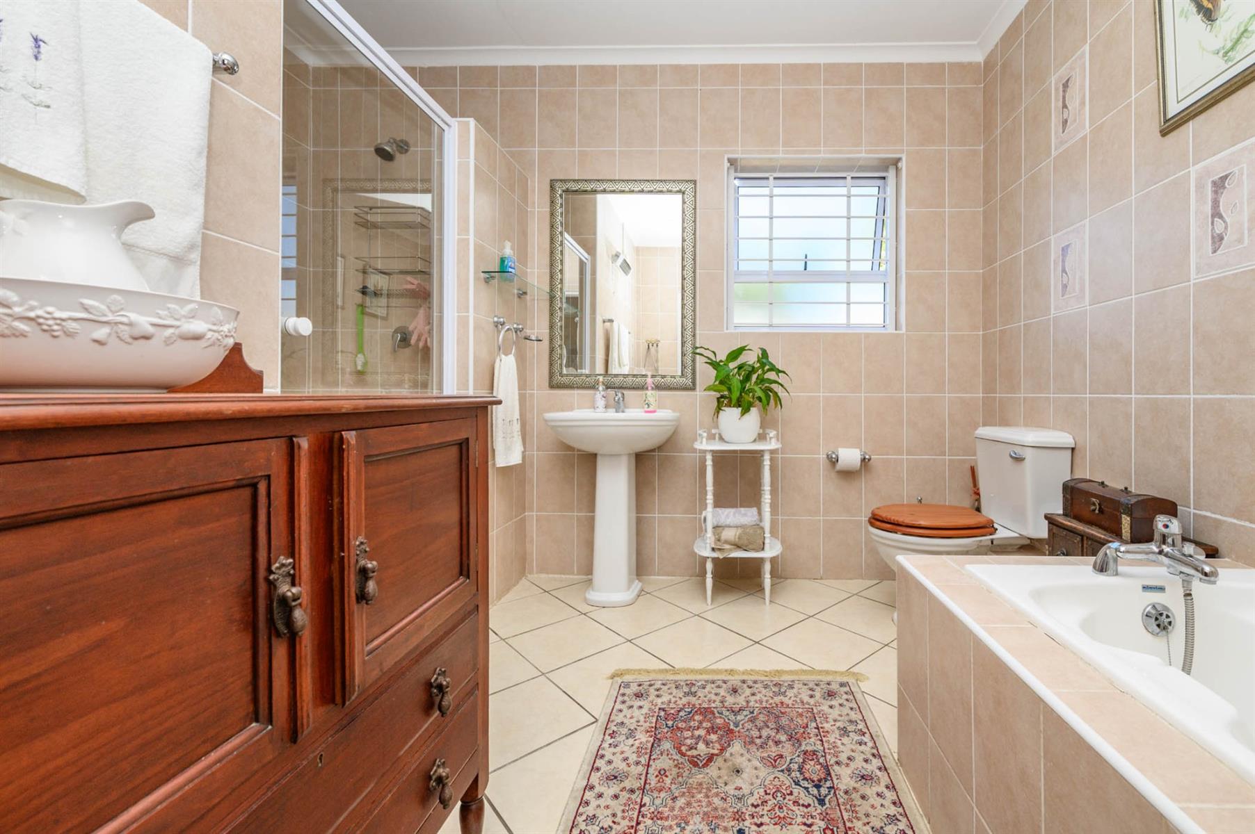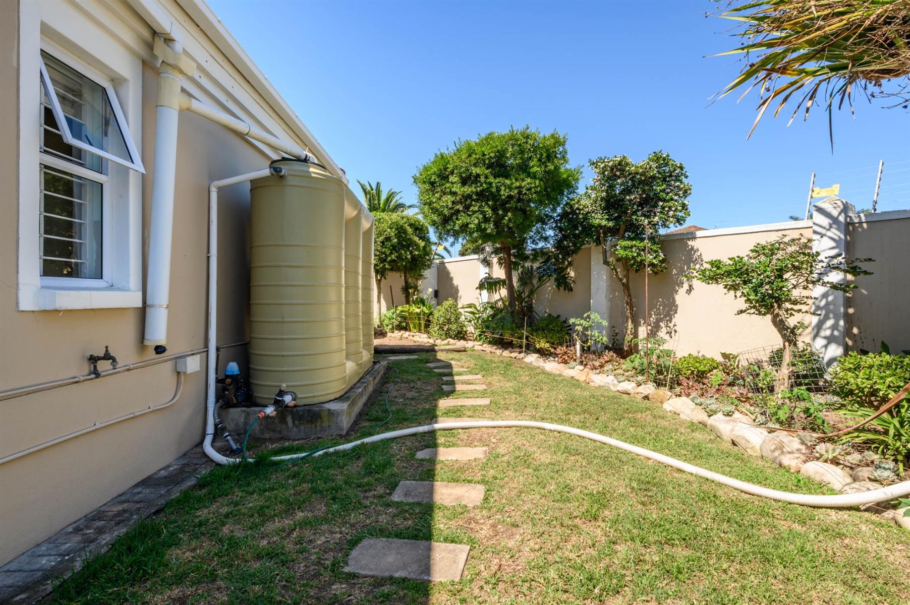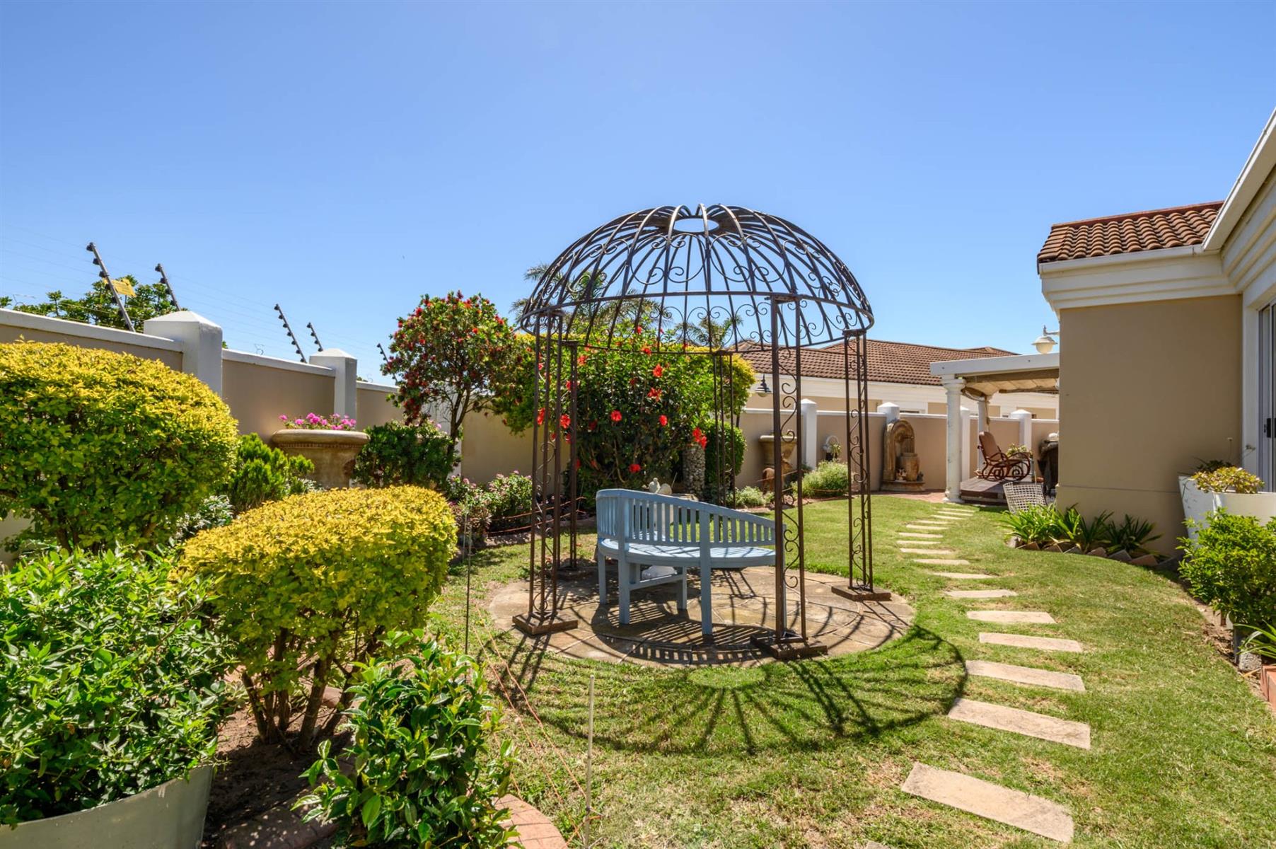 The kitchen is fitted with granite countertops, a SMEG built-in oven, and a gas hob, ideal for anyone who loves to cook. All bedrooms have built-in cupboards and sliding doors that open onto the garden, letting in plenty of light. The main bedroom has a walk-in closet and an en suite, while the full guest bathroom has both a bath and a shower.