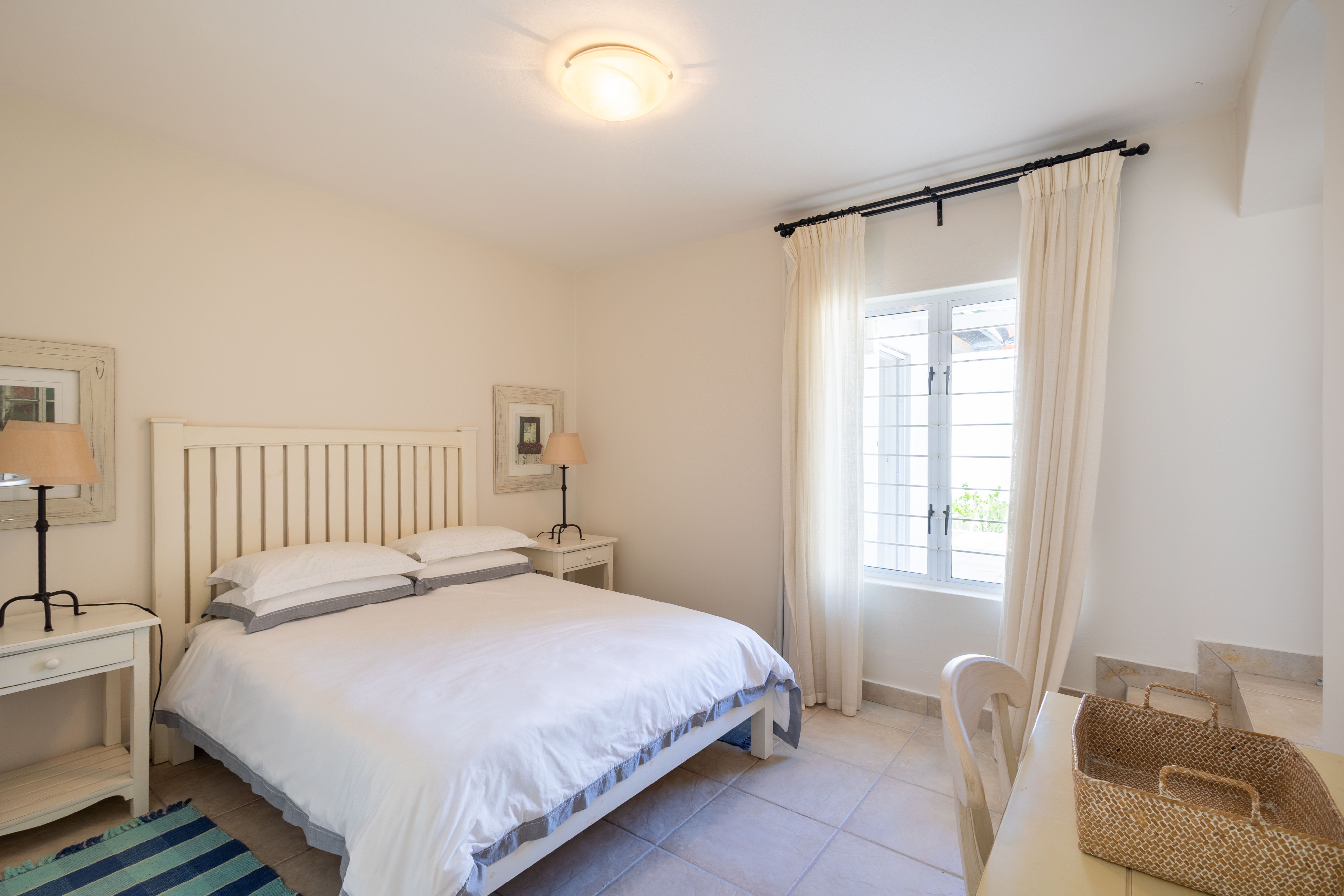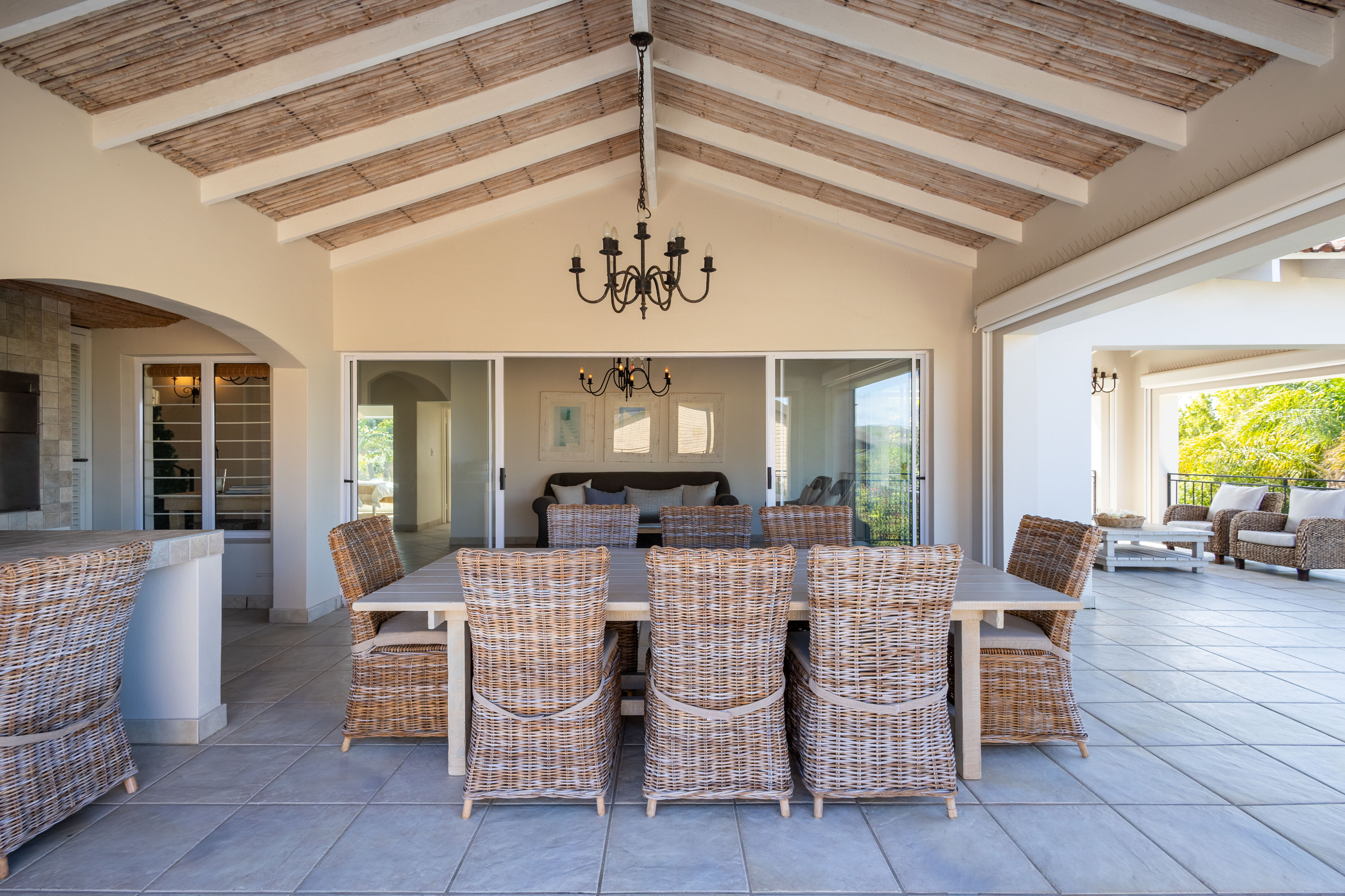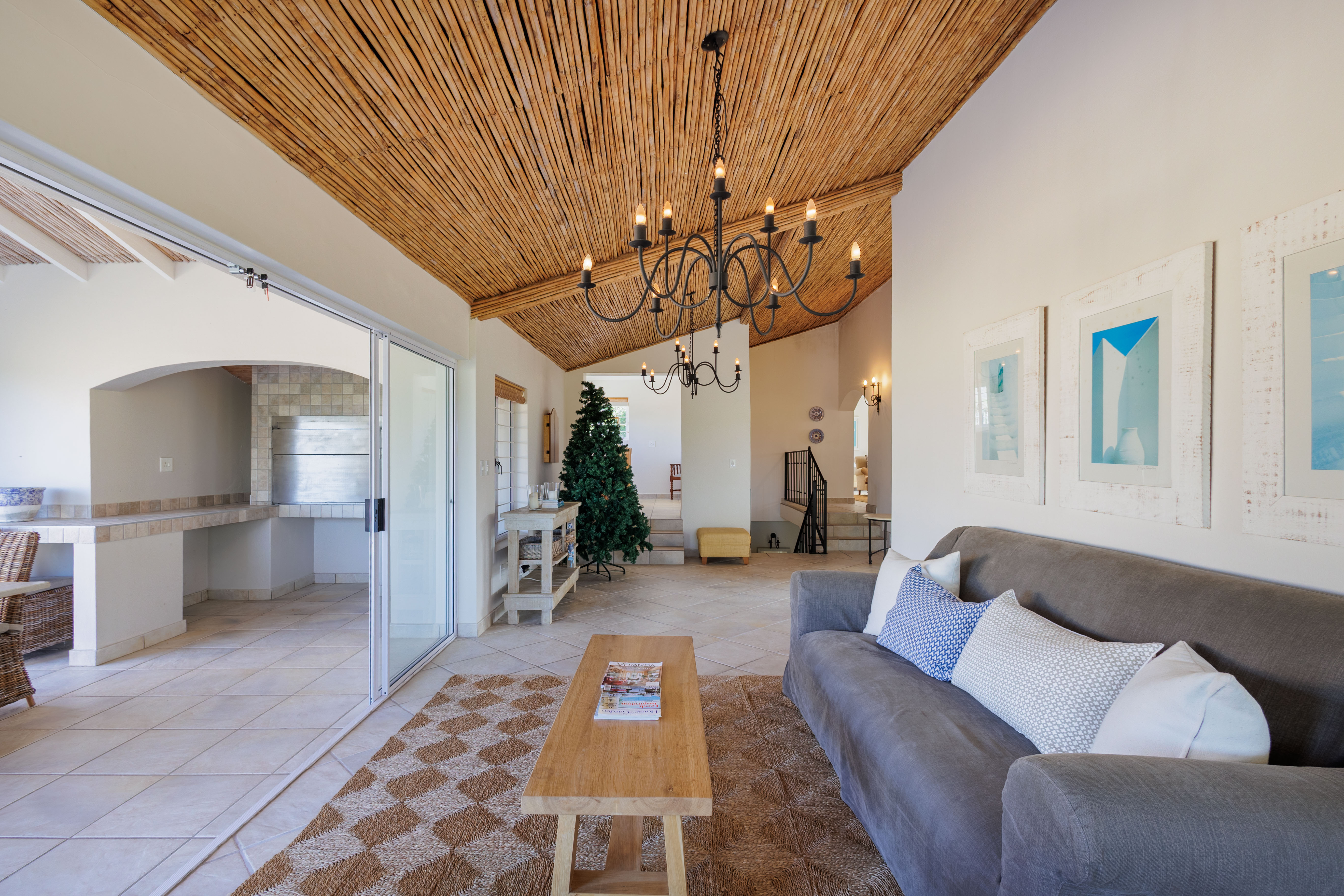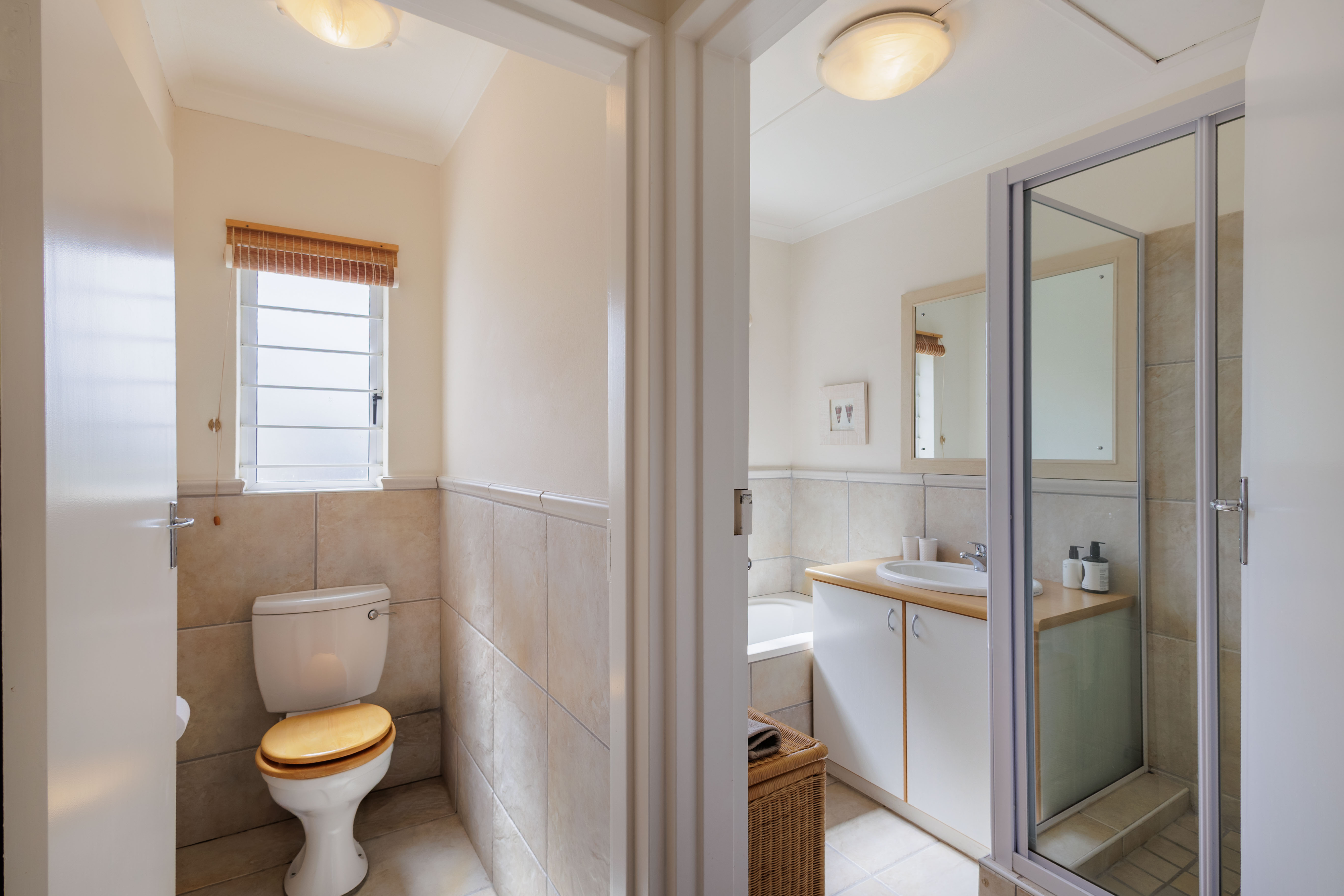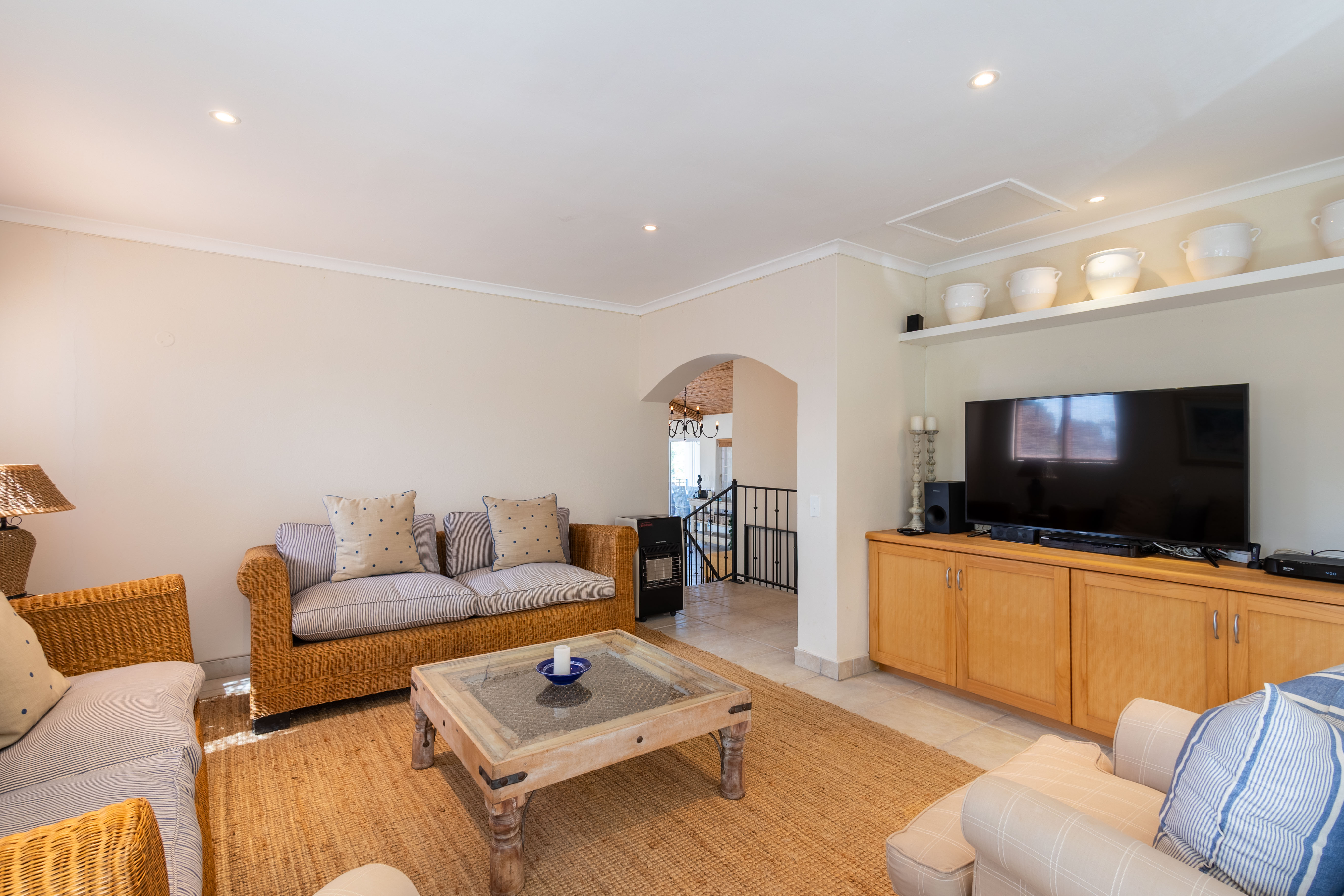 Upstairs is an open-plan sitting room and bar. Sliding doors open onto two separate patios, one featuring a built-in braai, white-painted reed ceiling and roll-down outdoor blinds. A separate TV lounge with a built-in TV unit opens onto a sunny balcony. This level includes two carpeted bedrooms with large north-facing windows and built-in cupboards, and a full bathroom with shower, bath and a separate guest loo.