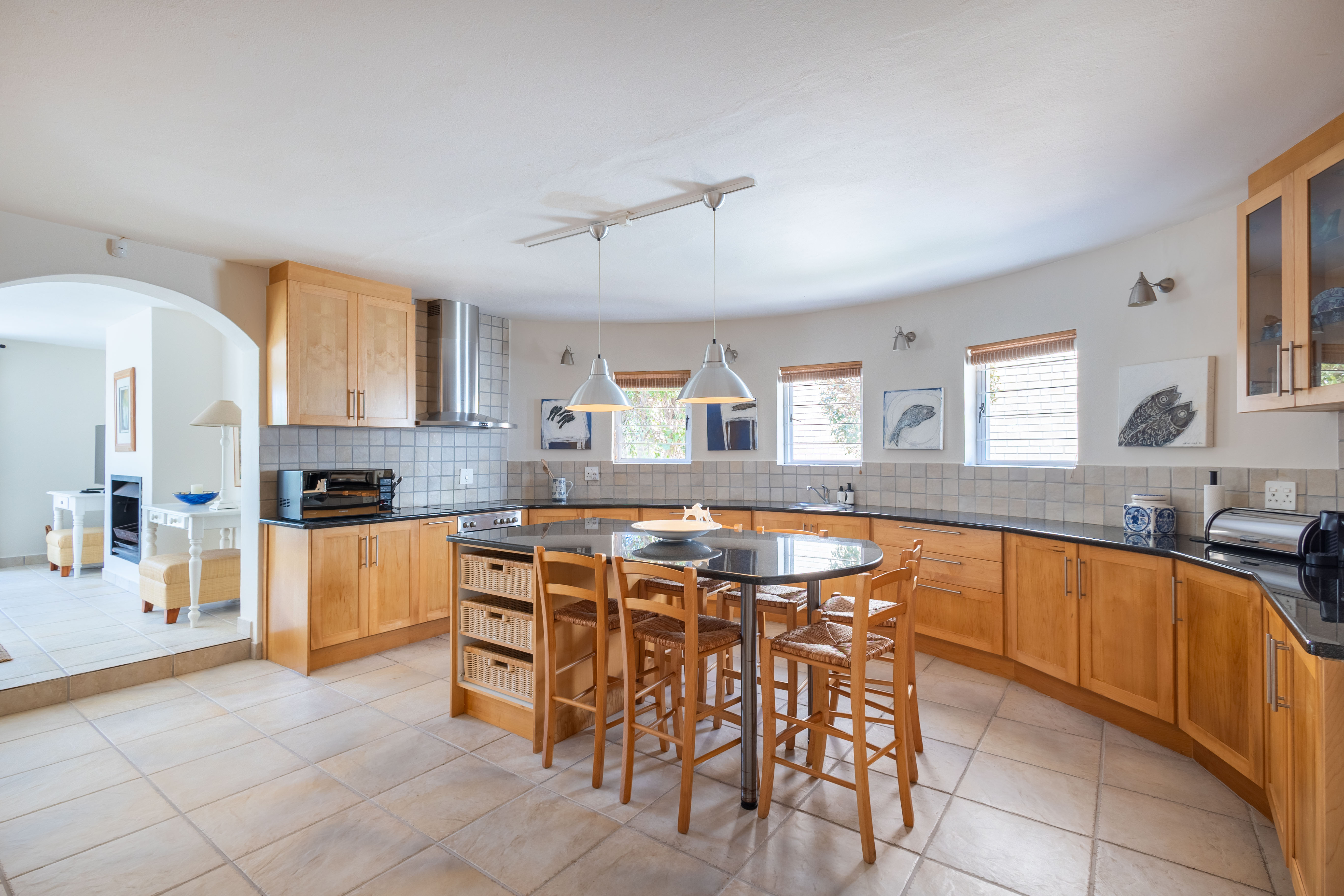 The spacious semi-open plan TV room with a cosy wood-burning fireplace, seamlessly links to the dining and well-appointed kitchen. The large kitchen has yellowwood cabinetry, granite tops, and a centre island with a breakfast bar. There is a separate laundry with space for three appliances. The large main en-suite bedroom has ample cupboard space and a full bathroom. Three additional bedrooms—one en-suite, and two sharing a full bathroom—are all carpeted and generously sized. There is a double automated garage with access to the staff accommodation. The garden is low-maintenance and ideal for those seeking a lock-up-and-go lifestyle.