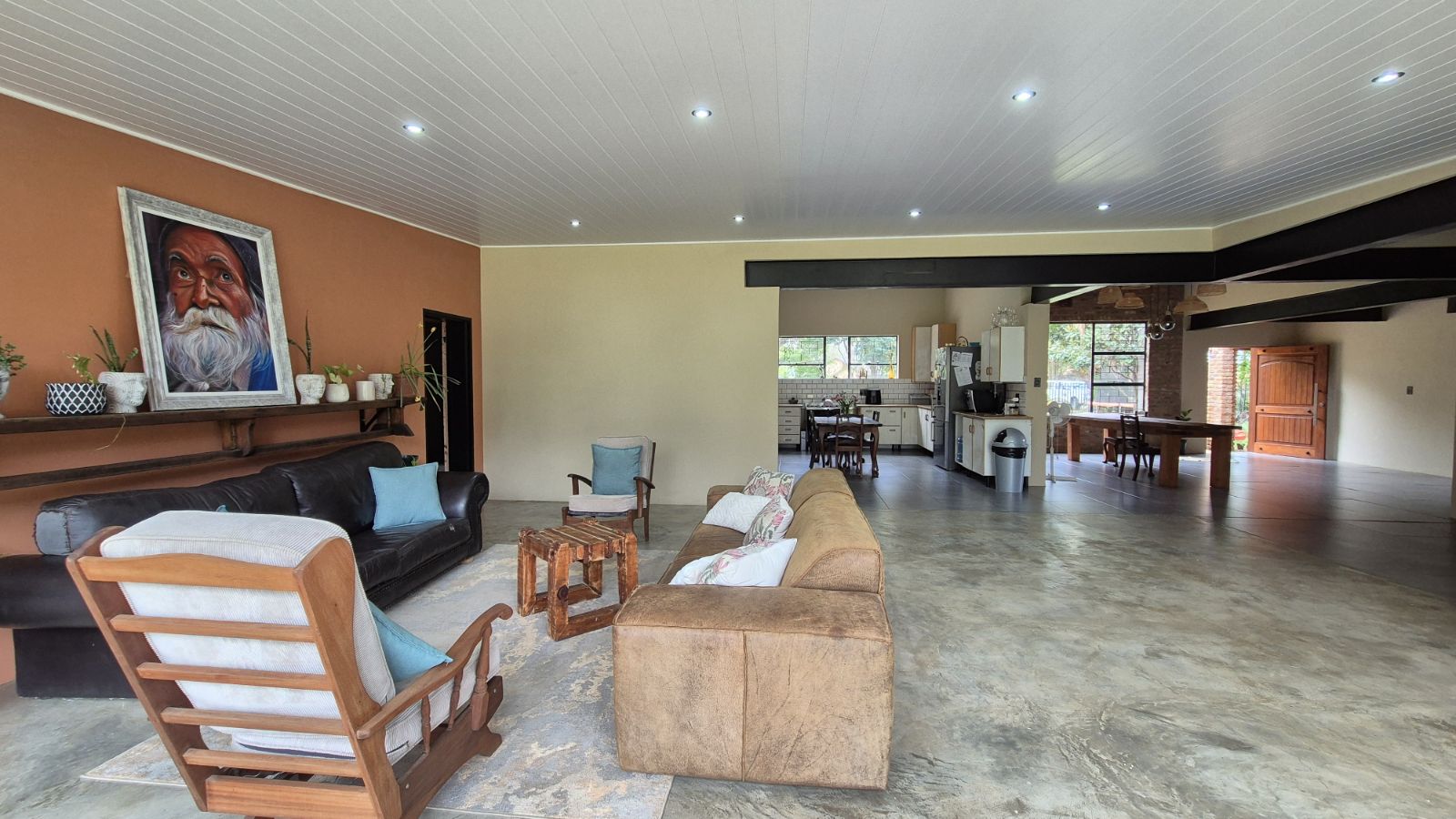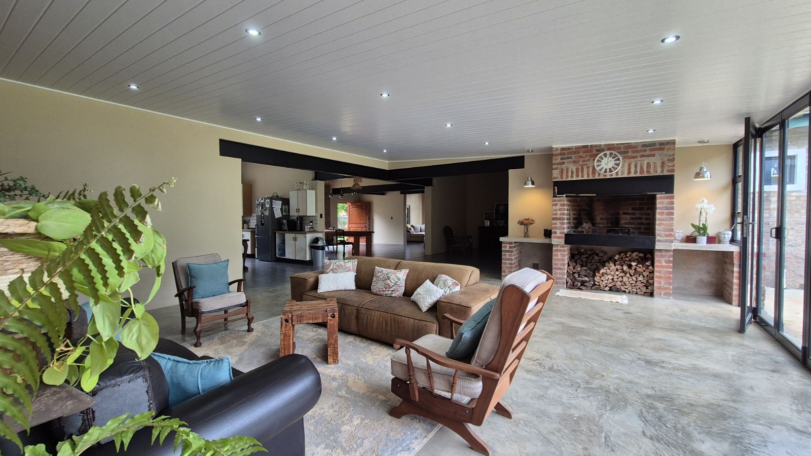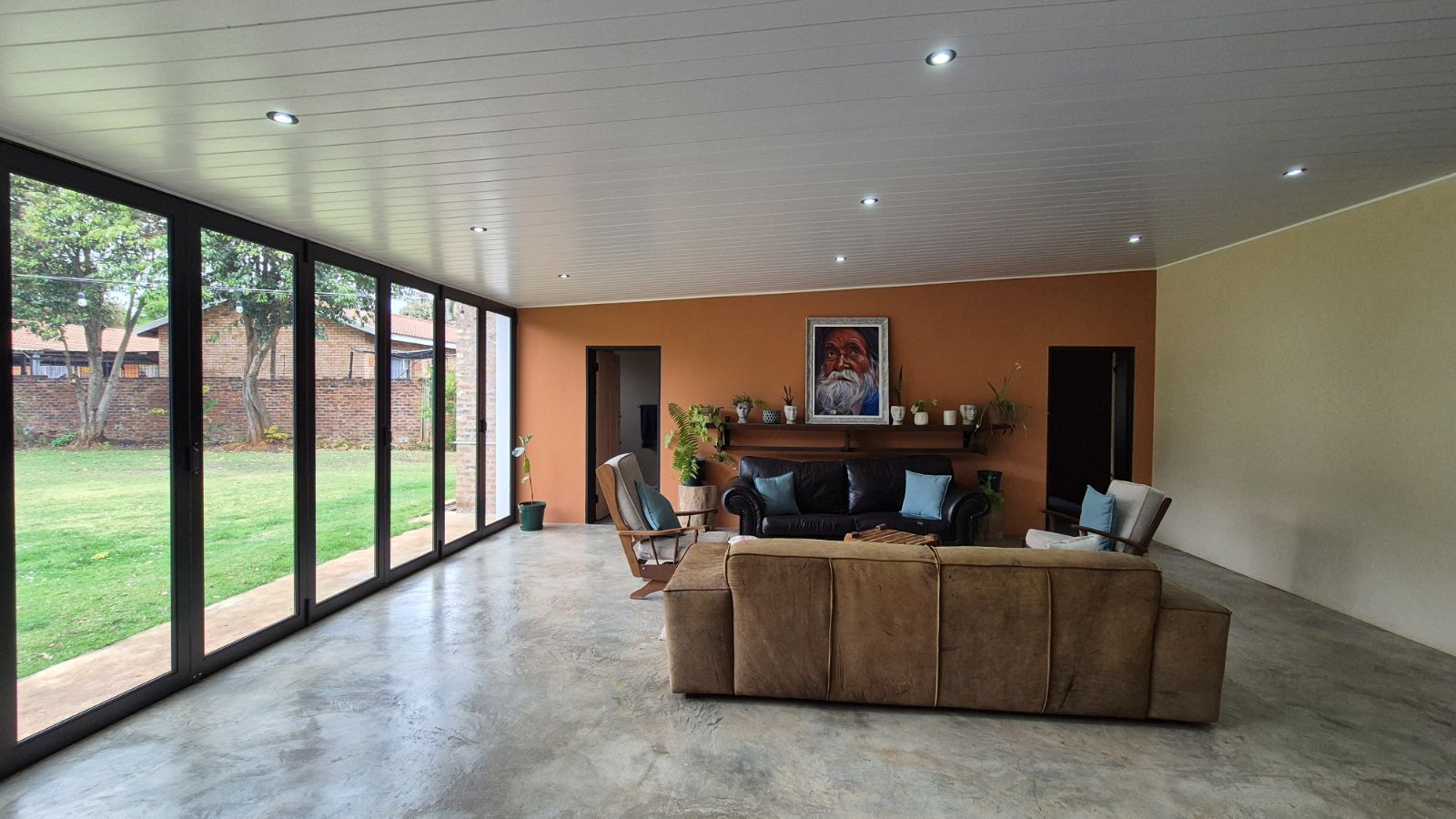 Spacious lounge with oversized windows and sliding door opening onto a patio