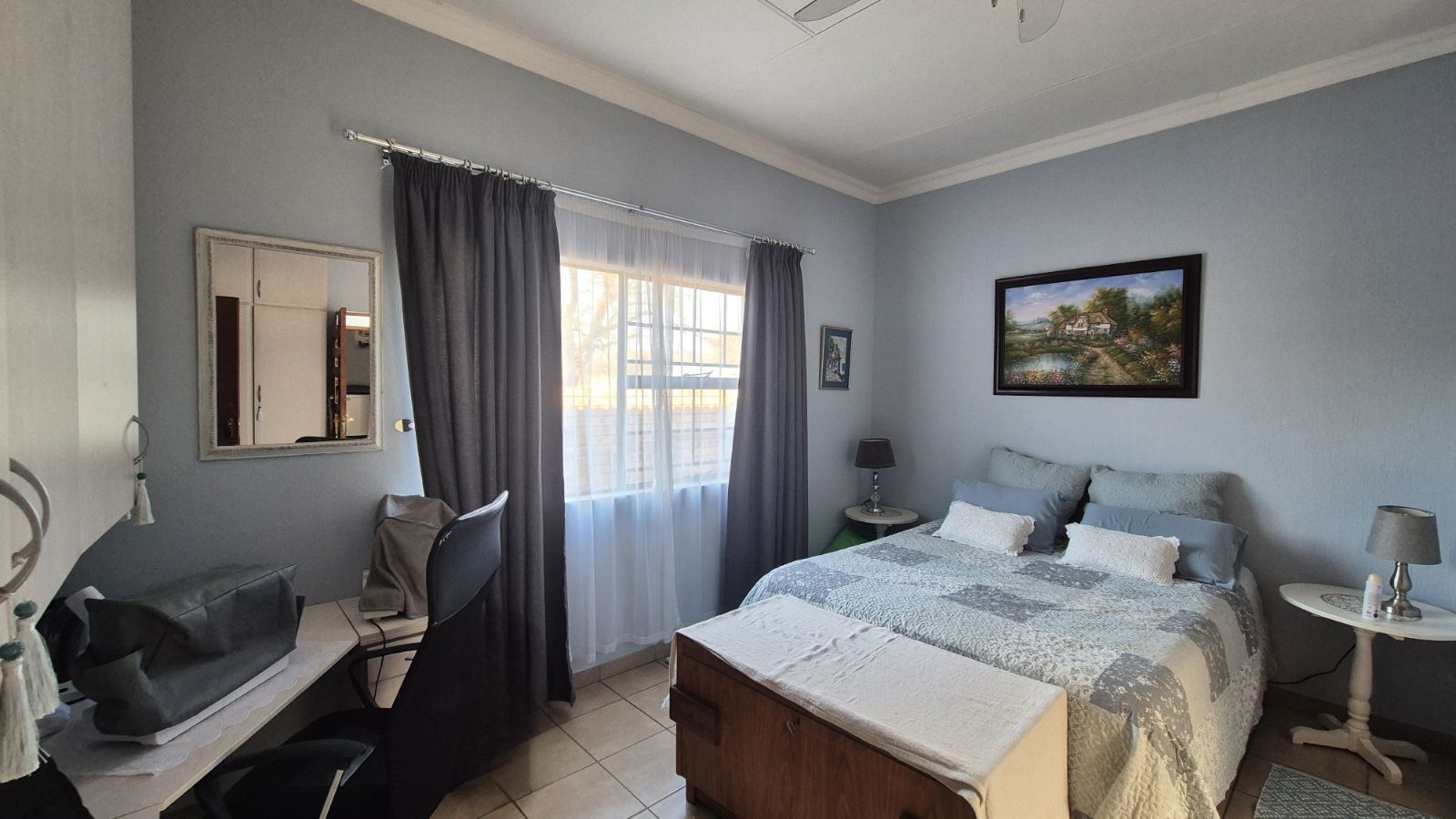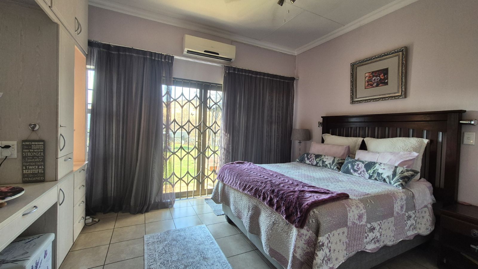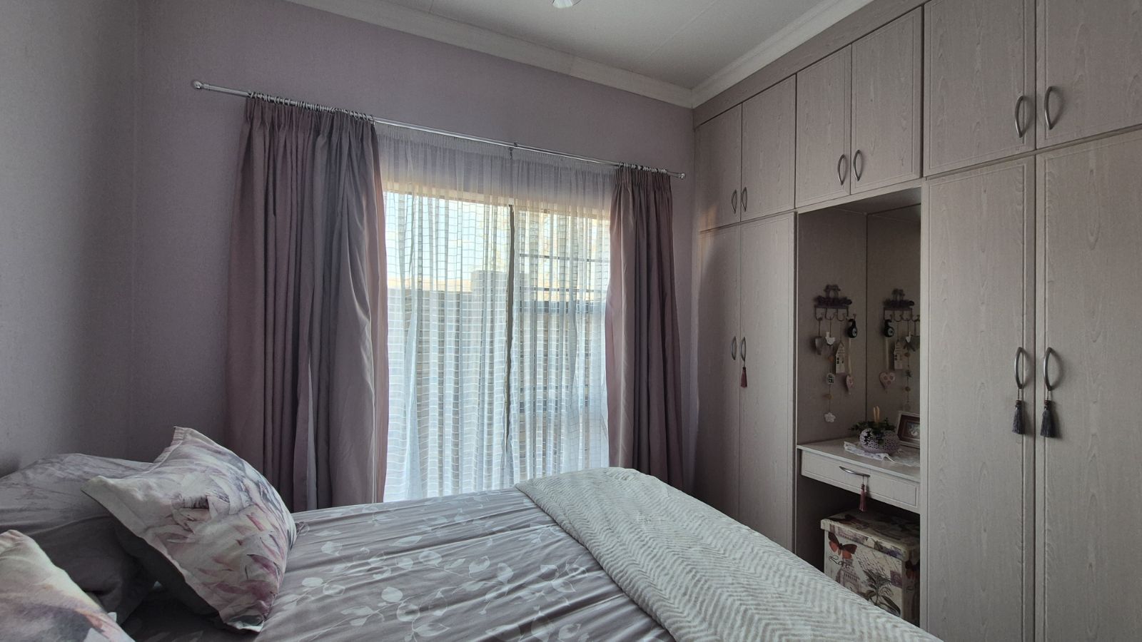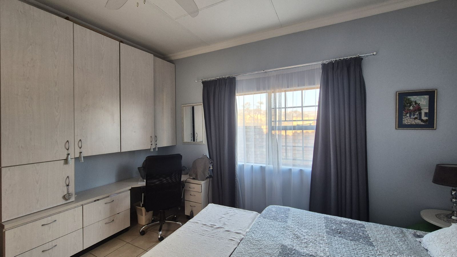 Built-in Cupboards, Fan, Curtain Rails, Tiled Floors, Double Bed, Air Conditioner, Queen Bed