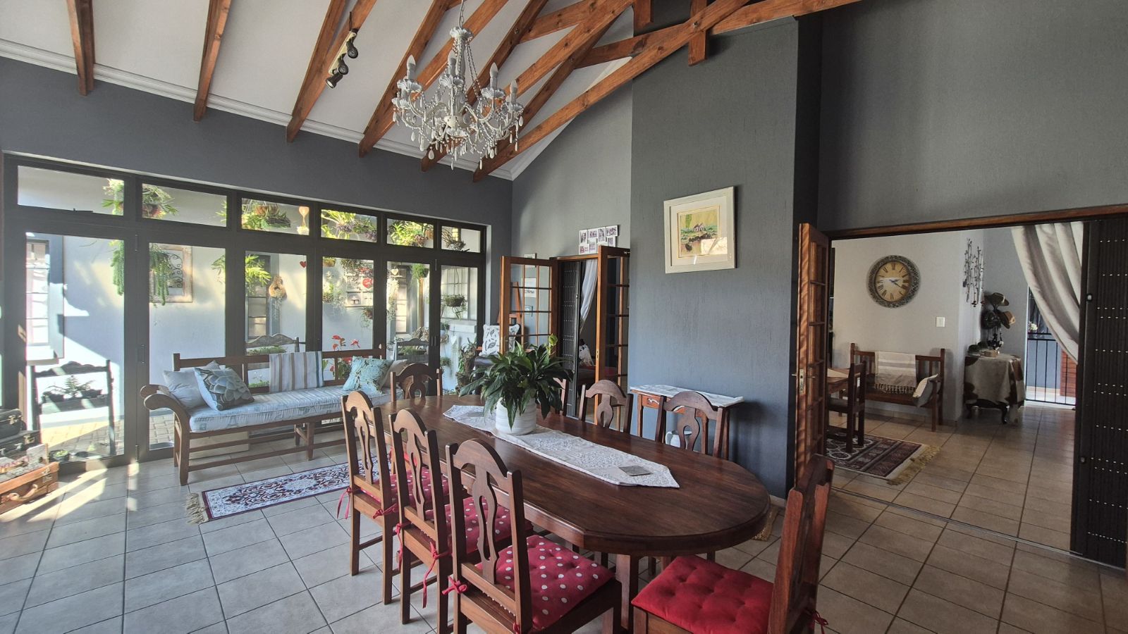 Family / Entertainment Room – Impressive exposed trusses, beautiful wooden finishes, and glass fold-up doors leading to the back yard.