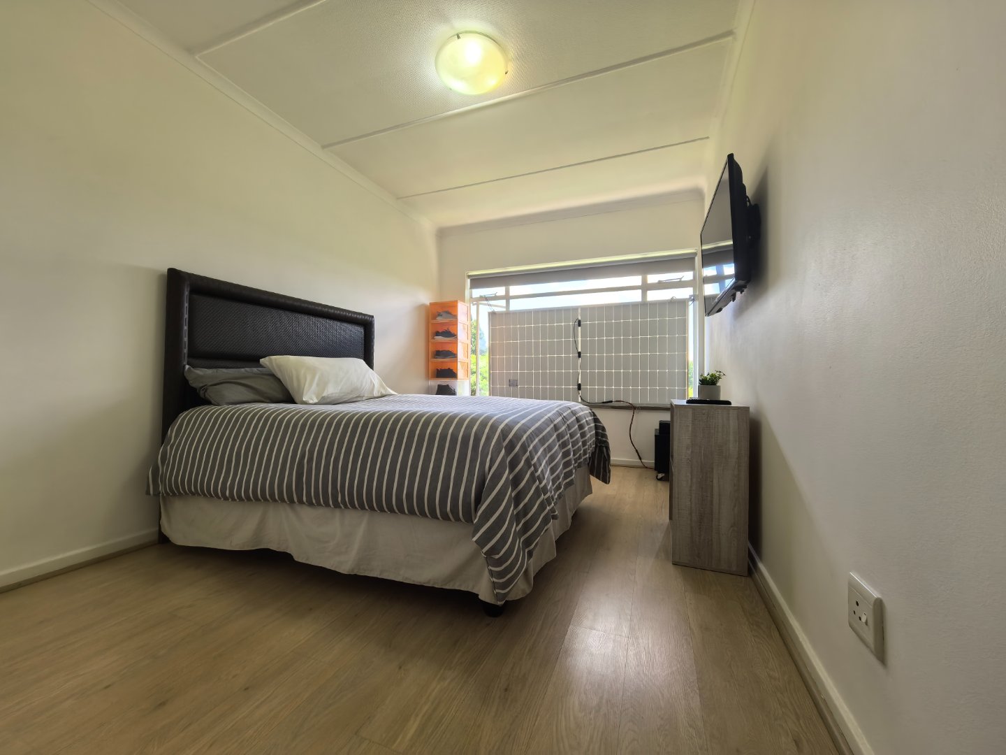 The bedroom offers a cozy retreat, complemented by tiled flooring that extends seamlessly throughout the apartment, adding to its clean and contemporary aesthetic.
