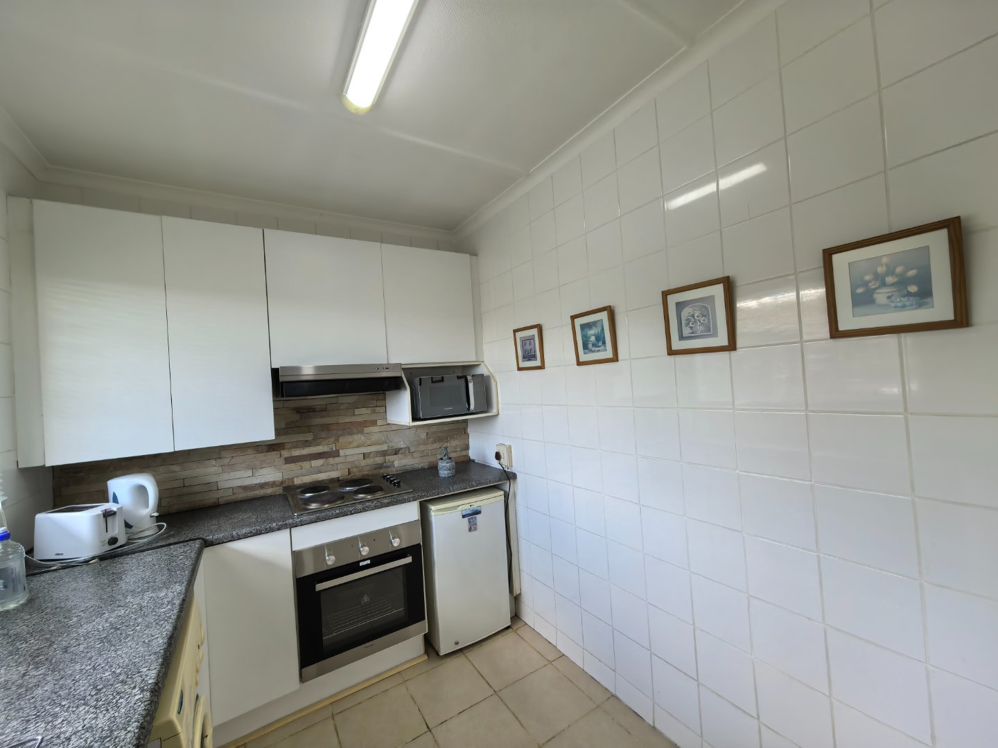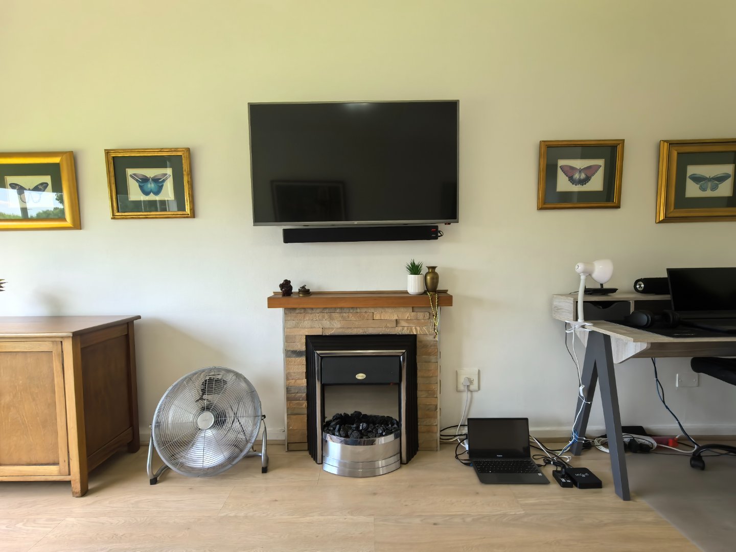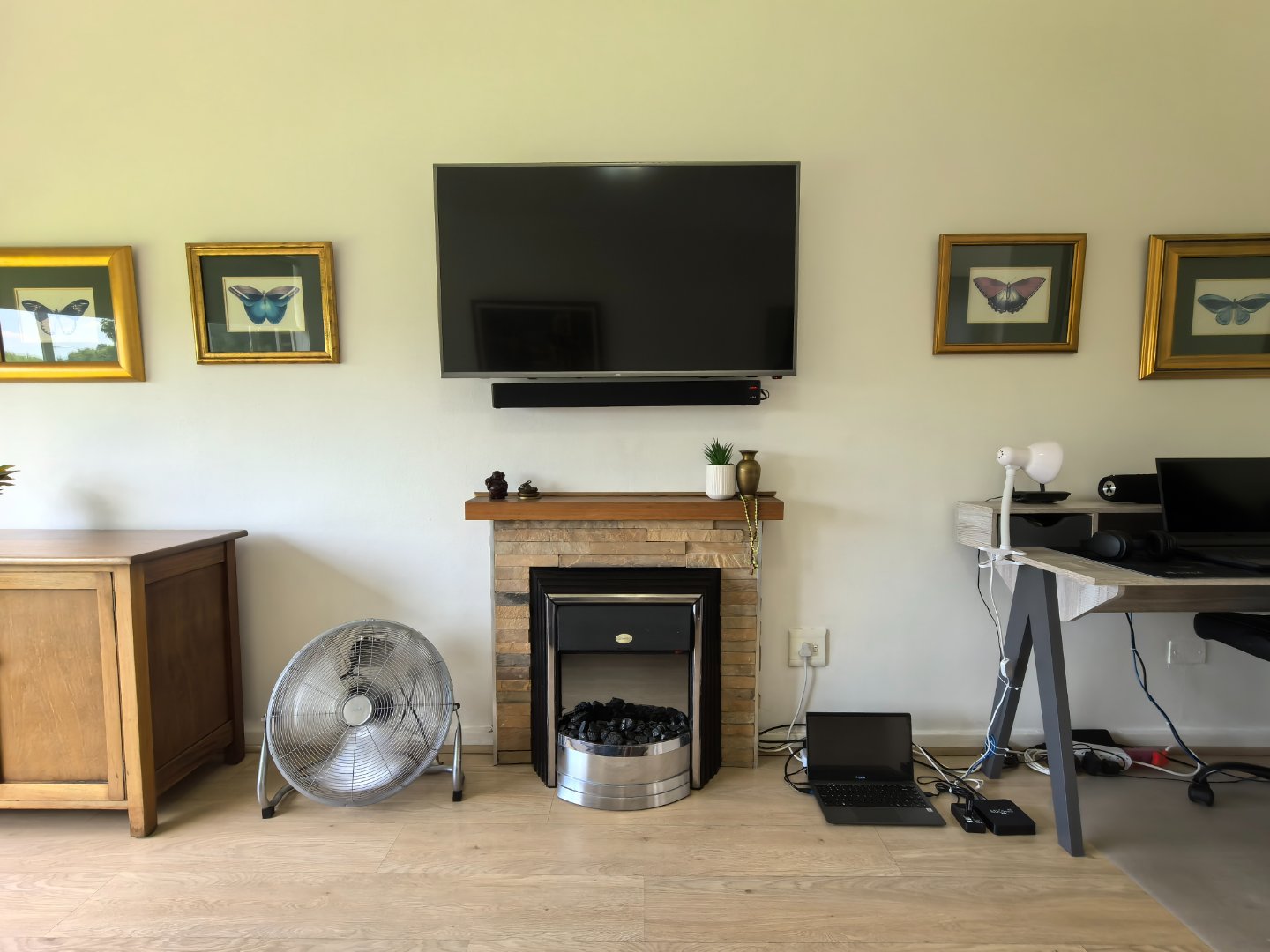 The spacious living area features beautiful laminated flooring, built in electric fire place, adding a modern touch while ensuring easy maintenance. The kitchen is neat and well-appointed, complete with decorative accents around the hob, creating a chic focal point. There's ample space for all your appliances, making daily living both convenient and efficient.