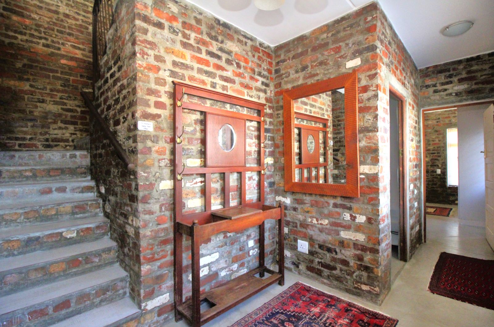 The home showcases beautiful brick construction with warm, varied tones that exemplify the village's sustainable building philosophy. The front features this attractive upper-level balcony with white railings, while thoughtfully landscaped gardens with colourful plantings and natural stone elements grace your 109 square meter erf. The solar geyser handles hot water efficiently, aligning with the village's practical approach to sustainability.