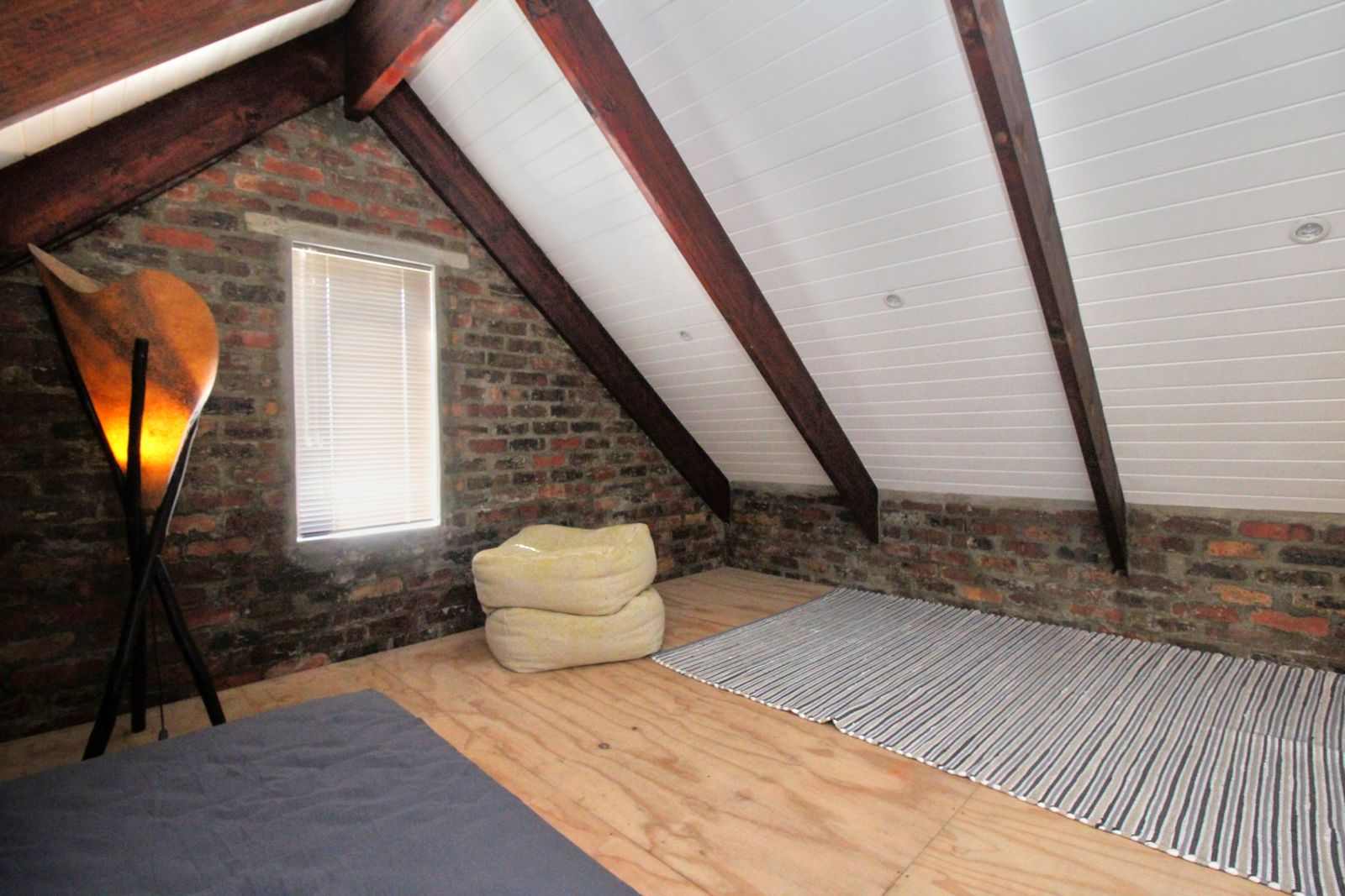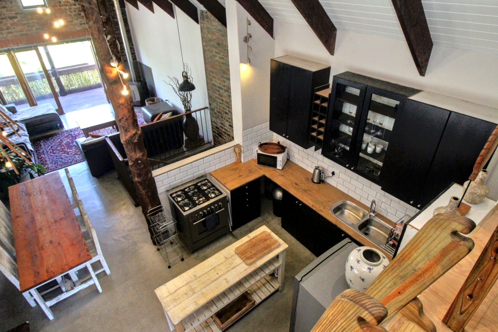 The heart of the home is a stunning open-plan kitchen that perfectly balances rustic character with modern functionality. Soaring vaulted ceilings showcase exposed wooden beams and white-painted planks, while original brick walls create warmth and texture. A dramatic exposed wooden support beam adds architectural drama to the space. The kitchen features sleek dark and moody cabinetry with wooden countertops, complemented by classic white subway tile backsplash. A rustic wooden island provides additional prep space and storage, while the gas stove aligns perfectly with the village's sustainable energy approach. The thoughtful layout make this a cook's dream.
