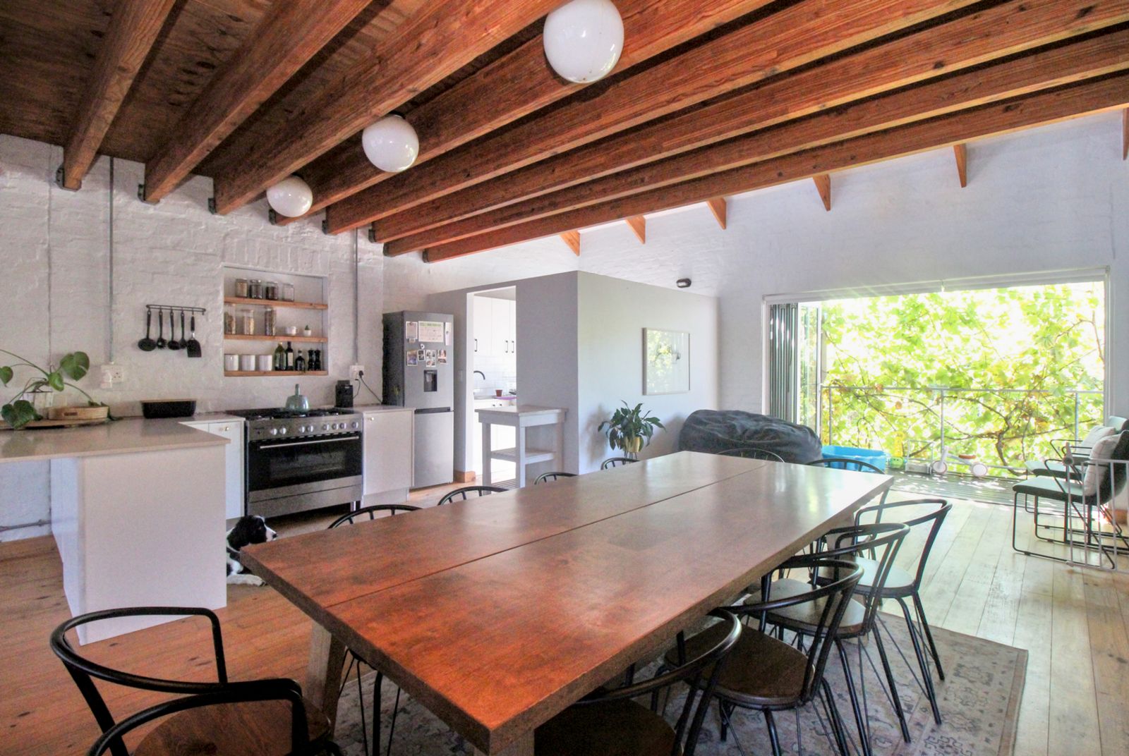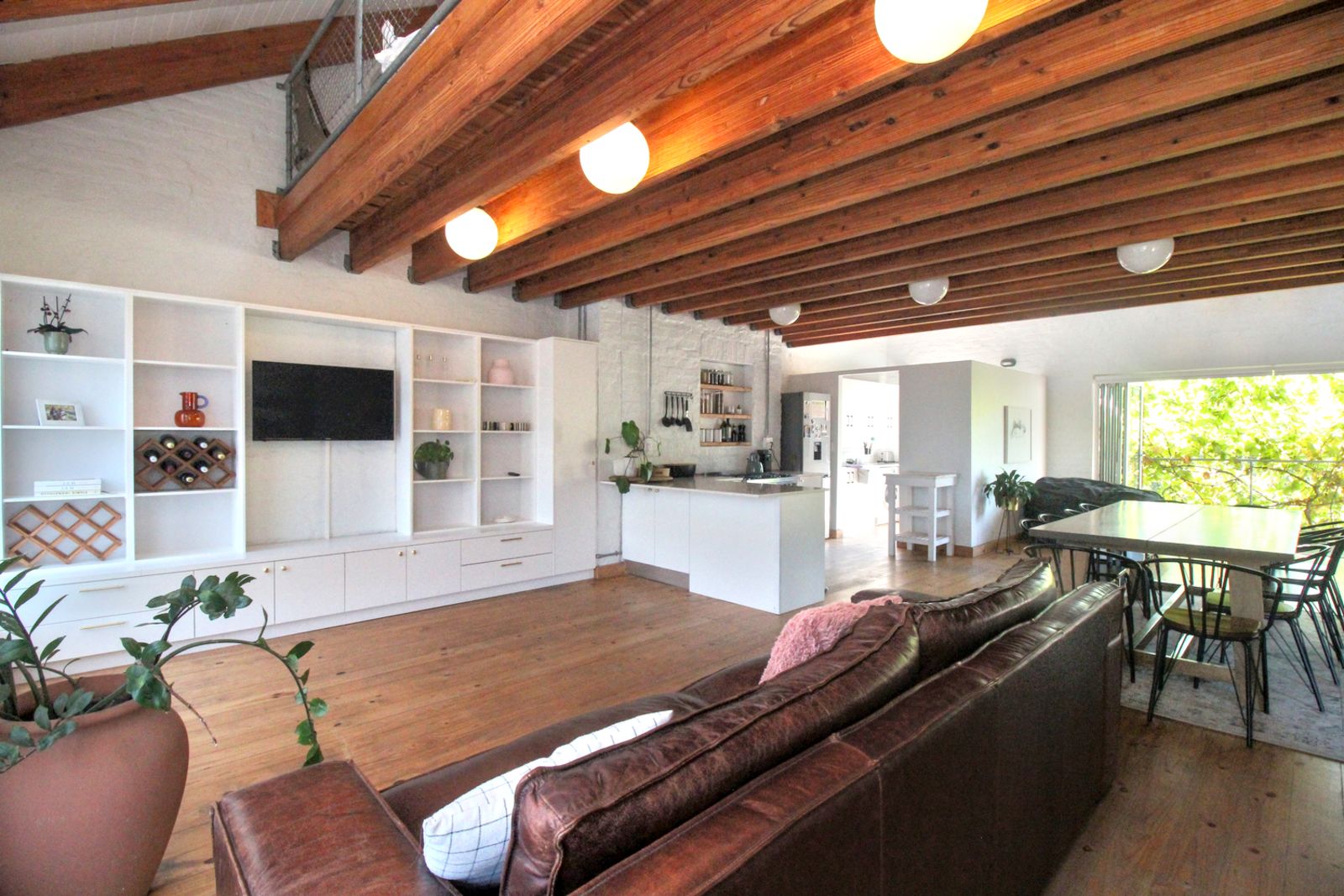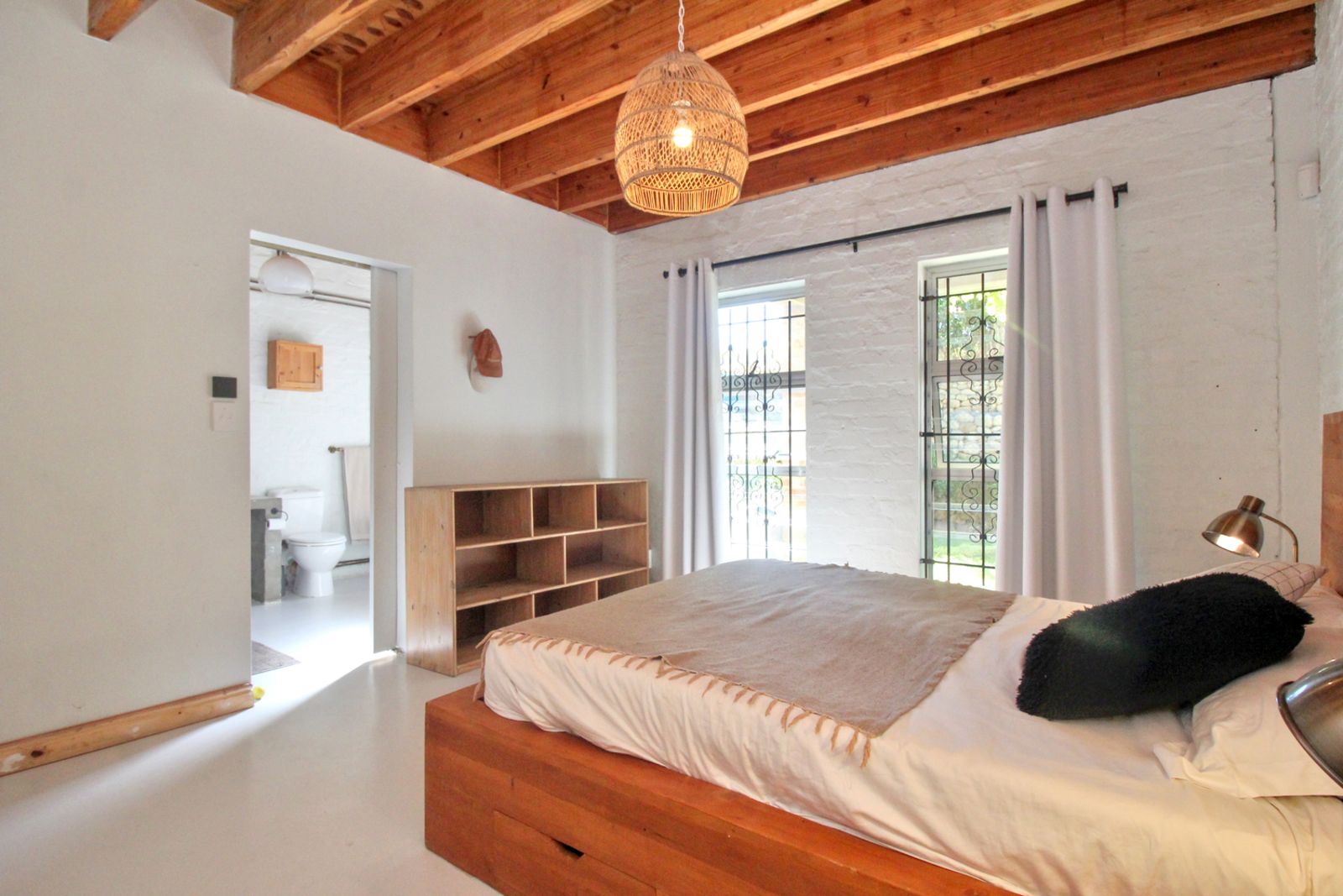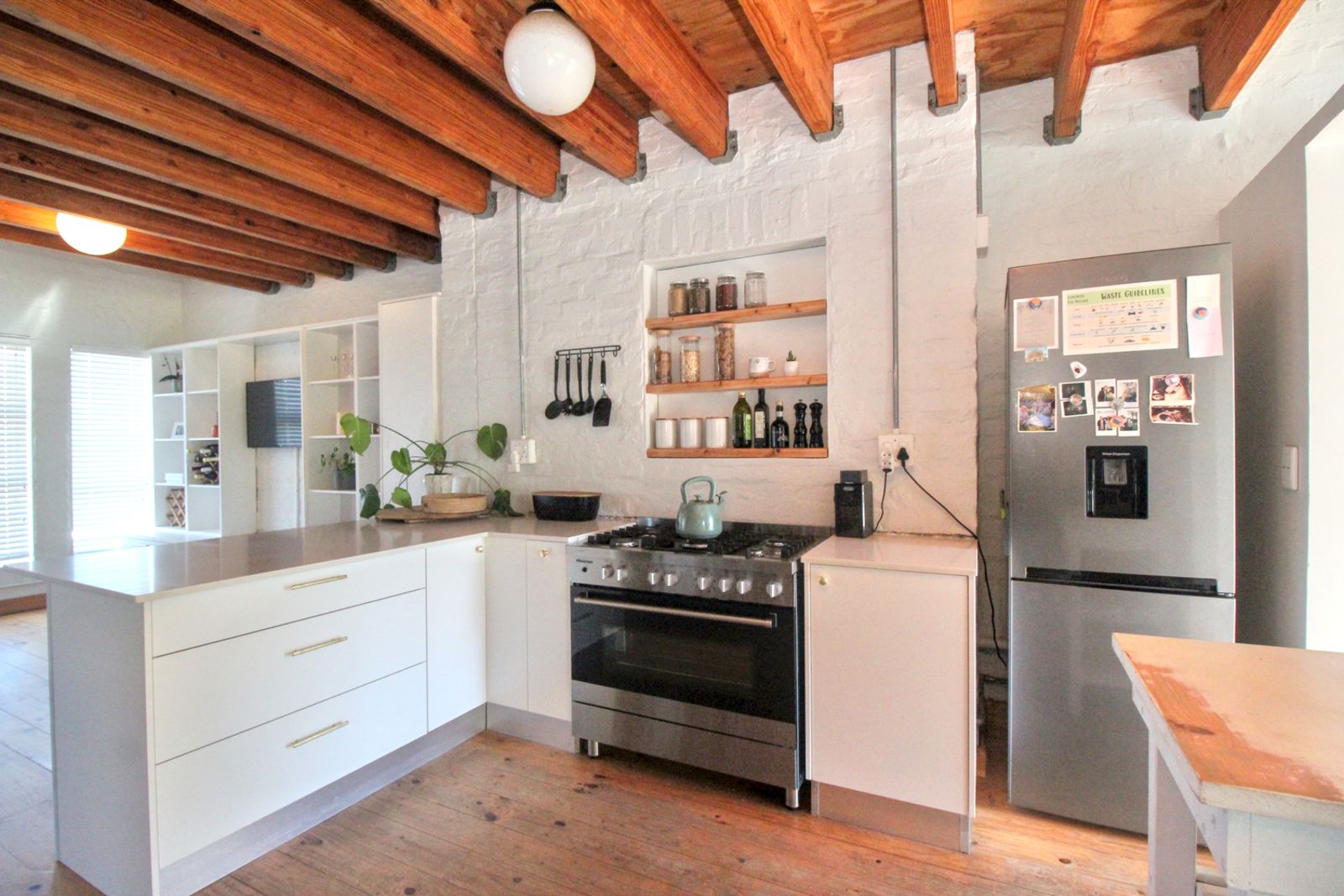 Exposed timber beams and natural wood floors bring warmth and character. White brick walls and open shelving keep the space bright and uncomplicated. The updates were done with a light hand, so the home feels current, but still rooted in its setting.
