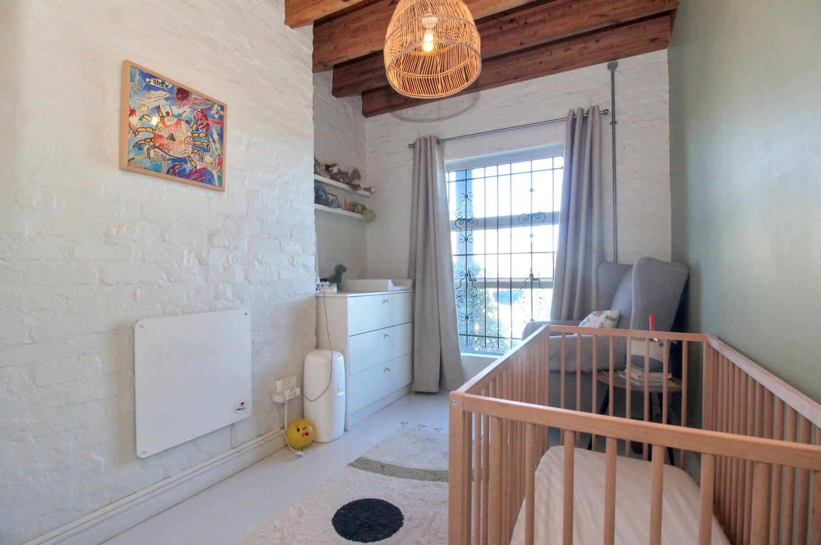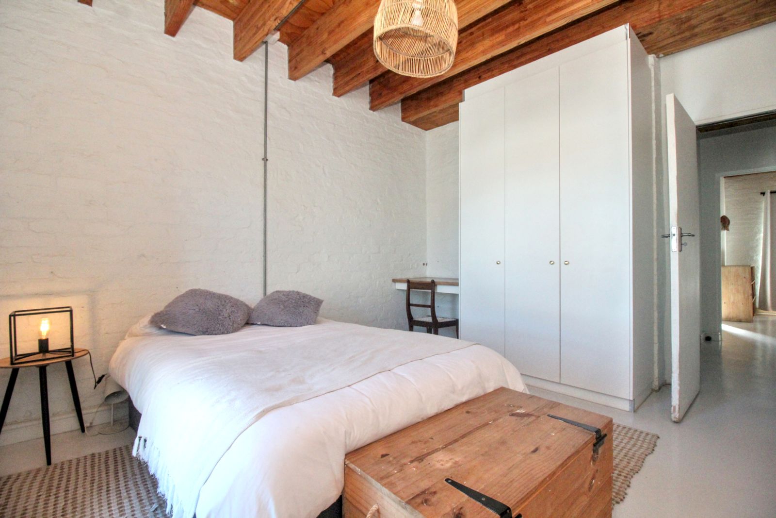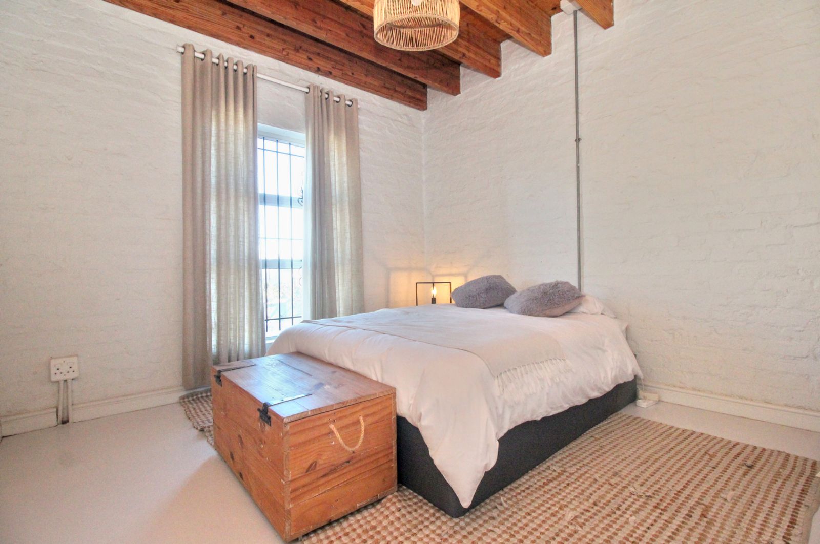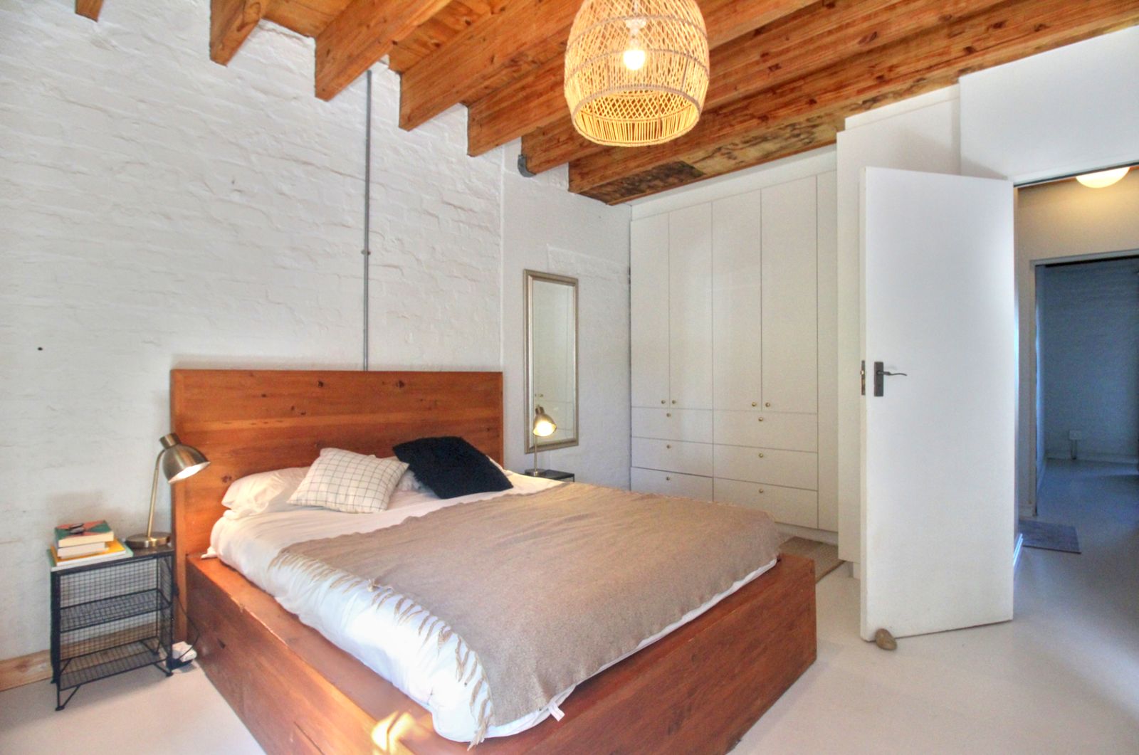 Exposed timber beams and natural wood floors bring warmth and character. White brick walls and open shelving keep the space bright and uncomplicated. The updates were done with a light hand, so the home feels current, but still rooted in its setting.