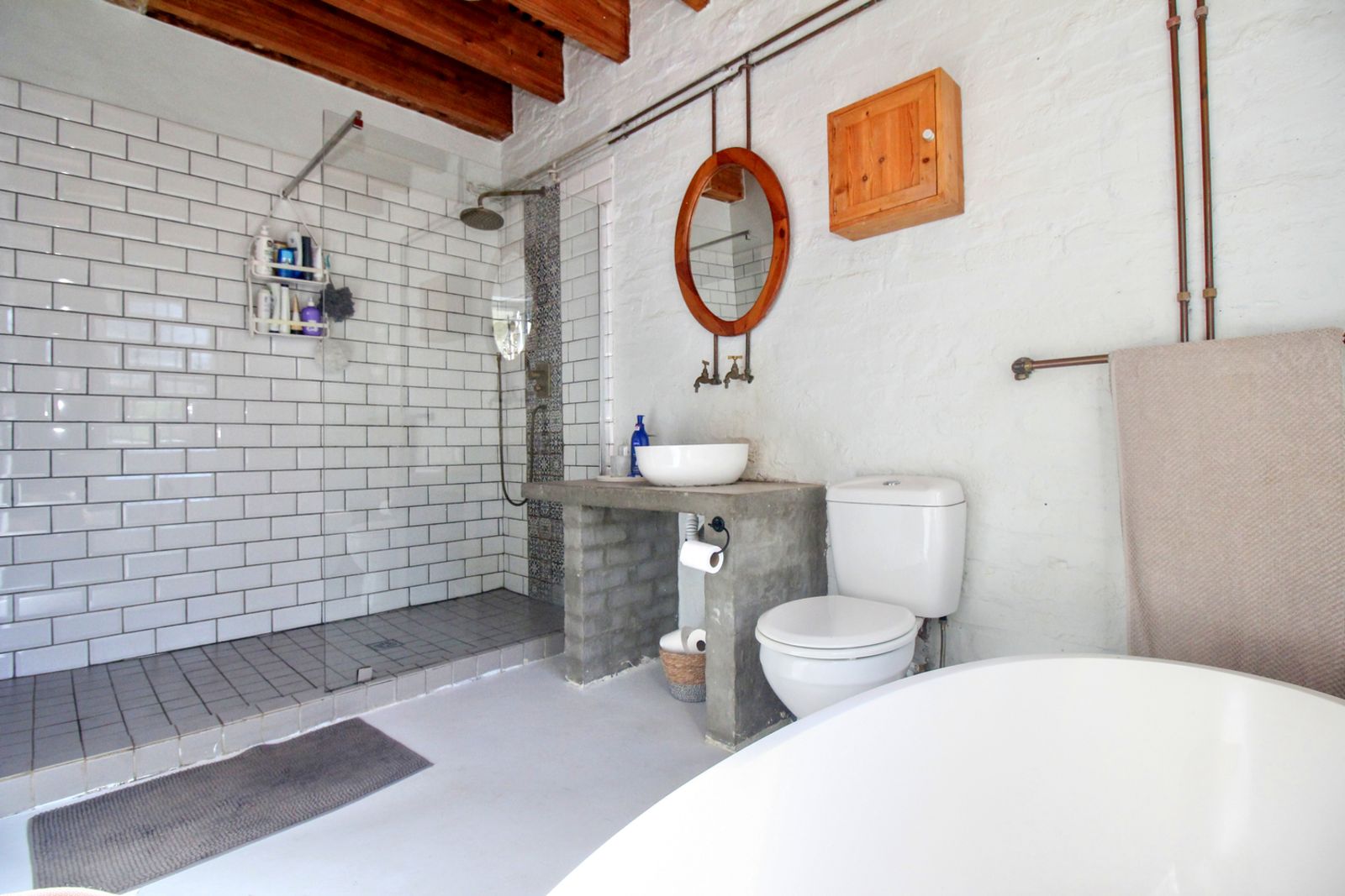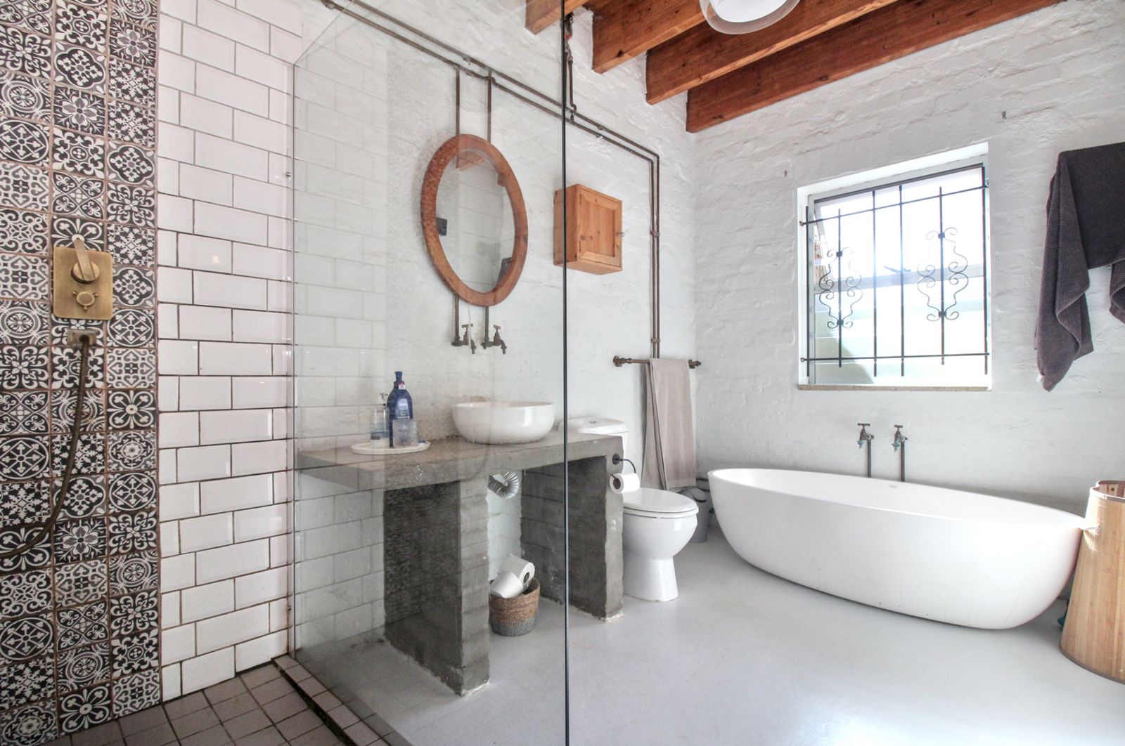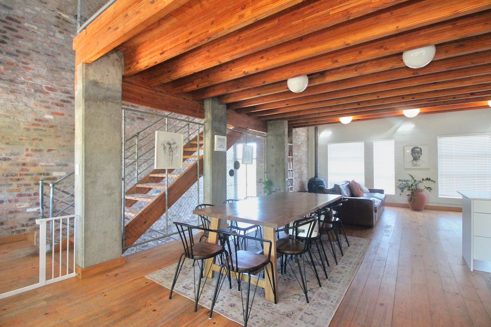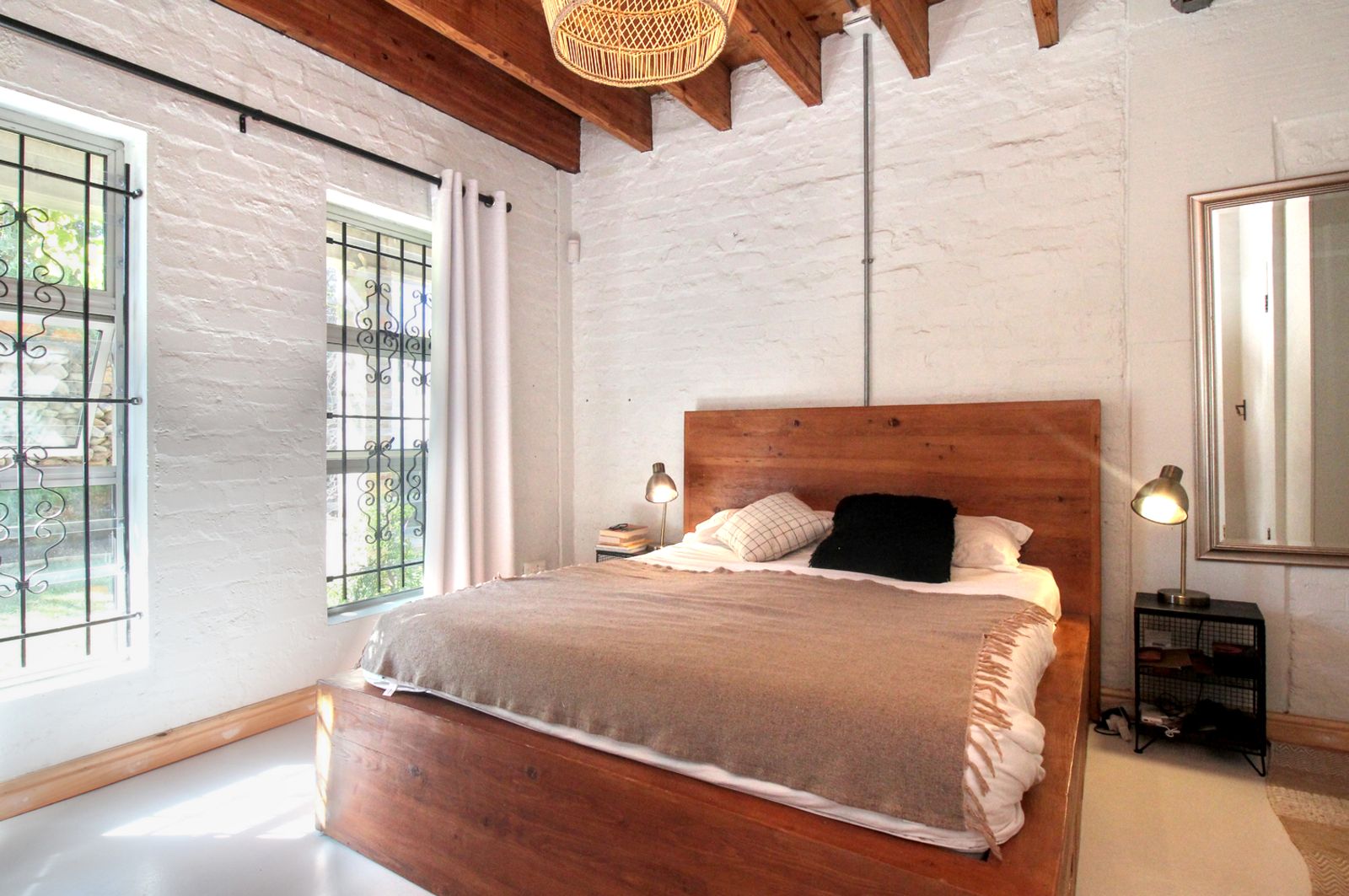 Exposed timber beams and natural wood floors bring warmth and character. White brick walls and open shelving keep the space bright and uncomplicated. The updates were done with a light hand, so the home feels current, but still rooted in its setting.