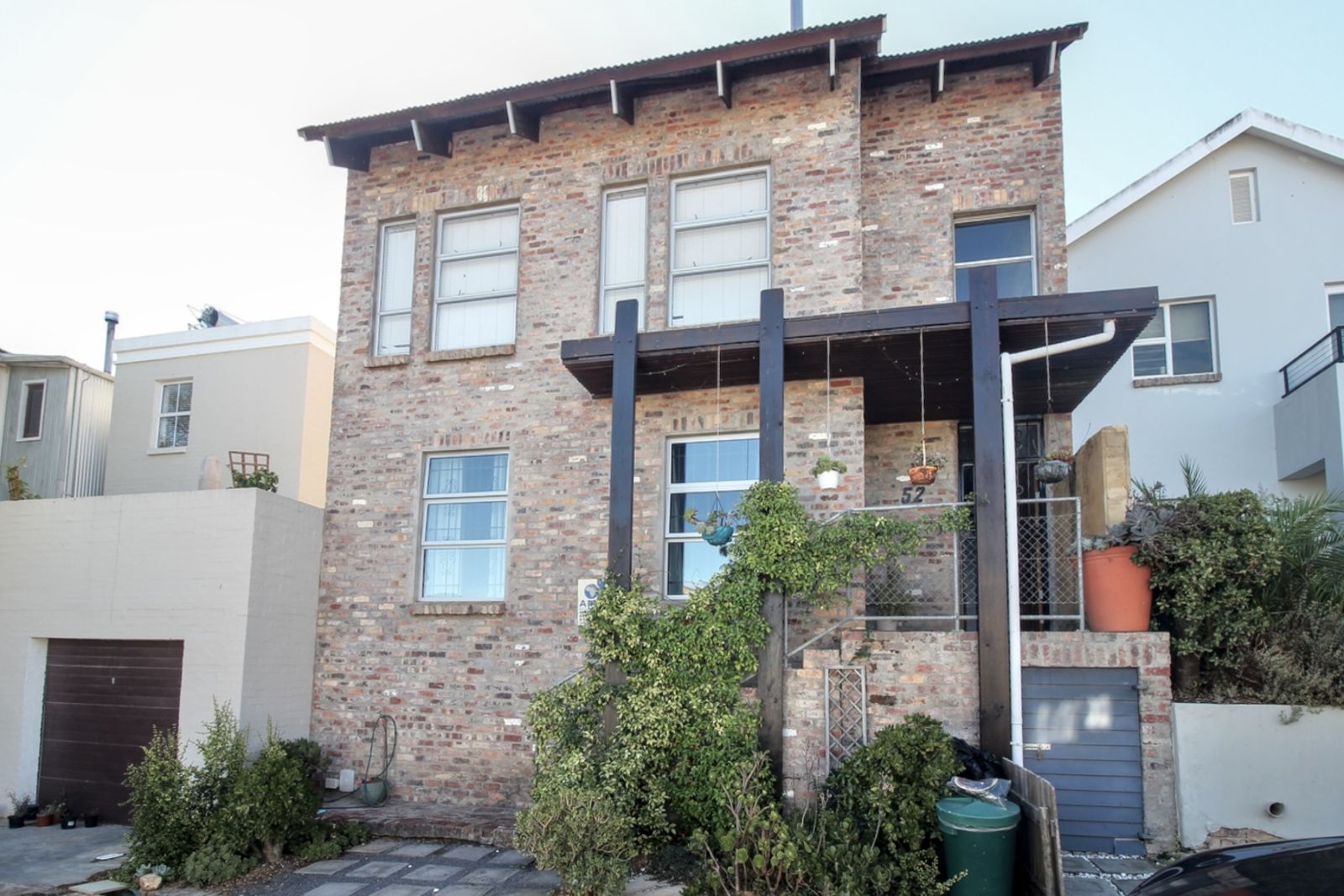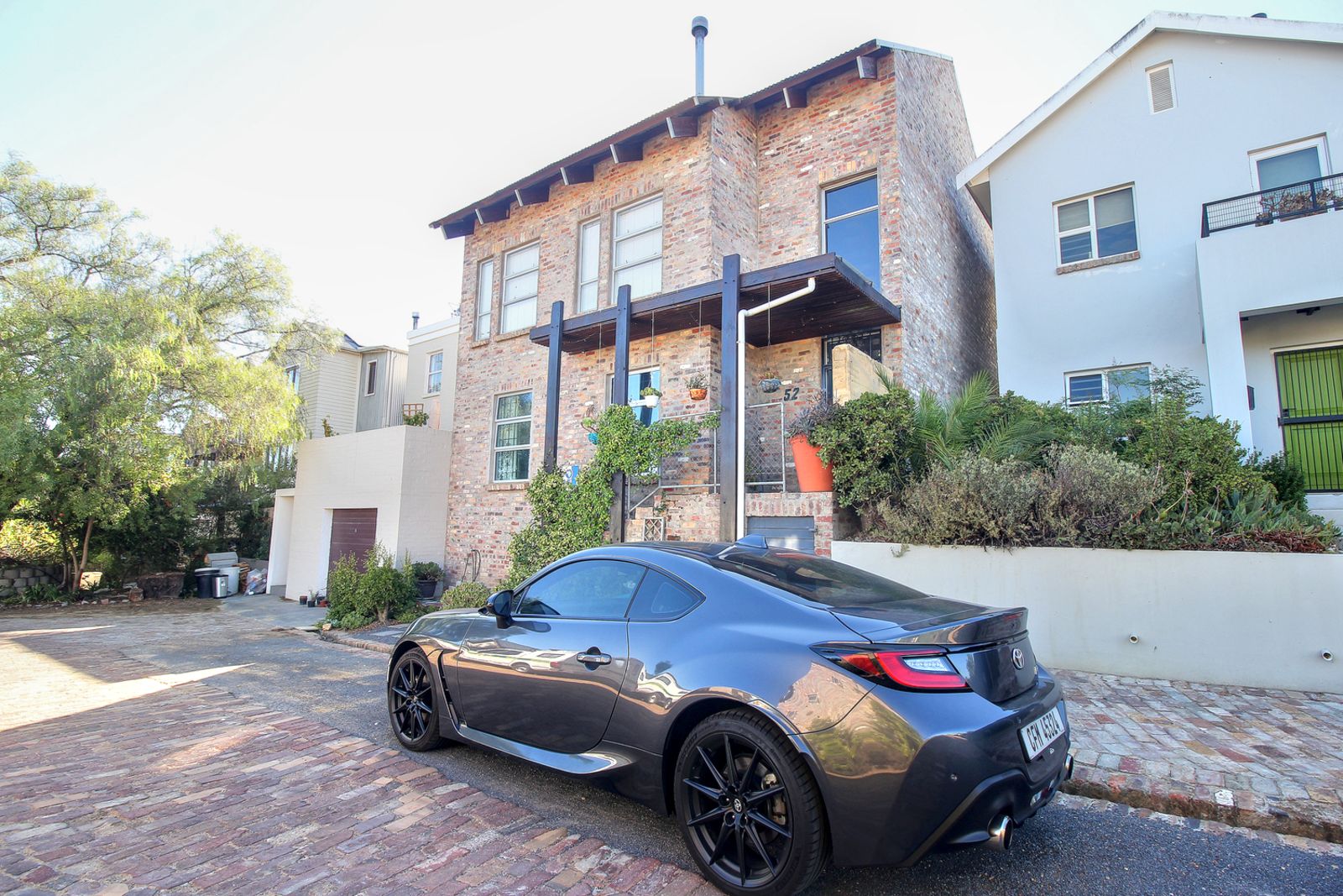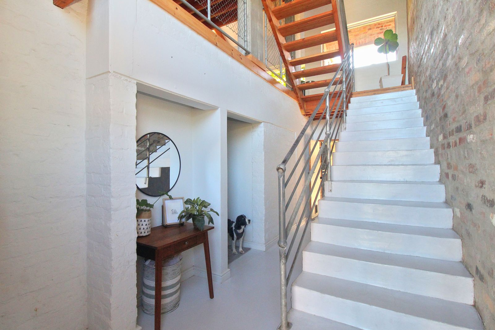 From the street, it presents as architectural and grounded, with exposed brick, strong proportions, and a clean stairway up to the entrance.