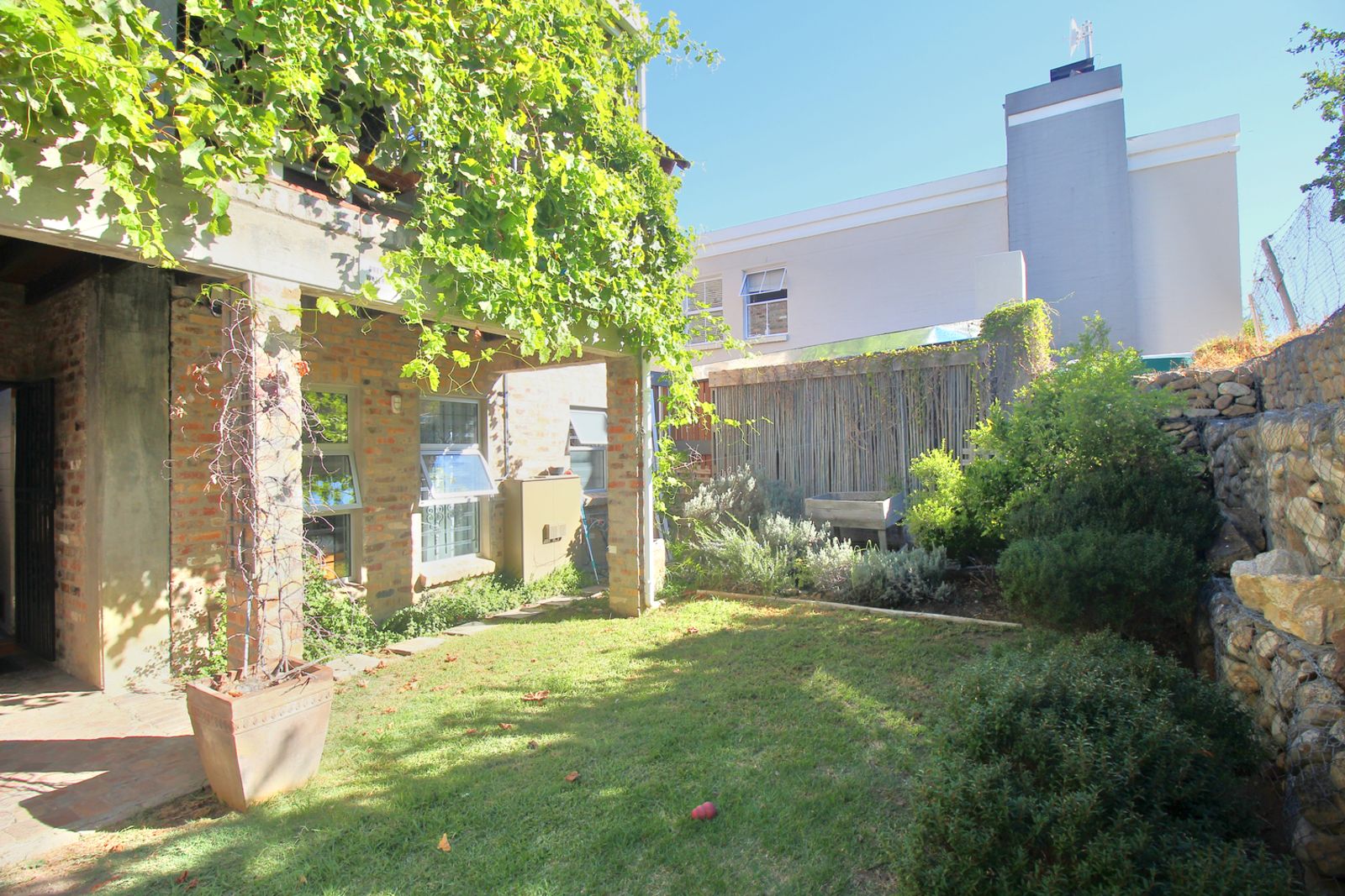 The layout works exceptionally well, with clear separation between bedrooms, living spaces, and the flexible top floor. With all three bedrooms positioned downstairs, the sleeping spaces stay private and family life stays practical. The main bedroom is en suite, with a second bathroom serving the remaining two bedrooms. This level opens directly to an enclosed back garden that is quaint, pet friendly, and genuinely functional, the kind of outdoor space that buyers quickly realise is difficult to secure in Stellenbosch once they start comparing options in this price bracket.