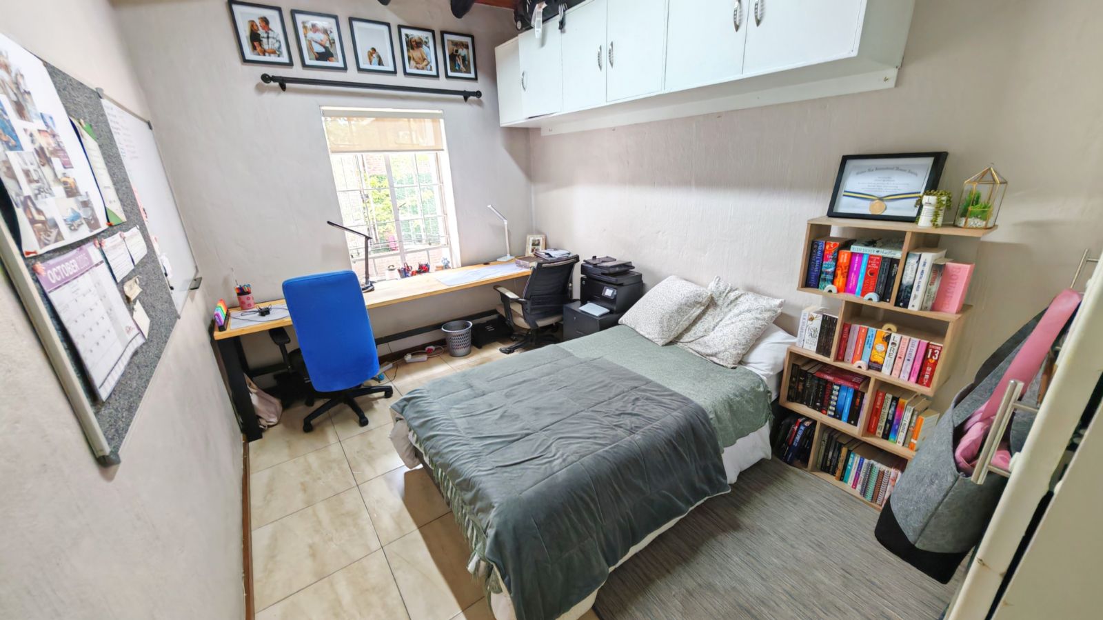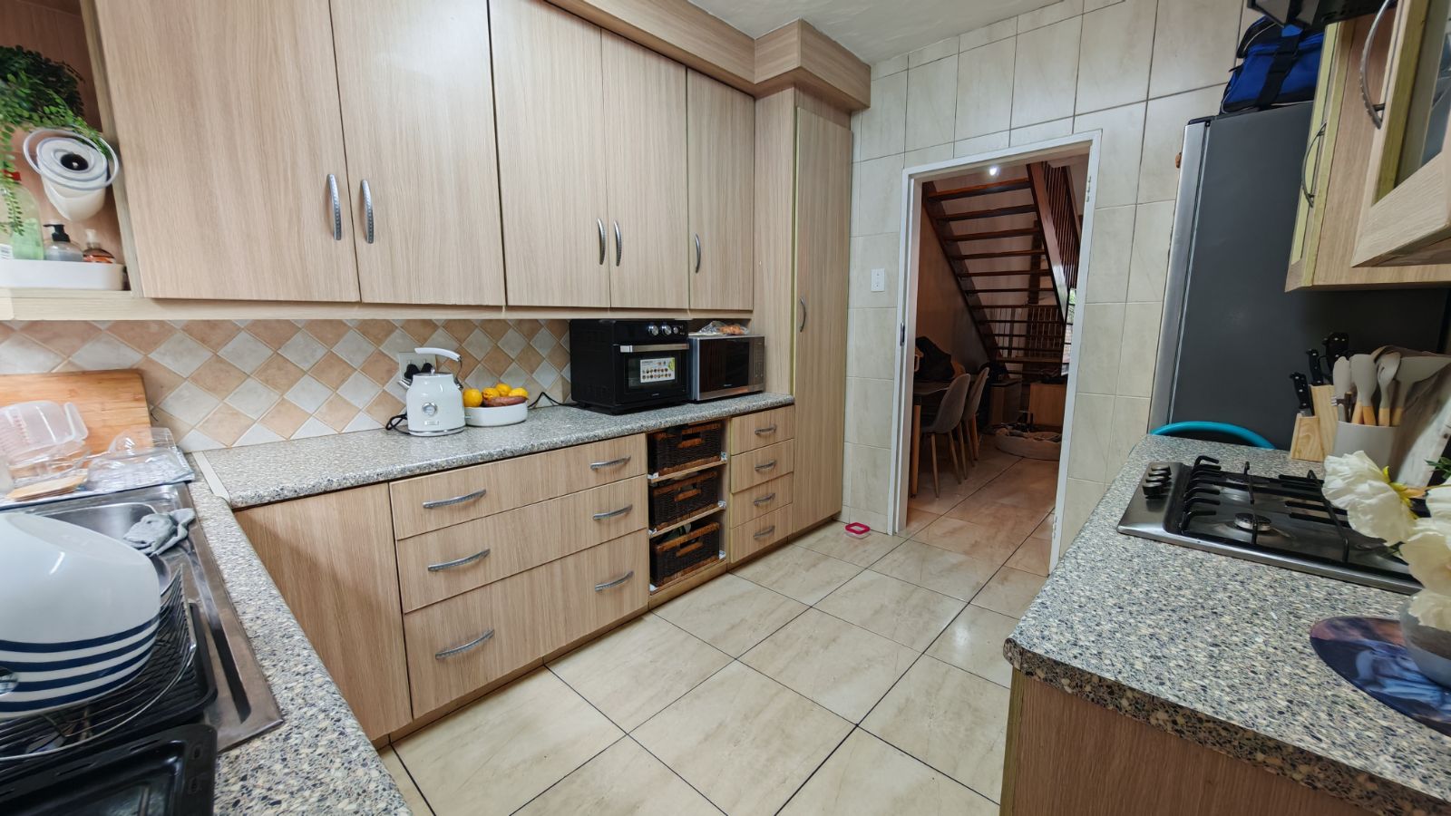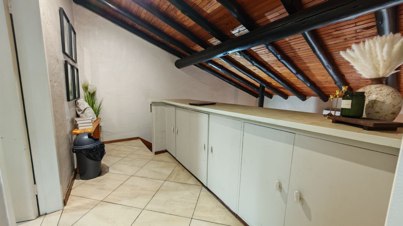 Upstairs, both bedrooms are generously sized, each fitted with ample built-in cupboards. The main bedroom enjoys abundant natural light, while the guest bedroom includes a convenient built-in study space, ideal for remote work or study. The full bathroom is stylishly finished with modern fittings, and additional cupboard space upstairs provides excellent storage solutions.