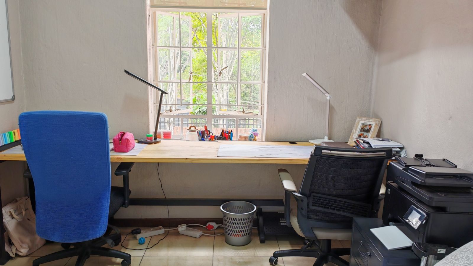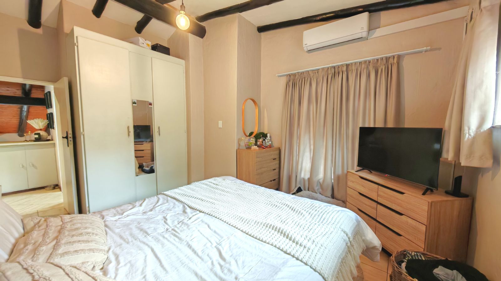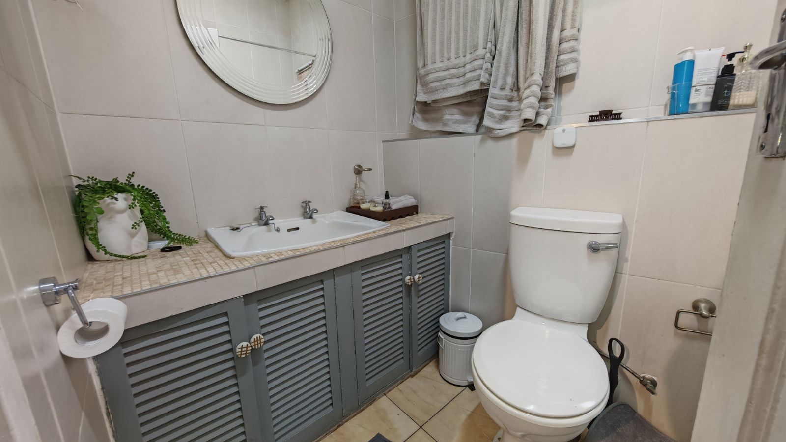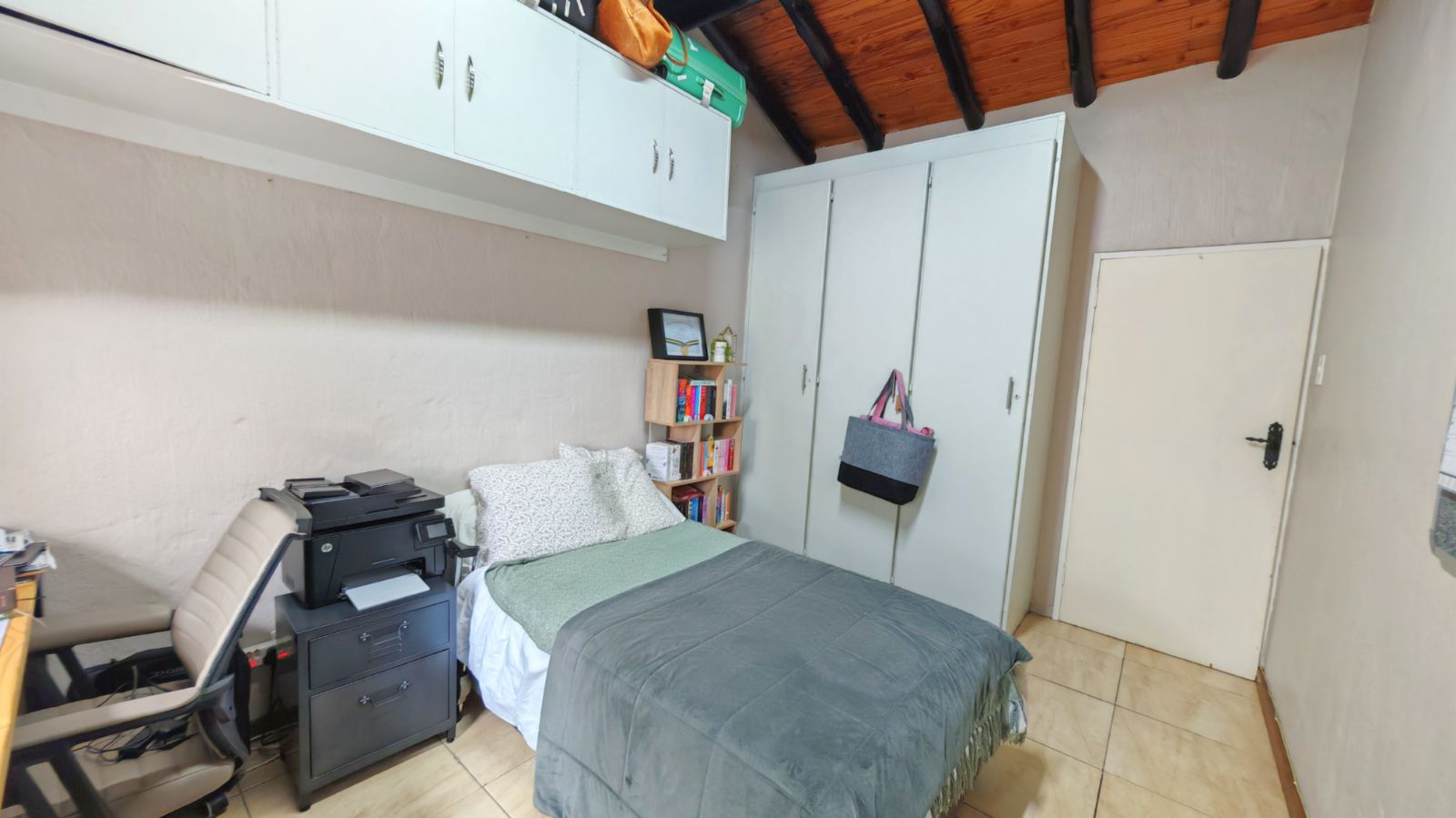 Upstairs, both bedrooms are generously sized, each fitted with ample built-in cupboards. The main bedroom enjoys abundant natural light, while the guest bedroom includes a convenient built-in study space, ideal for remote work or study. The full bathroom is stylishly finished with modern fittings, and additional cupboard space upstairs provides excellent storage solutions.