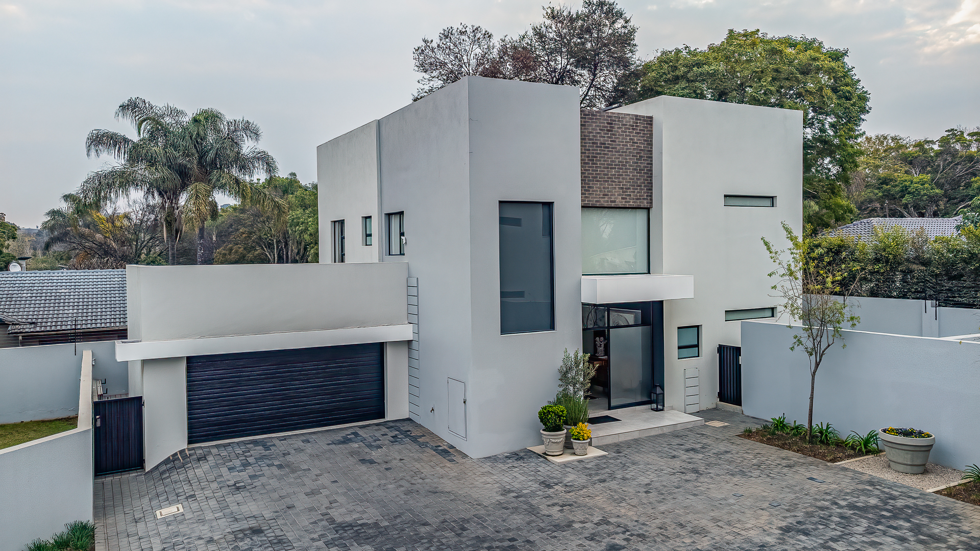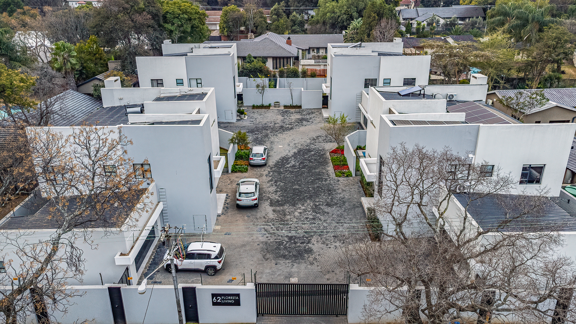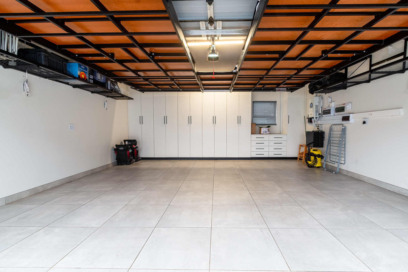 - Two spacious lock-up garages with ample cupboards to keep your garage organized.