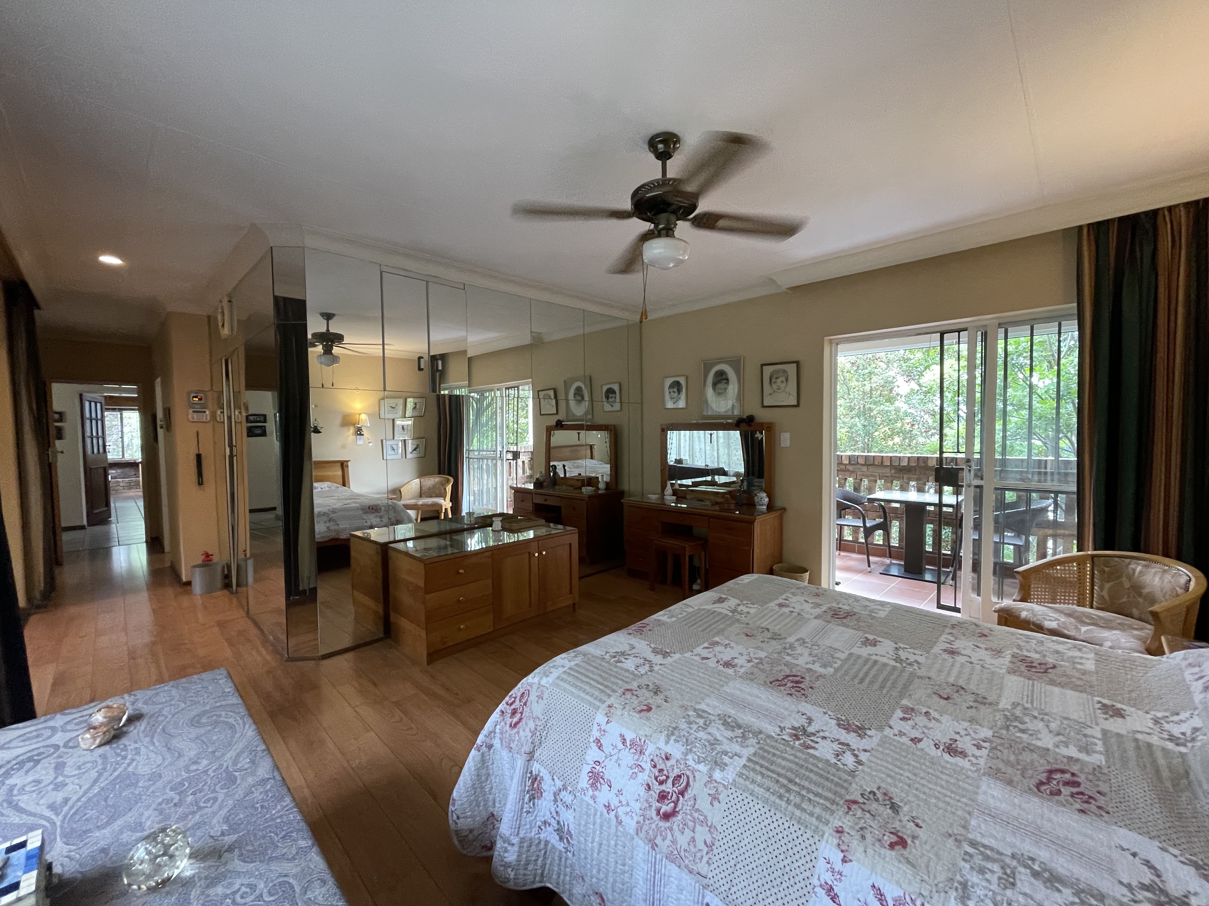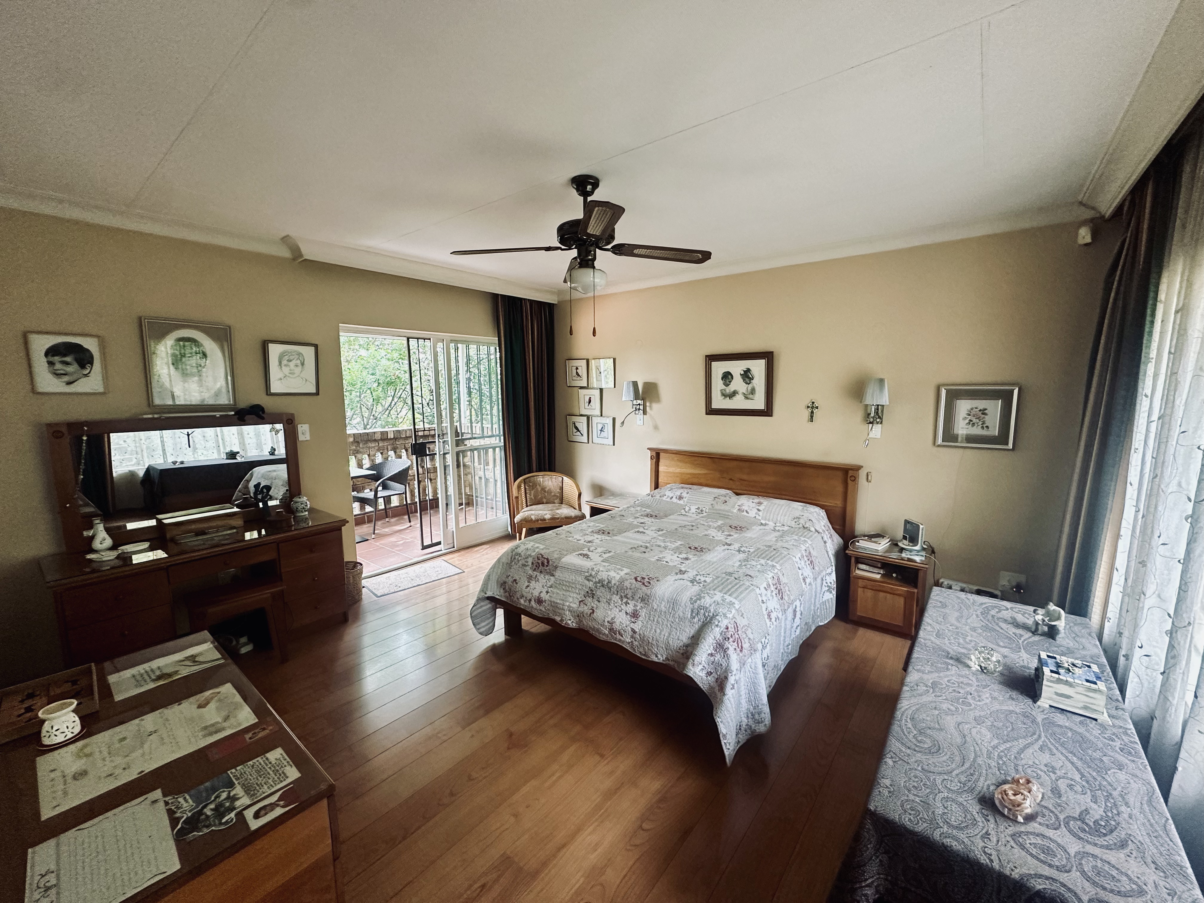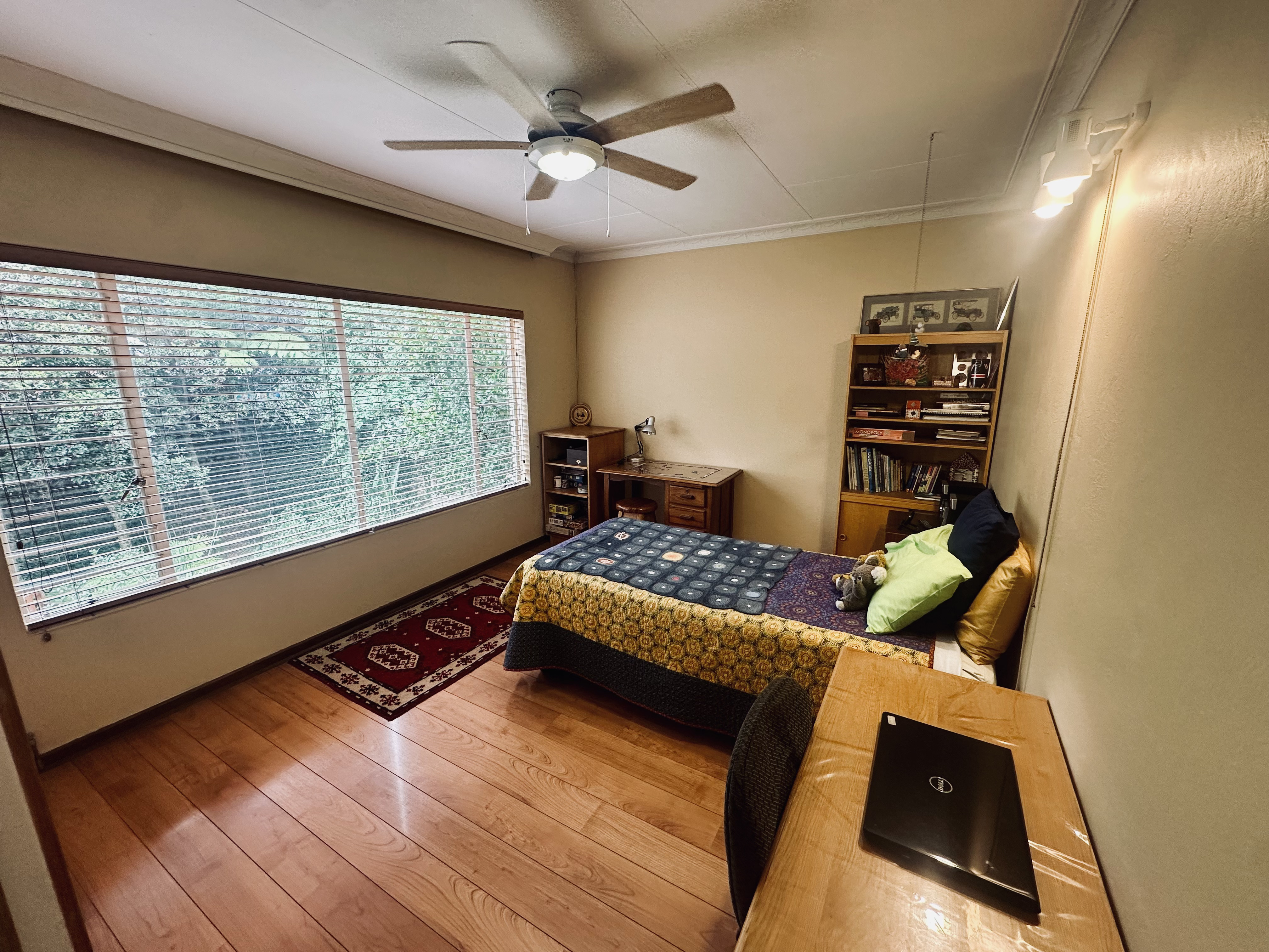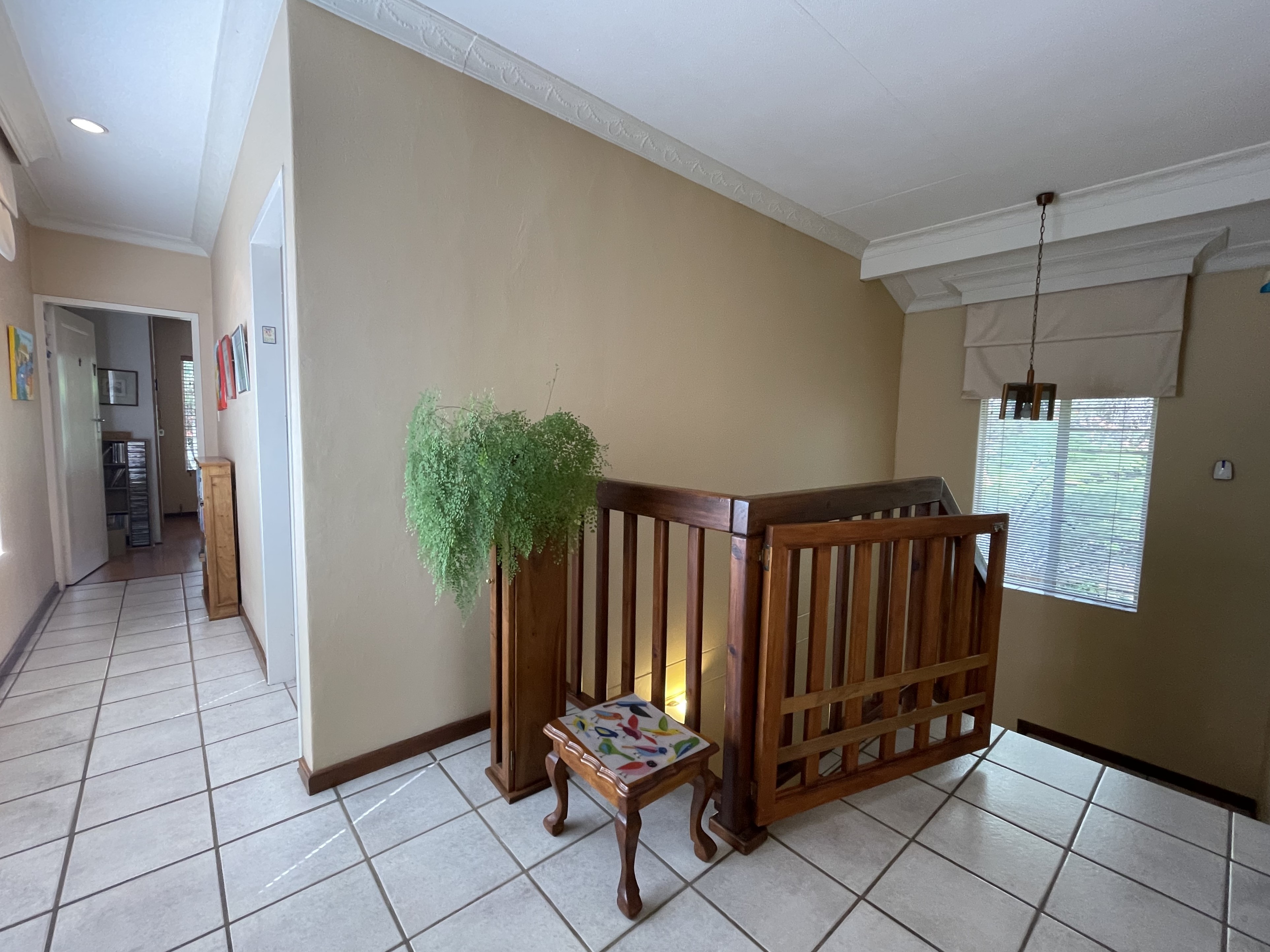 Upstairs, two bedrooms share a well‐appointed bathroom. The master suite offers a private balcony and an en‐suite bathroom — a quiet sanctuary elevated above the treetops. An additional room currently used as a study adds versatility, with exciting potential to transform into a stylish indoor braai or entertainment space.