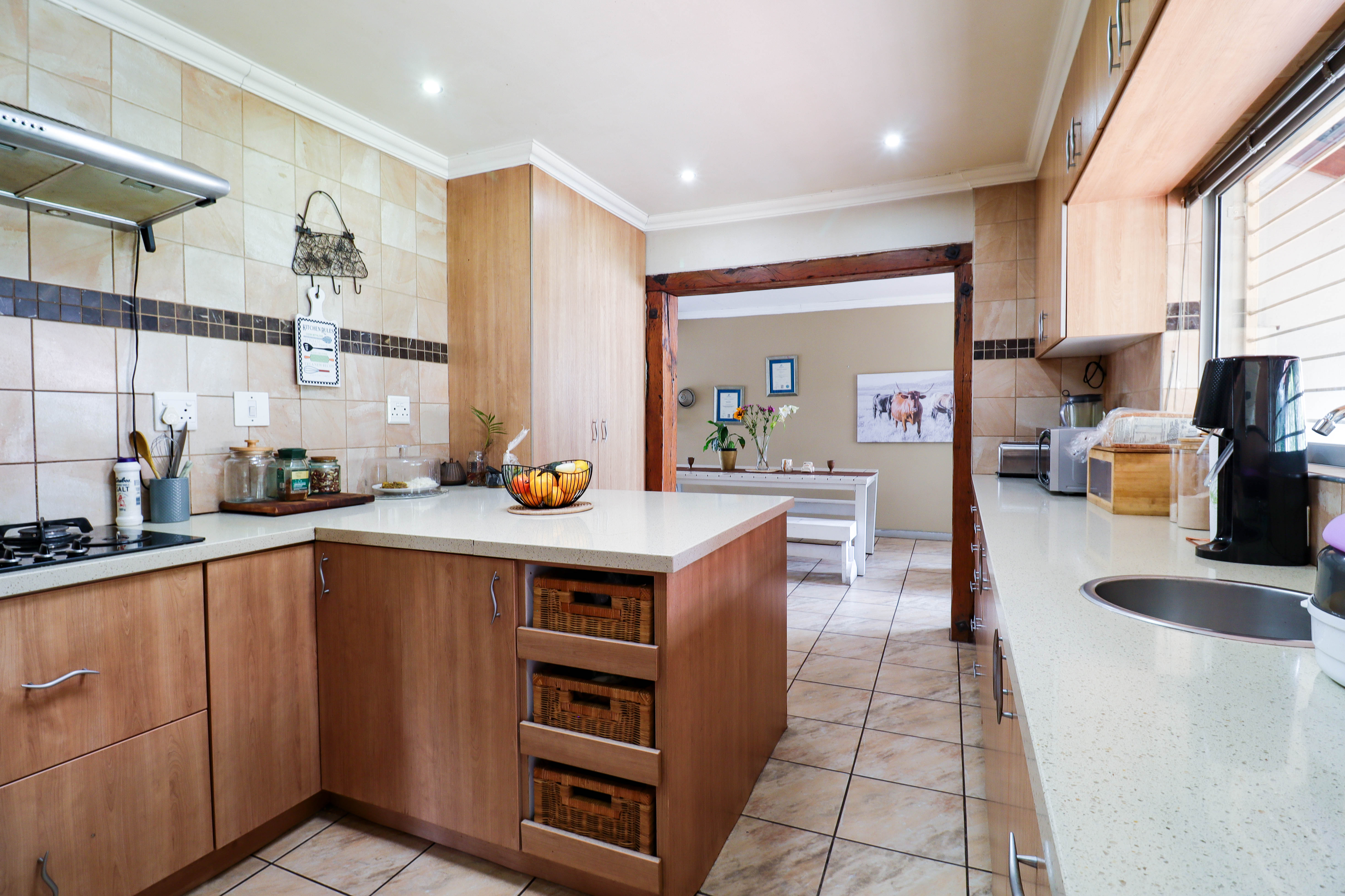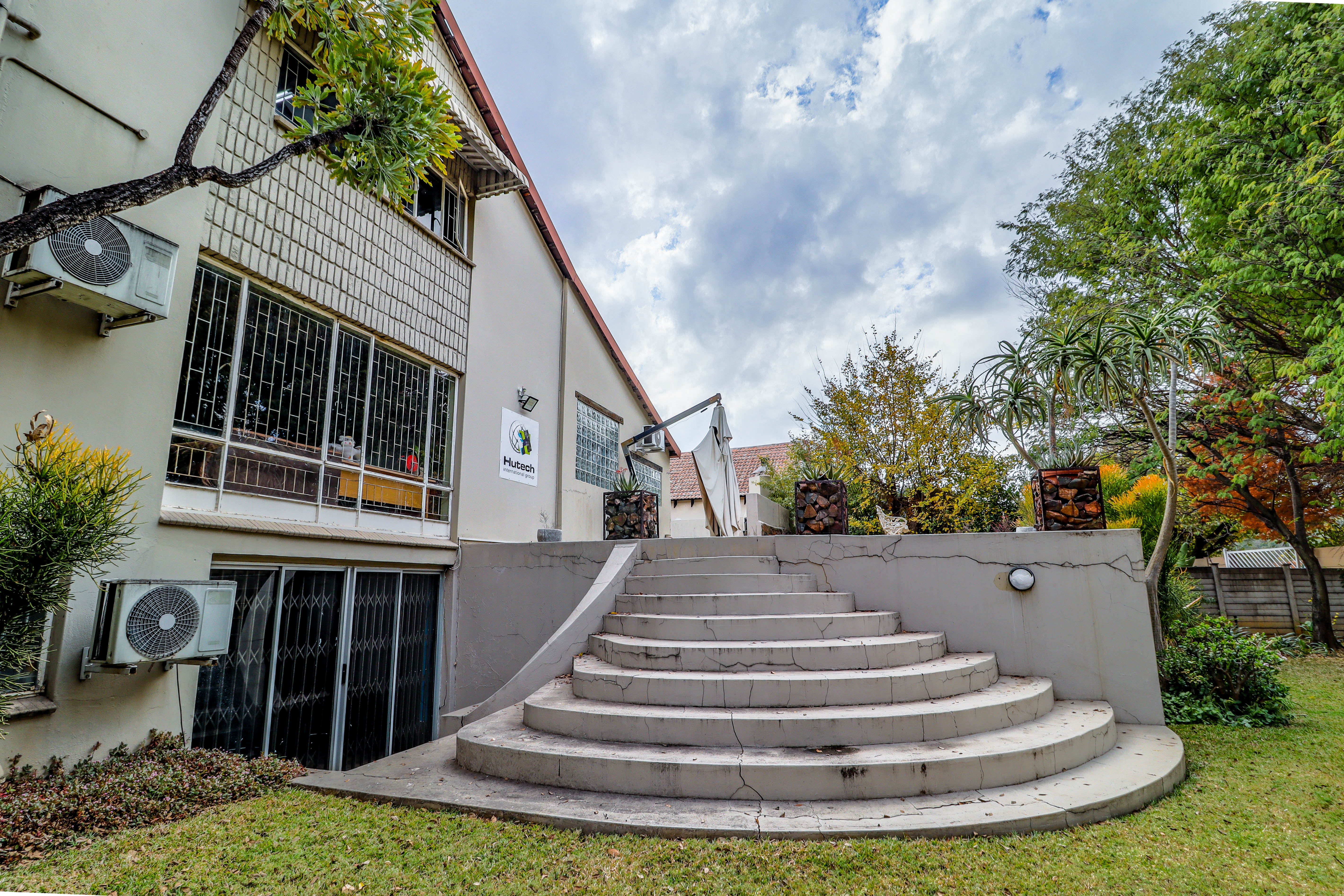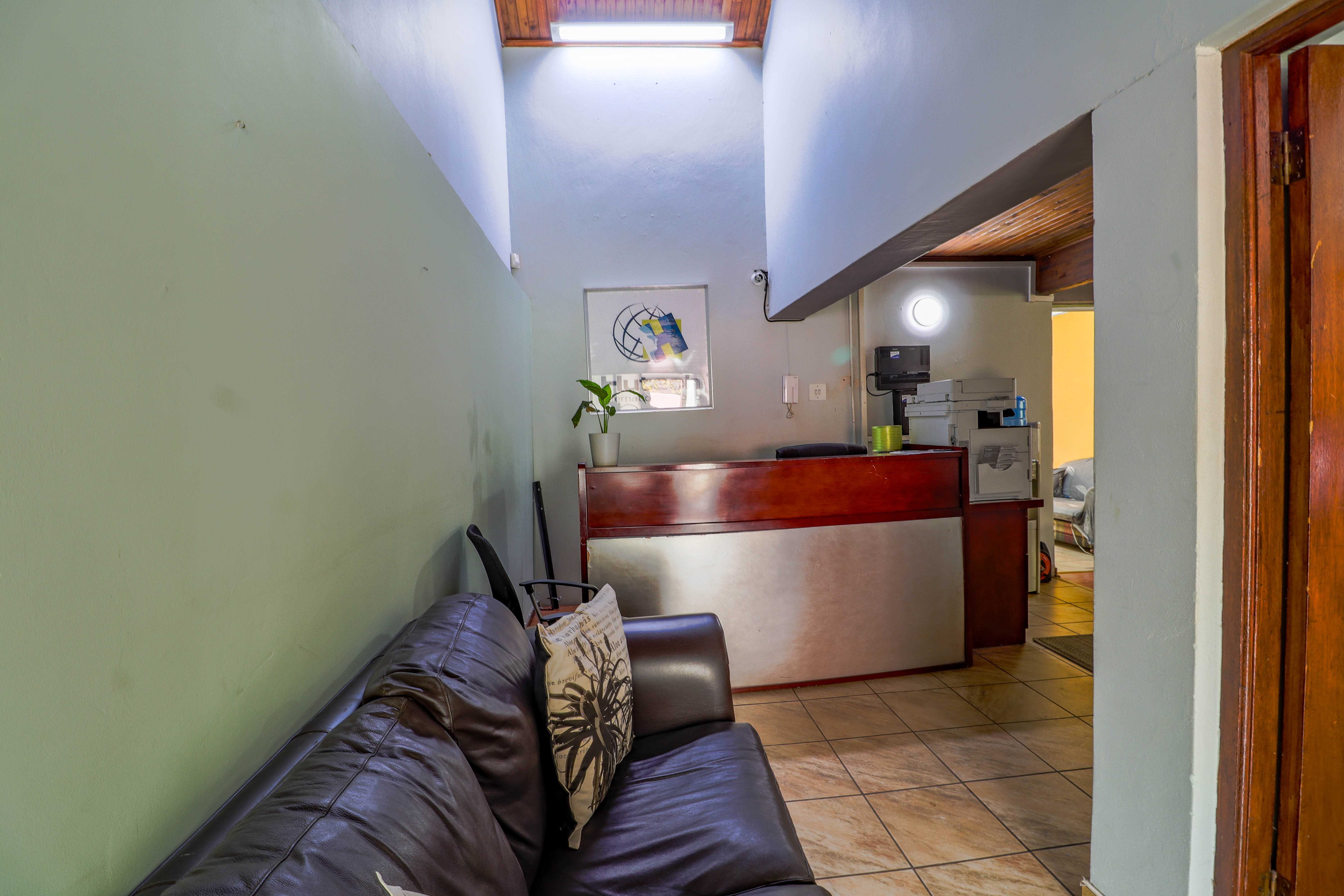 The residential component, also around 200m2, includes three spacious bedrooms, two well-appointed bathrooms, a large lounge and dining area, and a modern kitchen complete with a separate scullery. Additionally, there is a separate laundry room and staff quarters with its own bathroom.