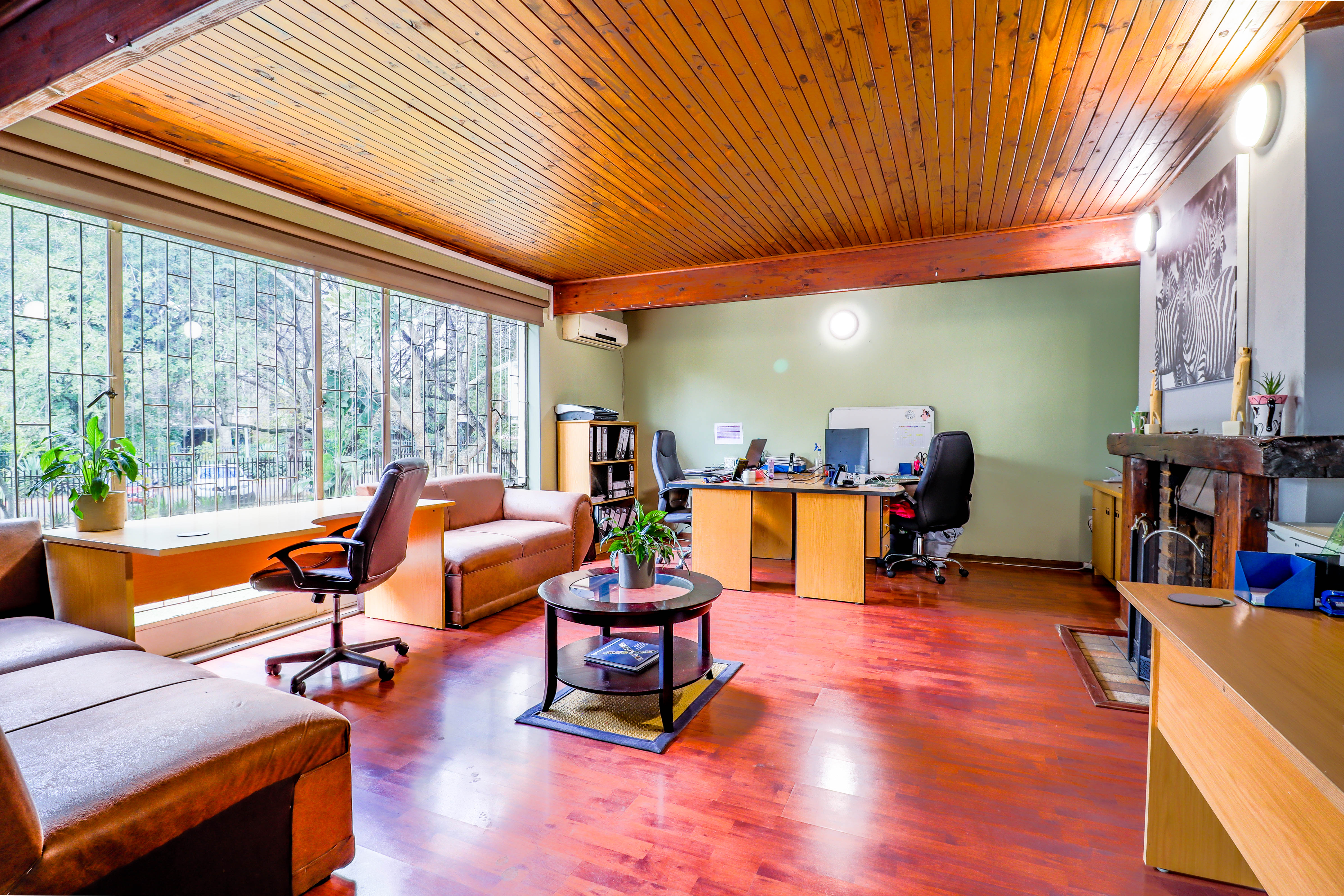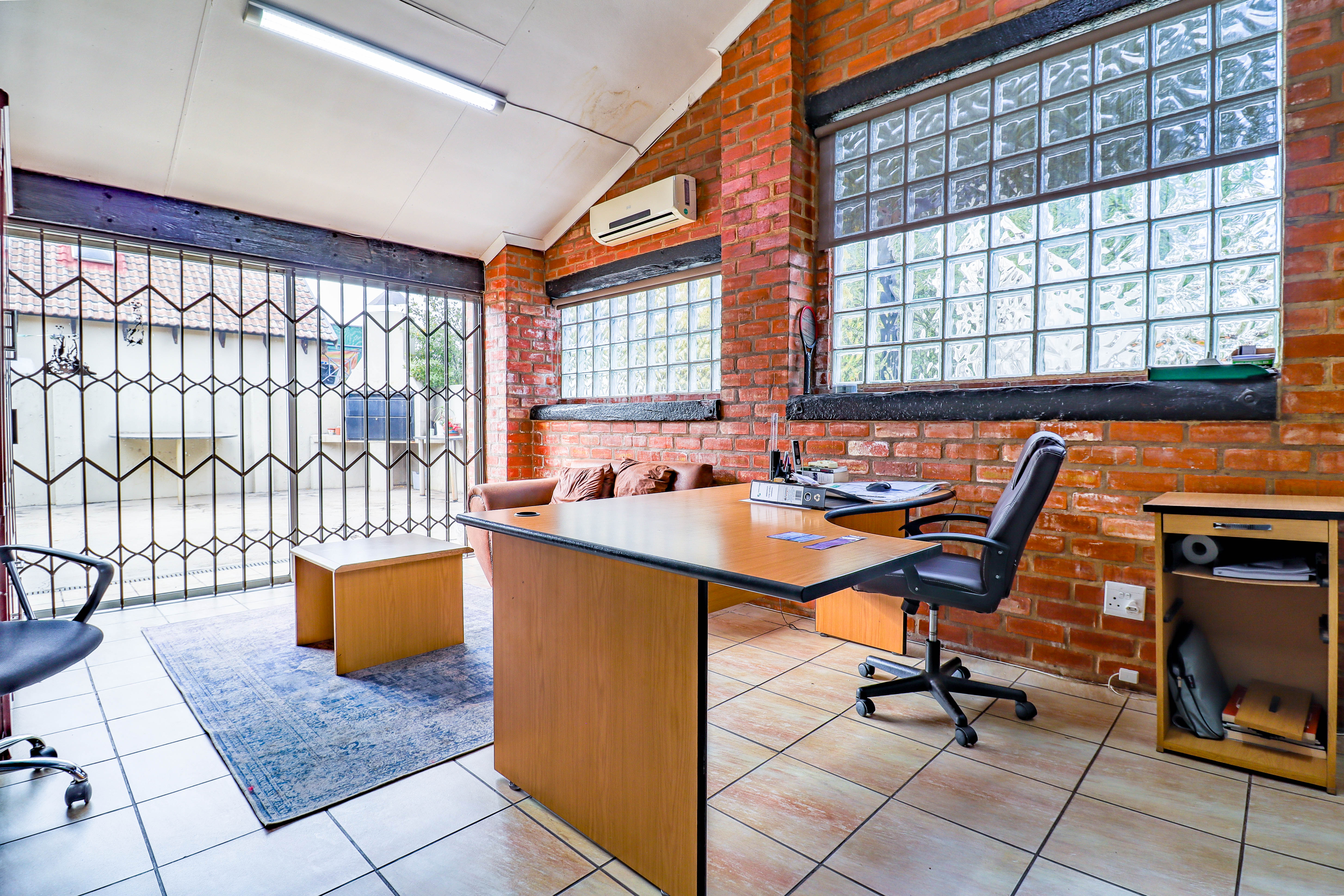 The spacious office area spans approximately 200m2 and features a reception area, a large open office space, two generous private offices, a small upstairs office, an entertainment/boardroom area, dedicated restroom facilities, storage rooms, a kitchenette, and ample covered parking.