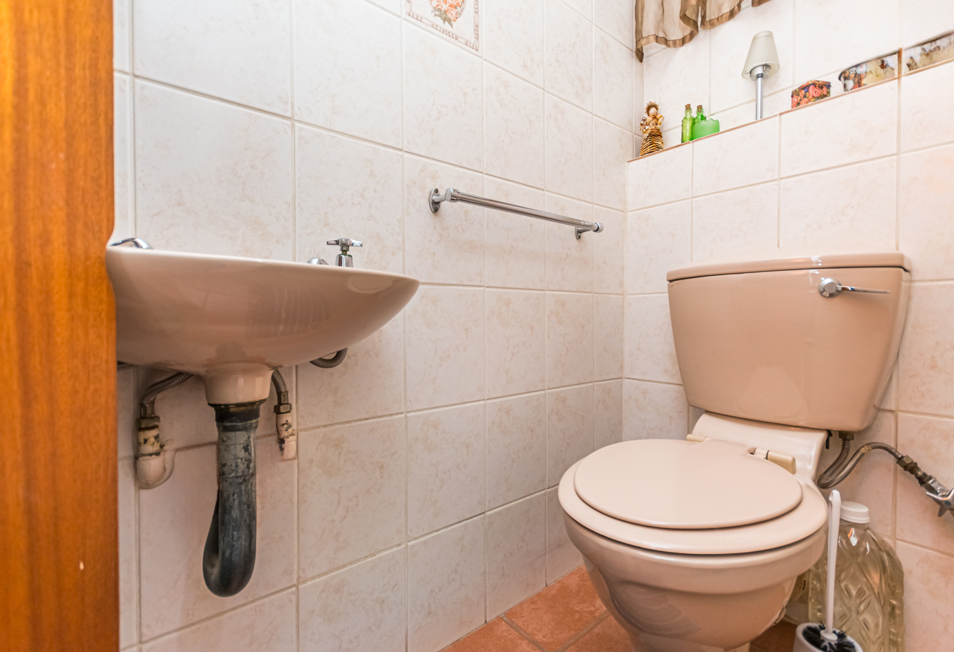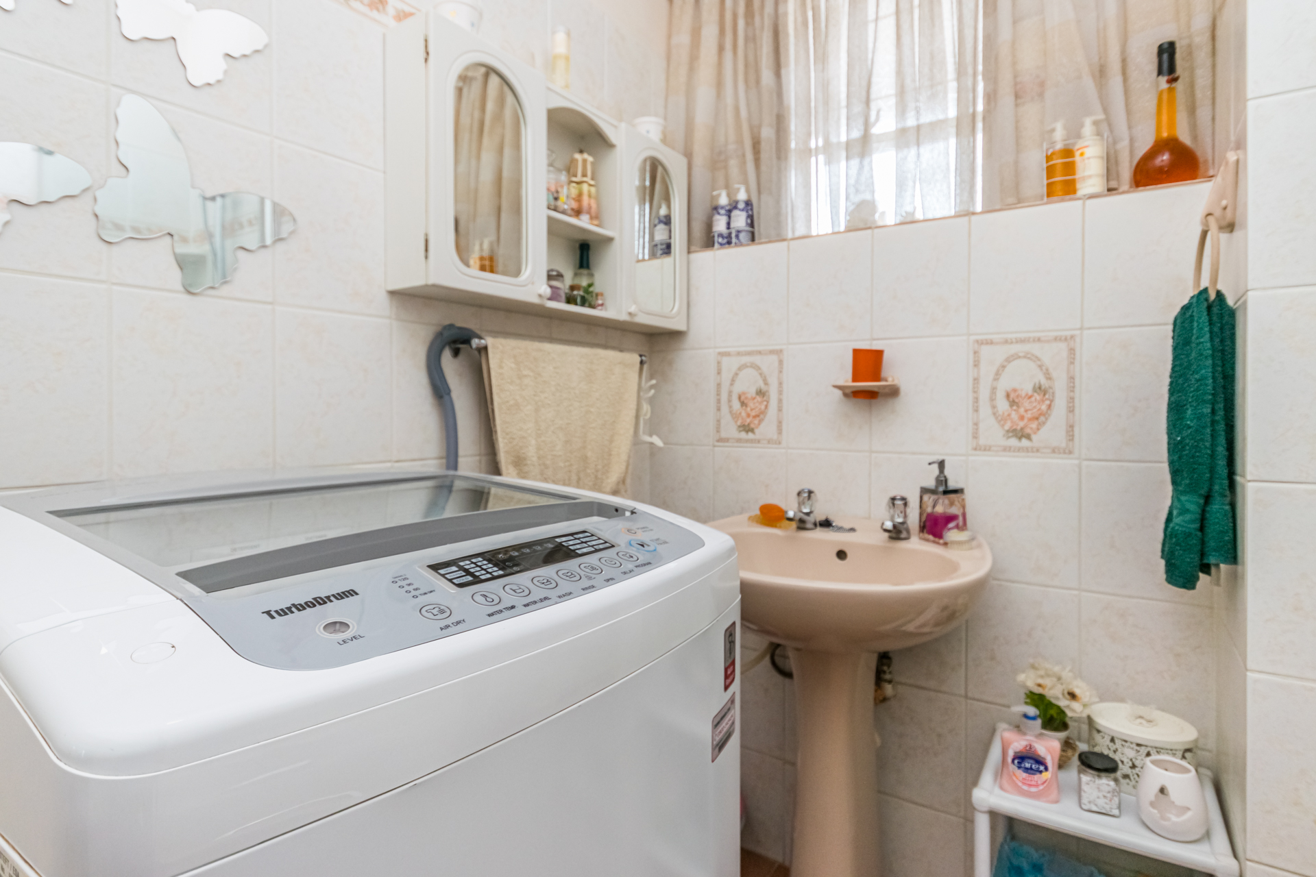 The property features an open-plan dining and living area, filled with natural light thanks to large windows. A lovely balcony adds to the serene atmosphere. The kitchen provides plenty of cupboard space and work areas, and there's a separate guest toilet near the living area. A spacious pantry cupboard is located near the kitchen for groceries or alternatively for linen storage. The apartment includes three bedrooms with built-in cupboards, one bathroom with space for a washing machine, and an additional separate guest toilet for convenience.