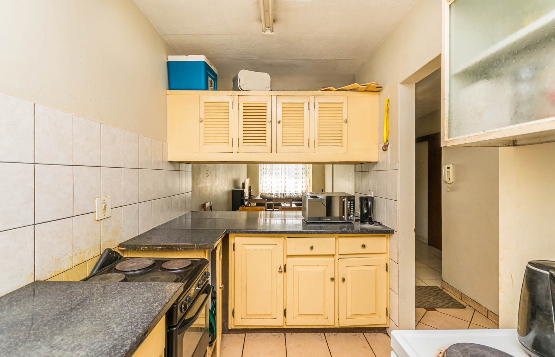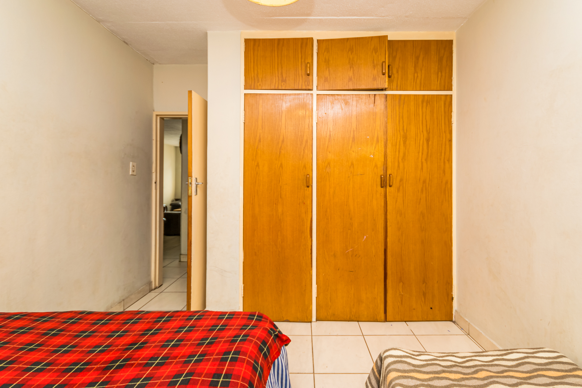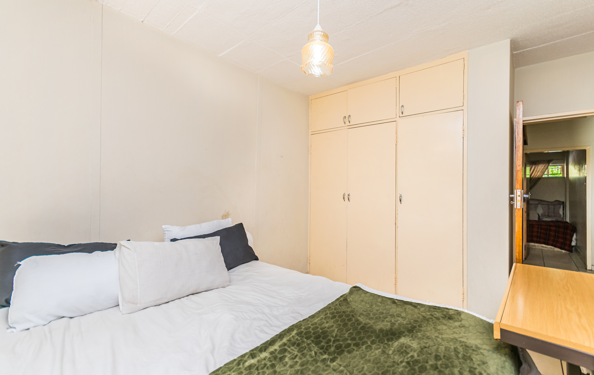 The semi open-plan layout welcomes you into a bright living area and functional kitchen with ample cupboard space, a freestanding stove/oven, and room for one appliance. Both bedrooms are generously sized with built-in cupboards, and the full bathroom conveniently serves both rooms. It also includes a washing machine connection suitable for a top-loader.