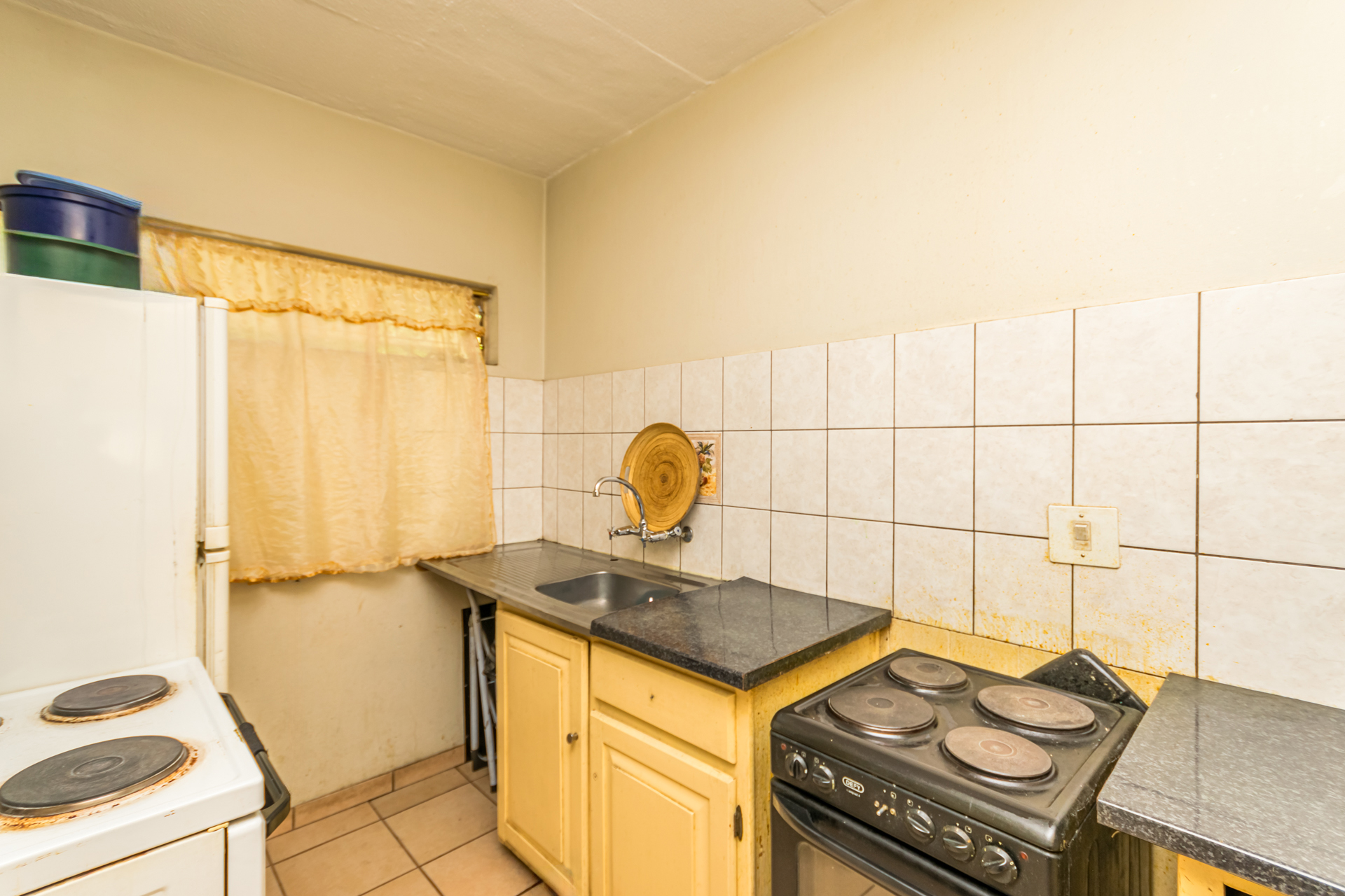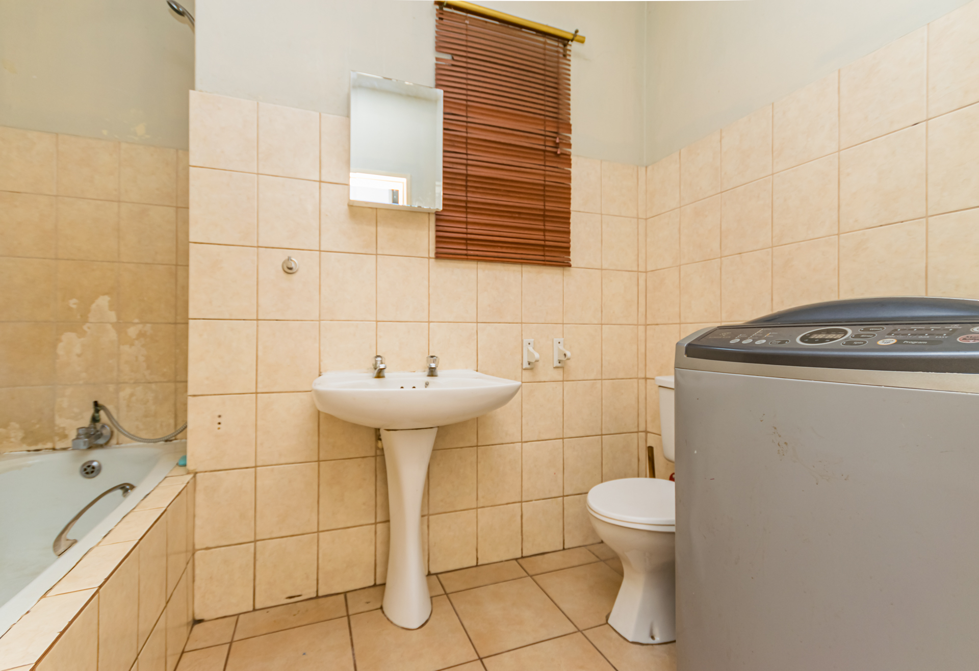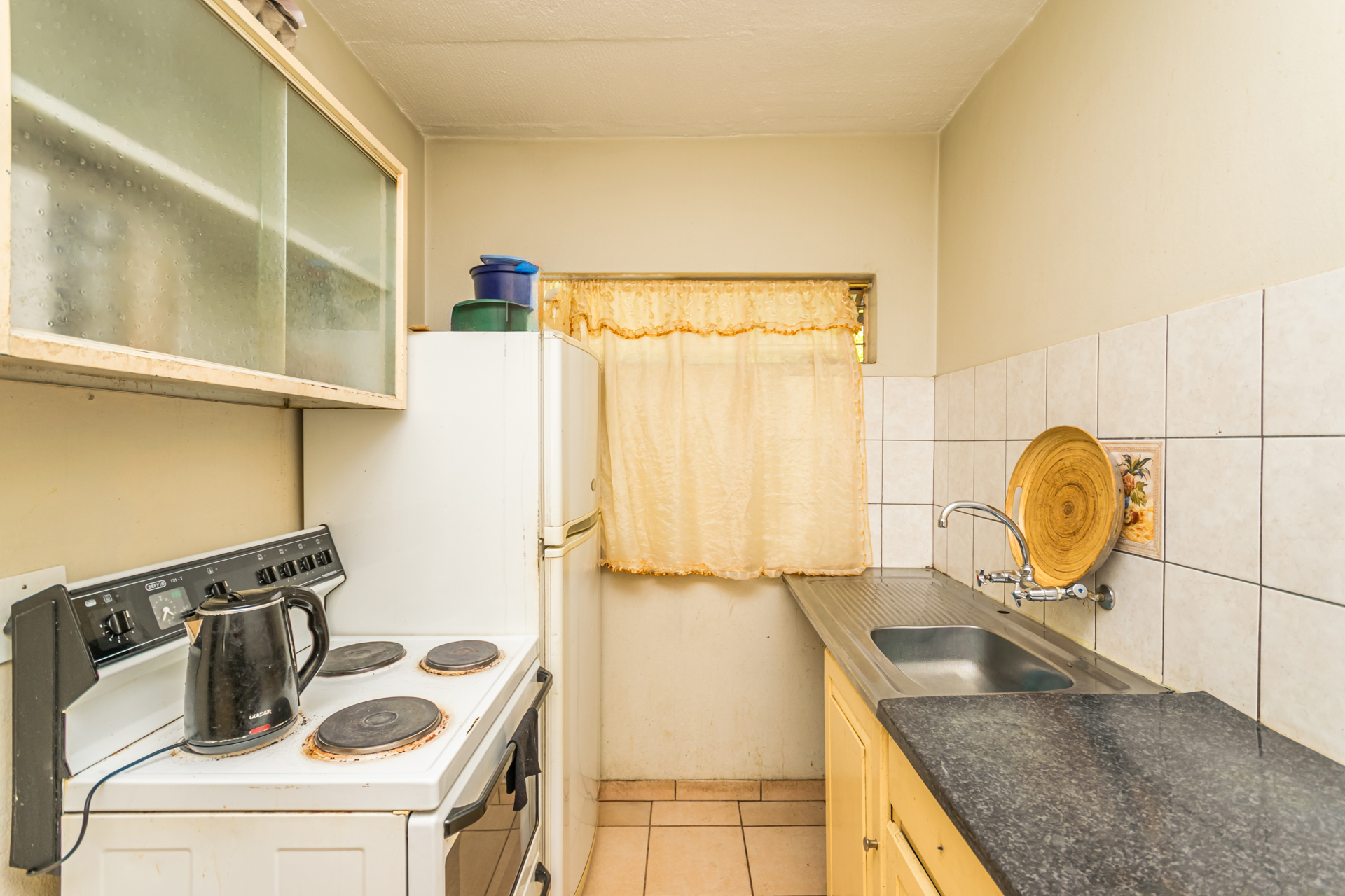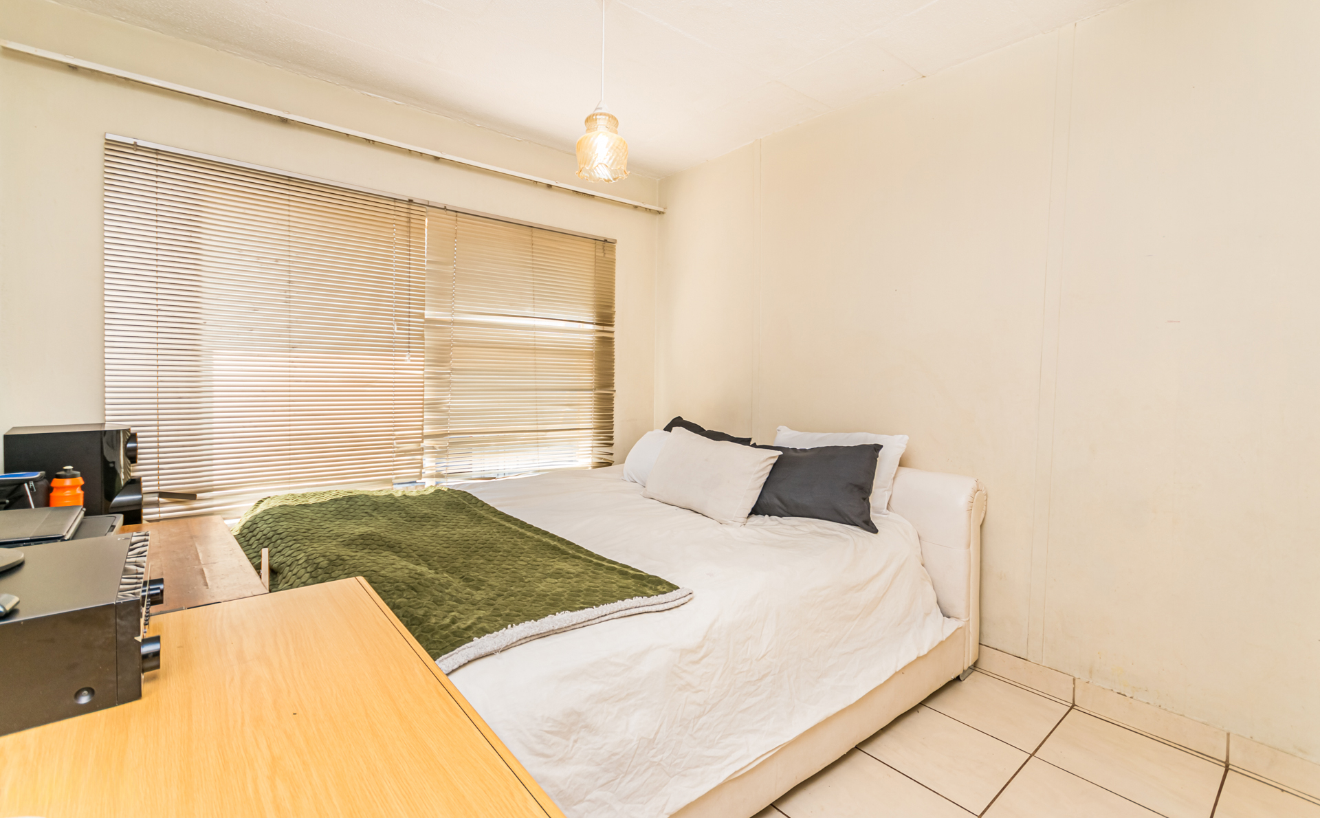 The semi open-plan layout welcomes you into a bright living area and functional kitchen with ample cupboard space, a freestanding stove/oven, and room for one appliance. Both bedrooms are generously sized with built-in cupboards, and the full bathroom conveniently serves both rooms. It also includes a washing machine connection suitable for a top-loader.