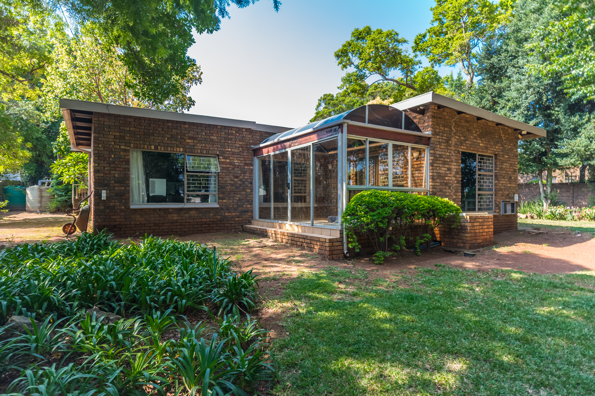 The beautifully maintained garden wraps around the home and offers a peaceful outdoor escape, enhanced by an automated sprinkler system, two water tanks, and a Wendy house with electricity.