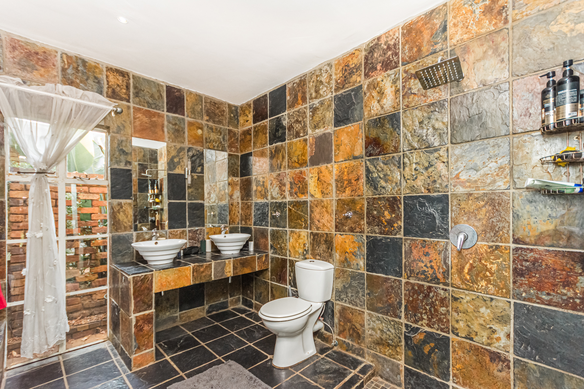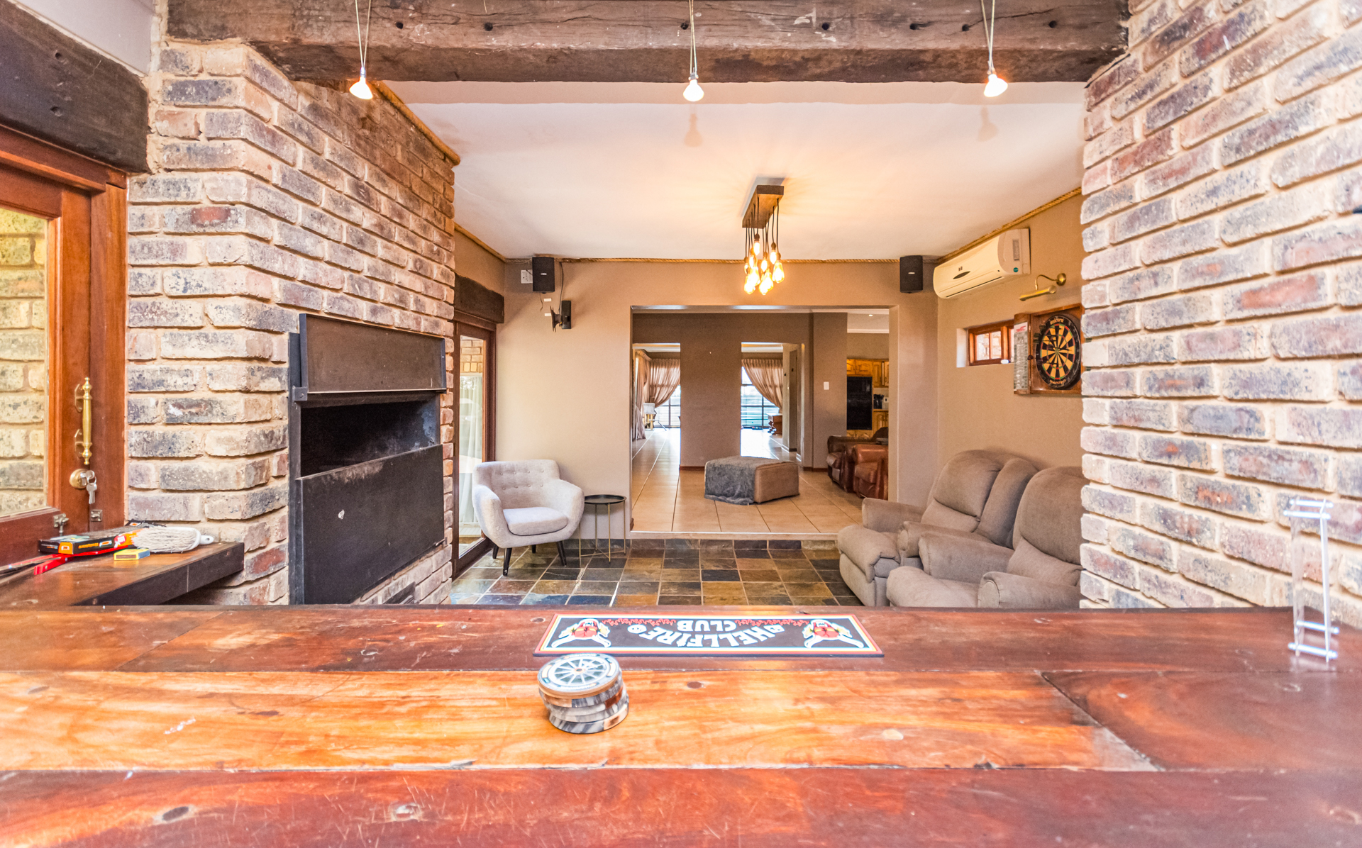 From the moment you enter, you are welcomed by a charming foyer that flows effortlessly into a generous open-plan living and dining area designed for easy living and relaxed entertaining. The space offers two comfortable living areas, one with a fireplace that warms up the entire open plan, plus another area featuring as a entertainment space with a built-in braai, aircon and bar, as well as a conveniently placed guest toilet. From here, wooden stack doors and wooden stack windows open onto a superb entertainment area and wooden deck, complete with a large table and ambient lighting, all included in the sale. Here you’ll also find a pizza oven, an outdoor built-in braai, and a boma — the perfect setting for hosting friends and creating unforgettable memories.