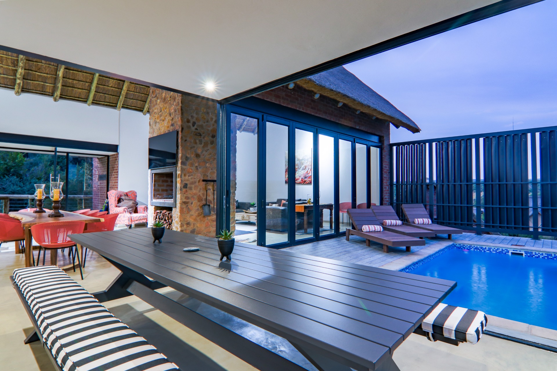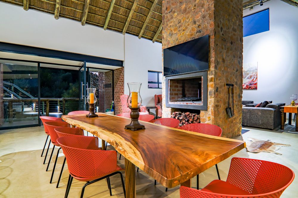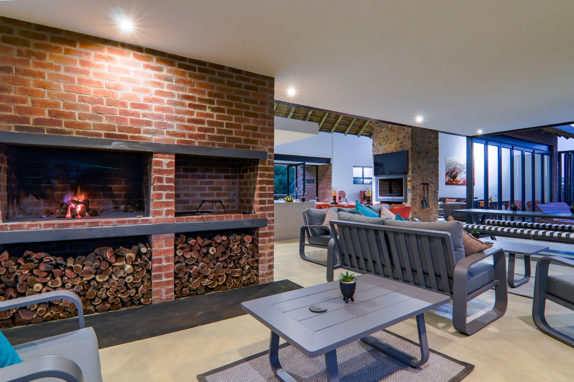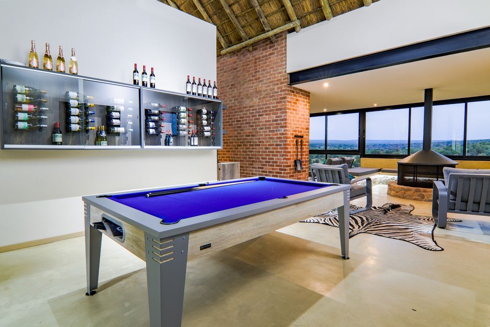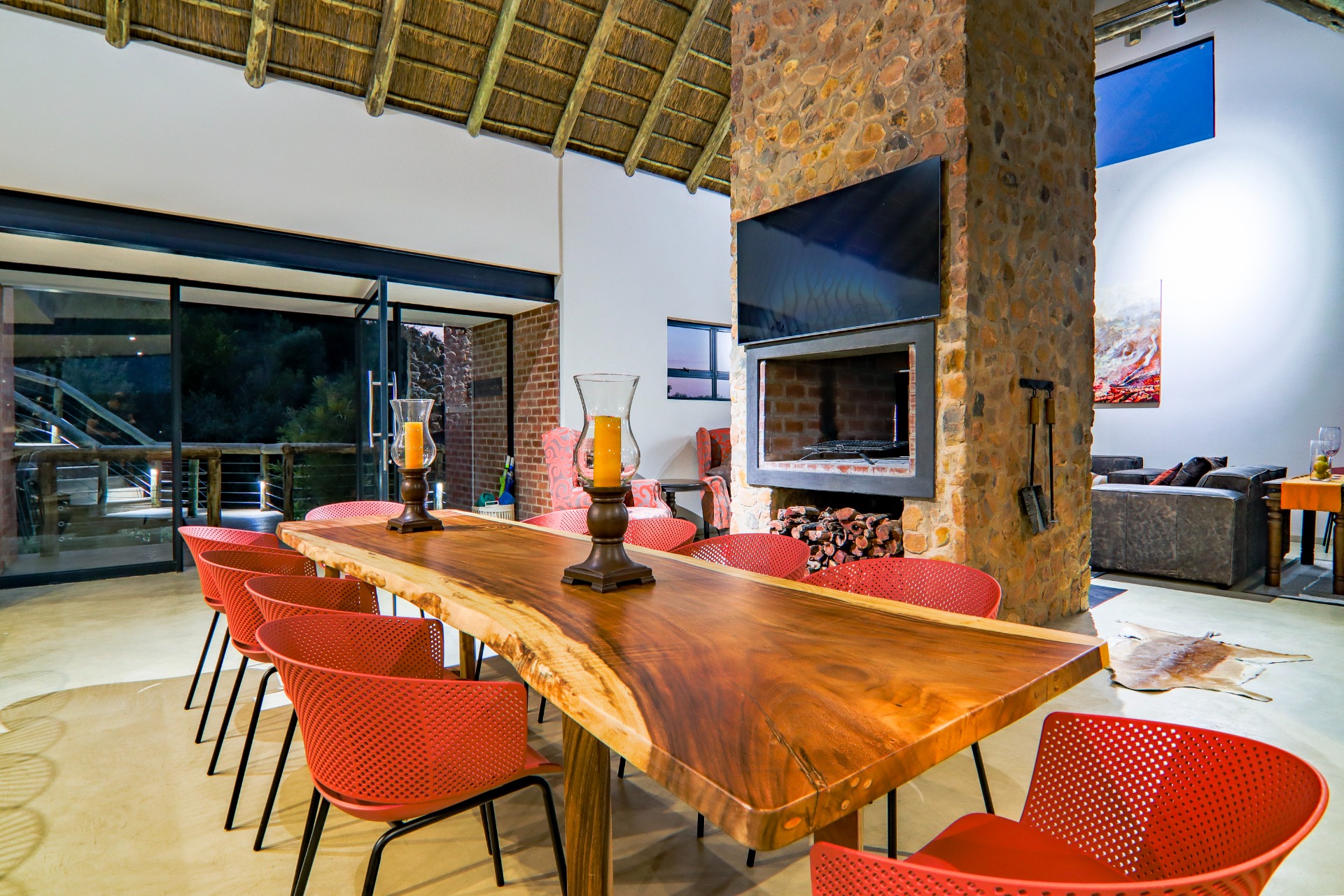 Exceptionally well-appointed lodge. The extra-large main entertainment area has wall to wall windows with stunning views and consists of a large open plan area with catering kitchen (There is also a larger separate well fitted commercial kitchen) Snack Bar, Dining area, Built in Braai, Additional fireplace, Games and Lounge Areas. Stacking doors open to patio with swimming pool.