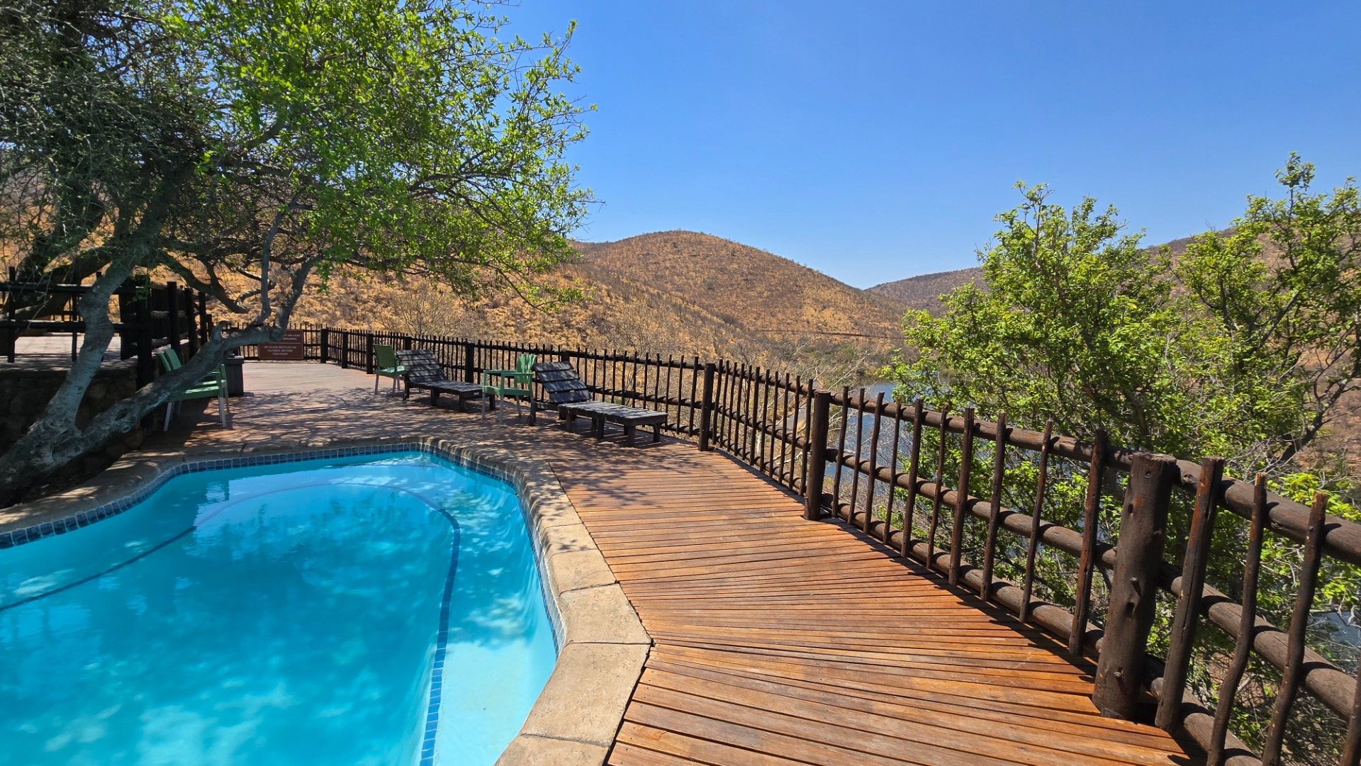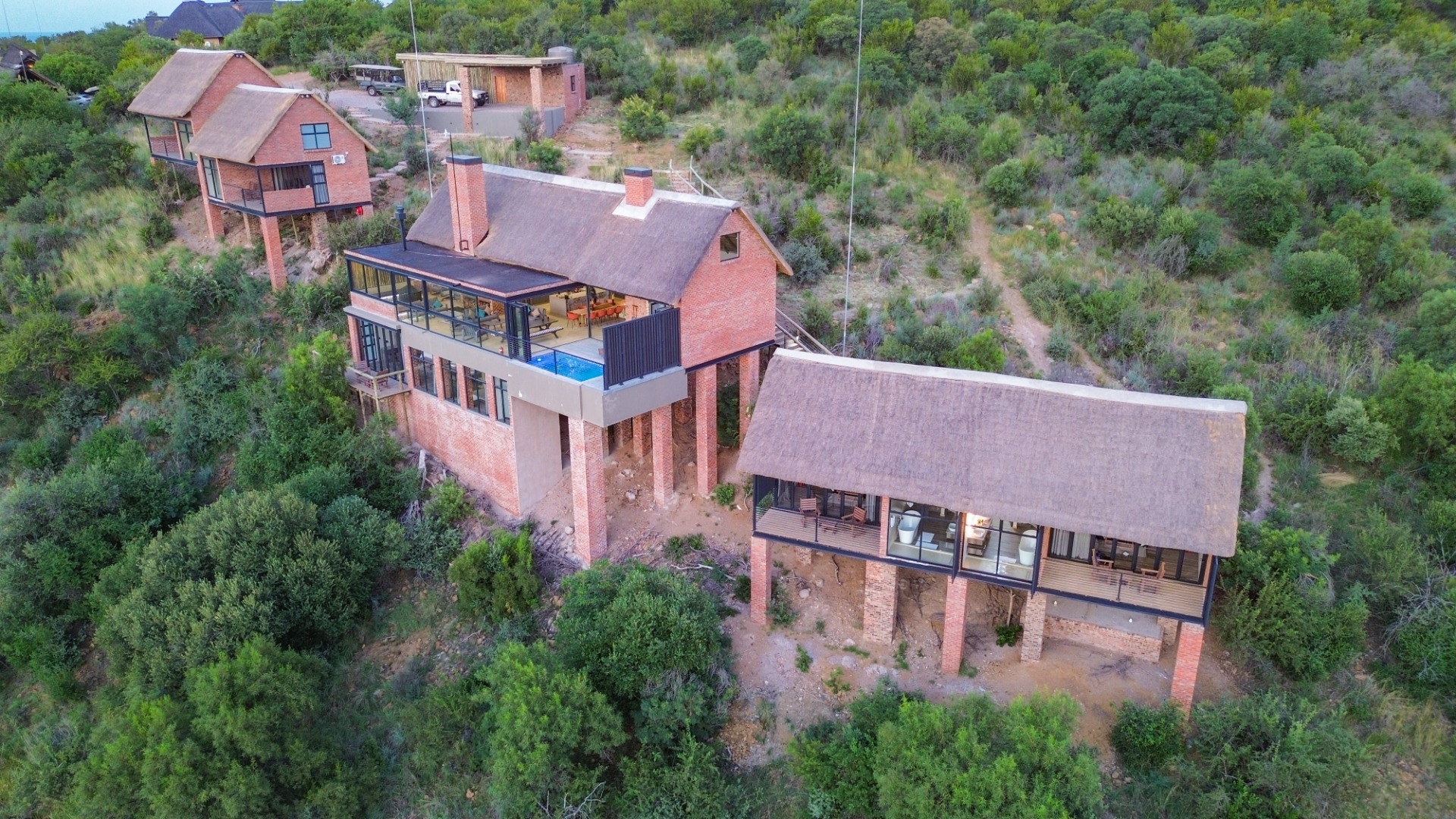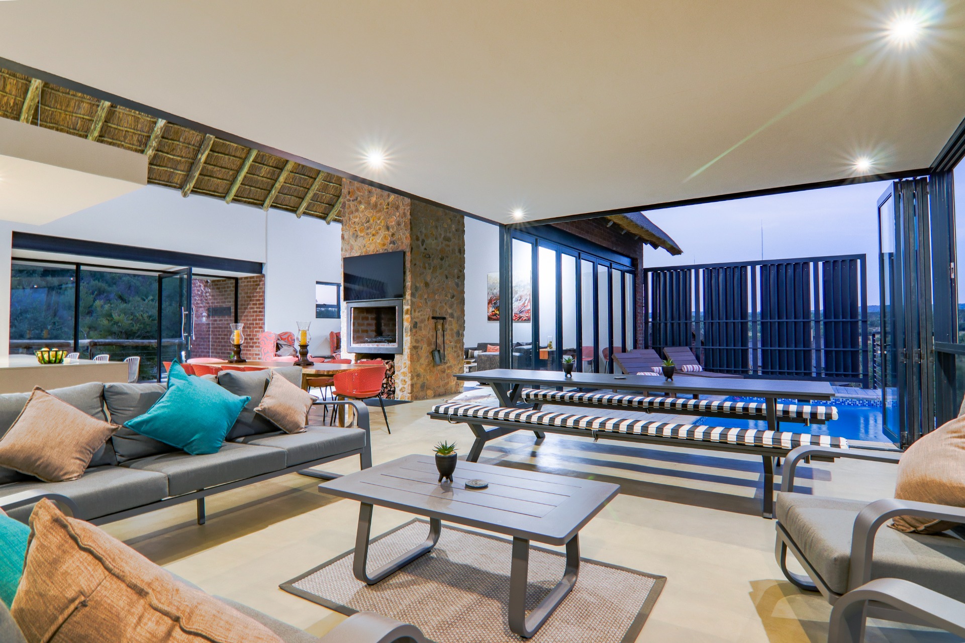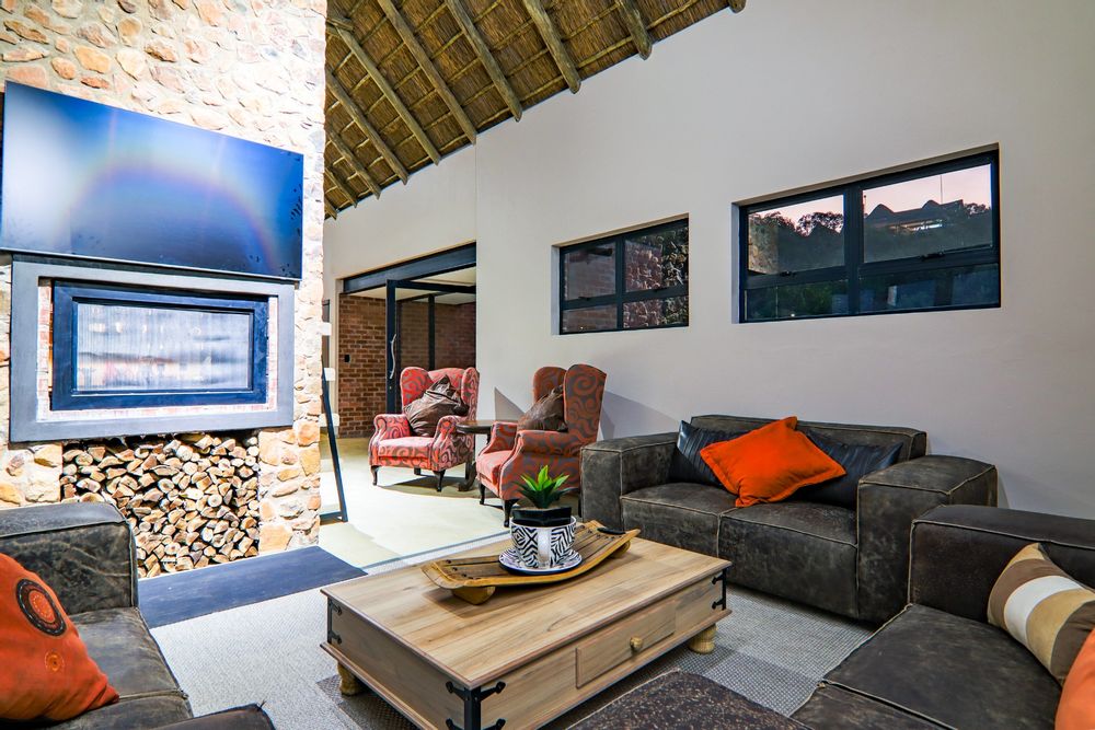 Exceptionally well-appointed lodge. The extra-large main entertainment area has wall to wall windows with stunning views and consists of a large open plan area with catering kitchen (There is also a larger separate well fitted commercial kitchen) Snack Bar, Dining area, Built in Braai, Additional fireplace, Games and Lounge Areas. Stacking doors open to patio with swimming pool.