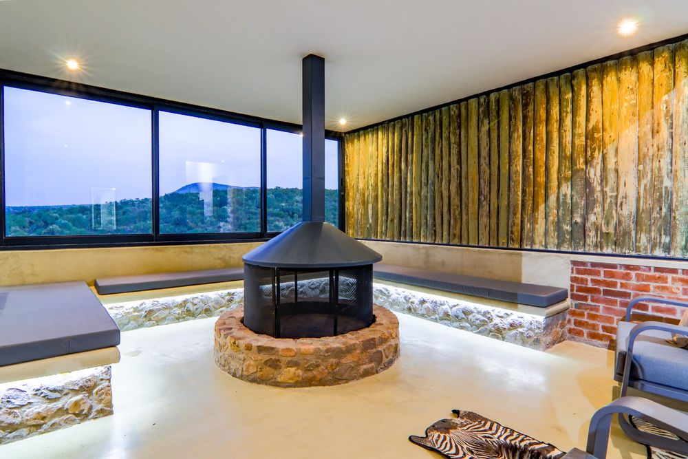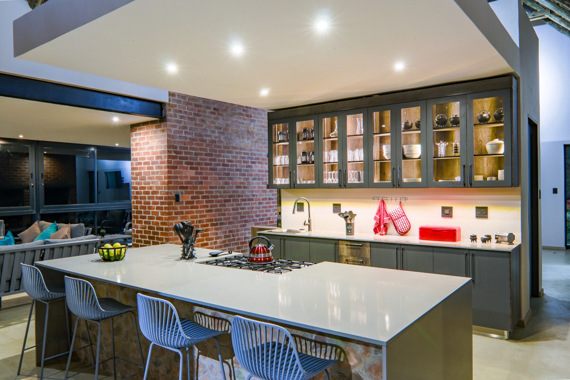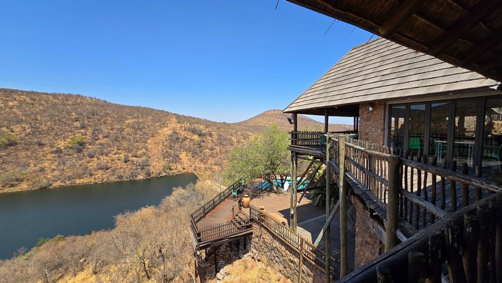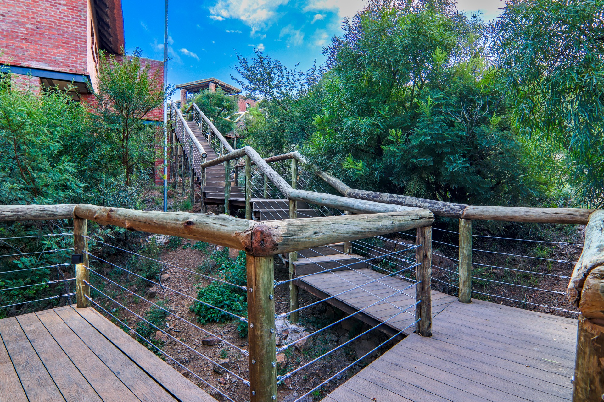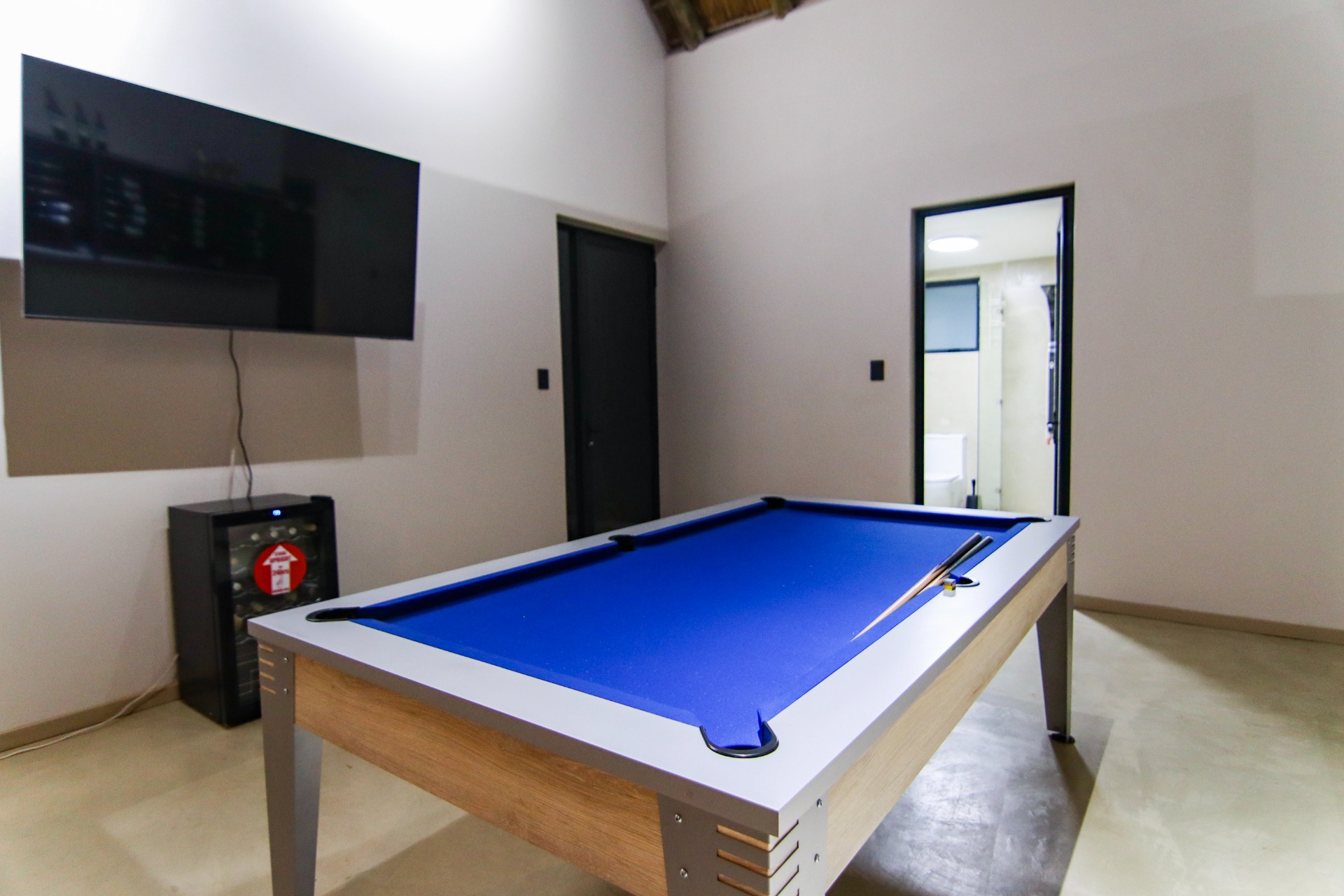 Exceptionally well-appointed lodge. The extra-large main entertainment area has wall to wall windows with stunning views and consists of a large open plan area with catering kitchen (There is also a larger separate well fitted commercial kitchen) Snack Bar, Dining area, Built in Braai, Additional fireplace, Games and Lounge Areas. Stacking doors open to patio with swimming pool.