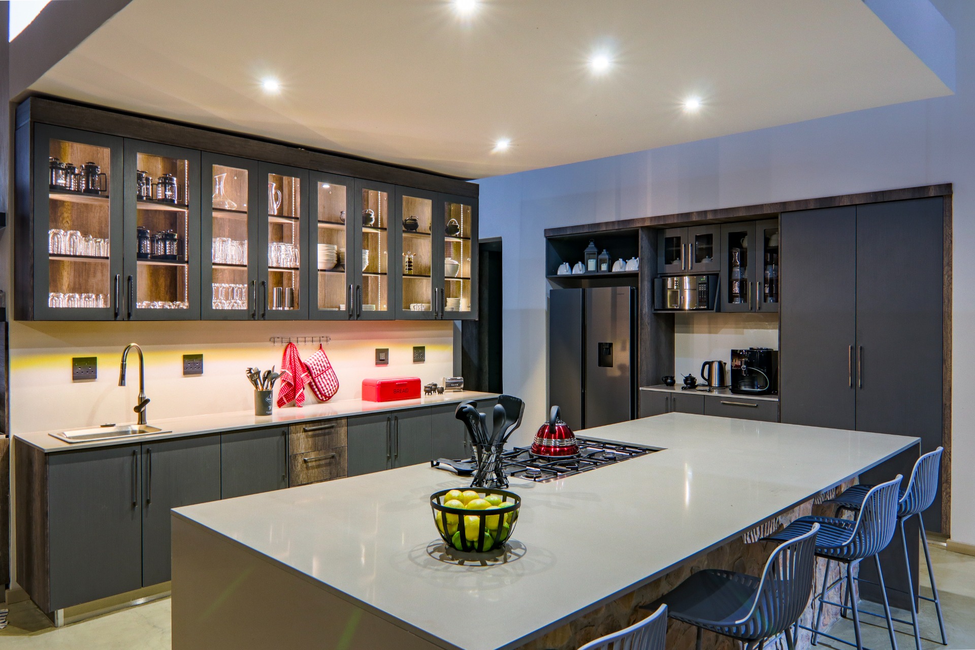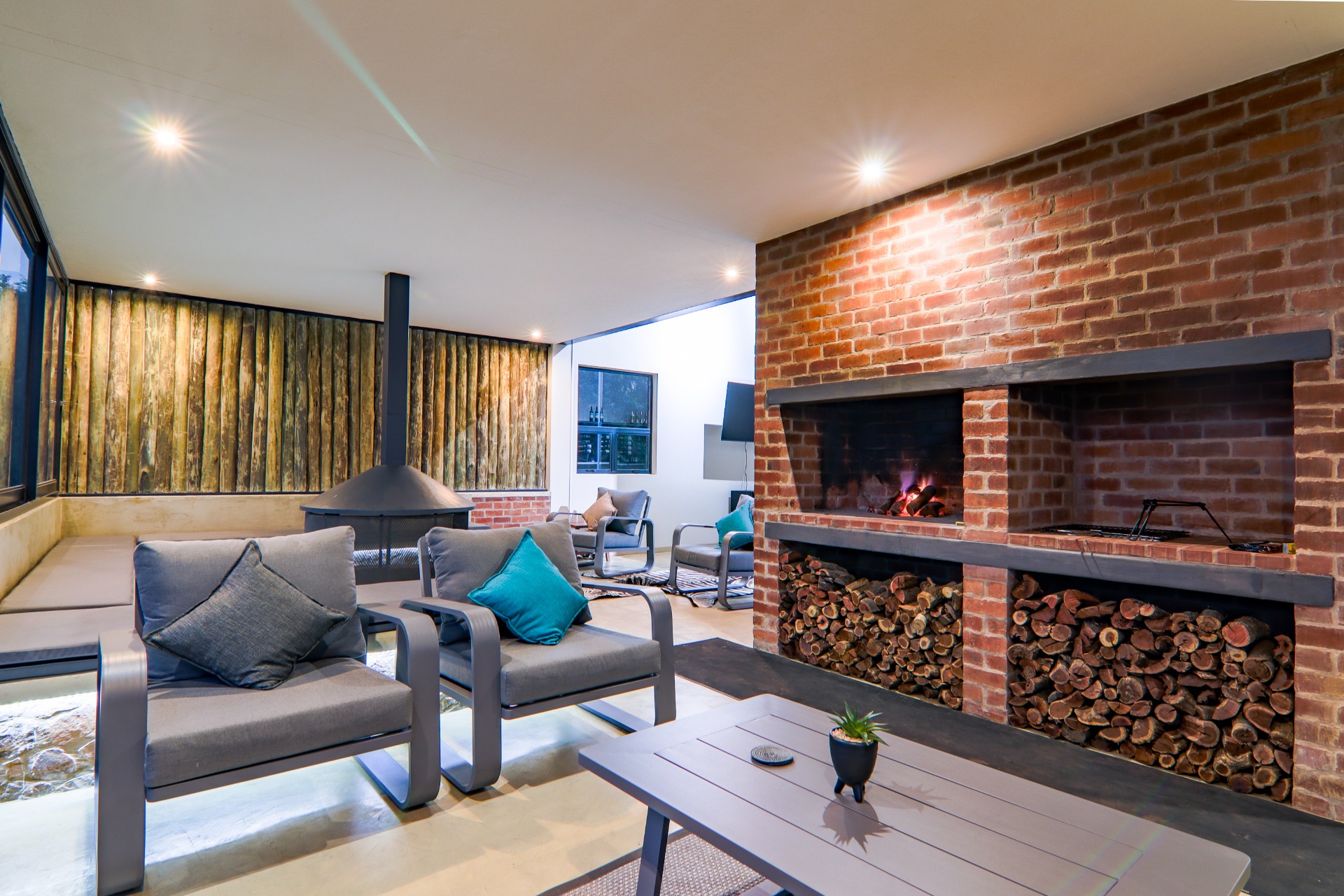 The lodge consists of 4 separate structures, the main one in the middle houses the entertainment area and one of the bedrooms. The two next door on either side accommodate two bedrooms each. The fourth structure houses the large double garage with storeroom and staff quarters with additional parking in front of the garage.